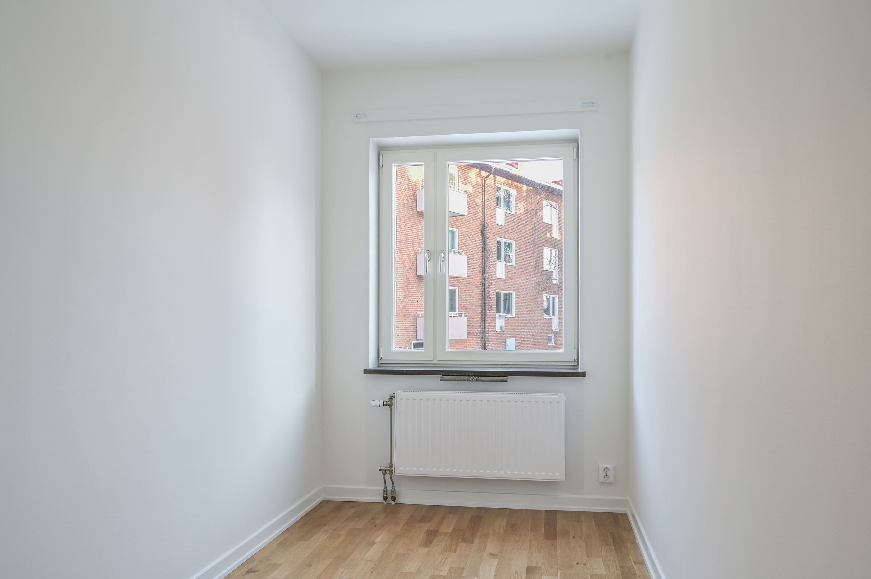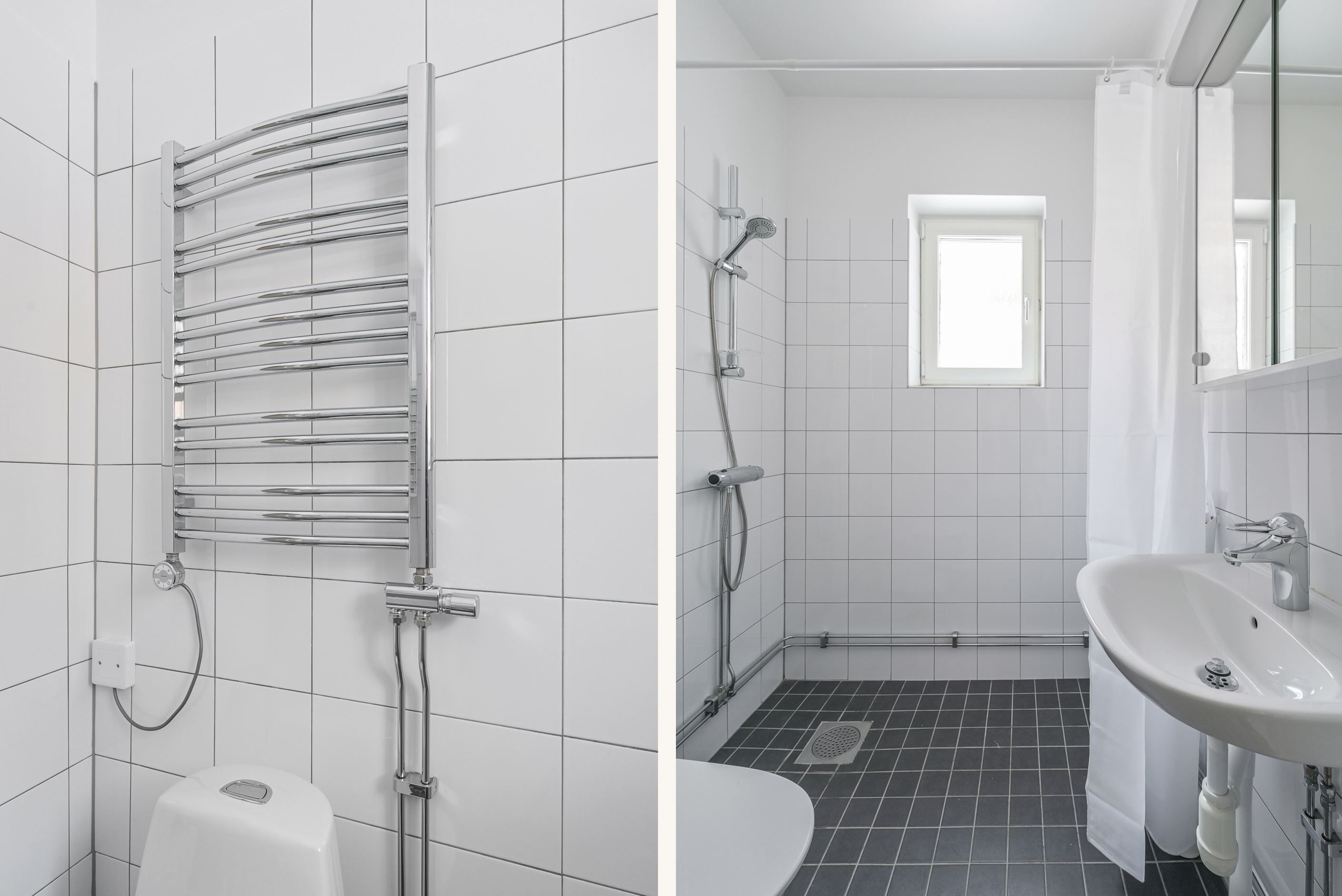 Sovrummet är rofyllt och rymligt nog för en säng och förvaringsmöbel. Lägenhetens badrum har stilrena materialval och innehåller dusch/badkar, WC, handfat, spegelskåp. Ett fräscht och funktionellt badrum, som passar för både vardag och avkoppling. I badrummet finns även ett fönster som bidrar med dagsljus samt ventilation.