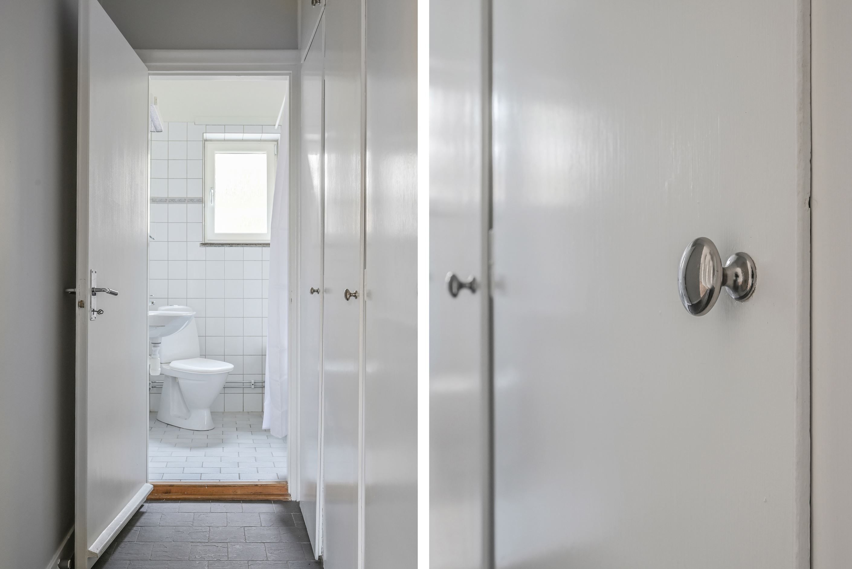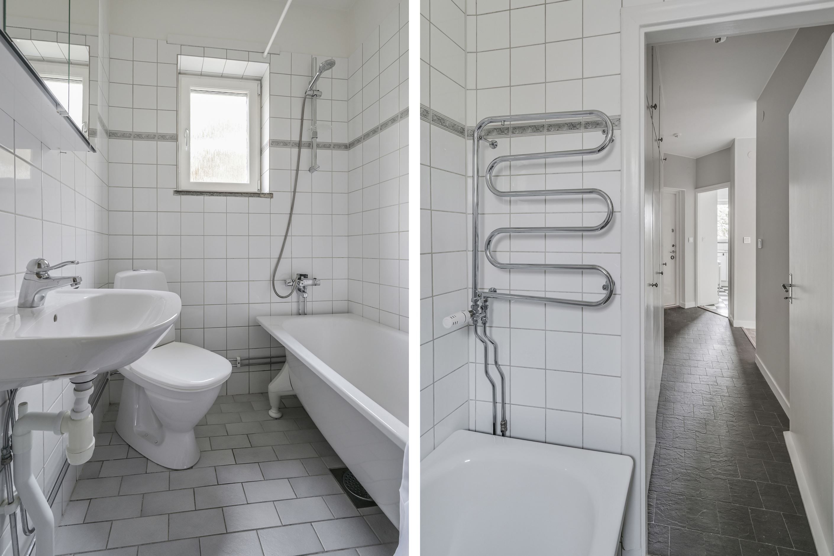 Sovrummet är rofyllt och rymligt nog för en säng och förvaringsmöbel. Lägenhetens badrum har stilrena materialval och innehåller badkar, WC, handfat, spegelskåp och handdukstork. Ett fräscht och funktionellt badrum, som passar för både vardag och avkoppling. I badrummet finns även ett fönster som bidrar med dagsljus samt ventilation.