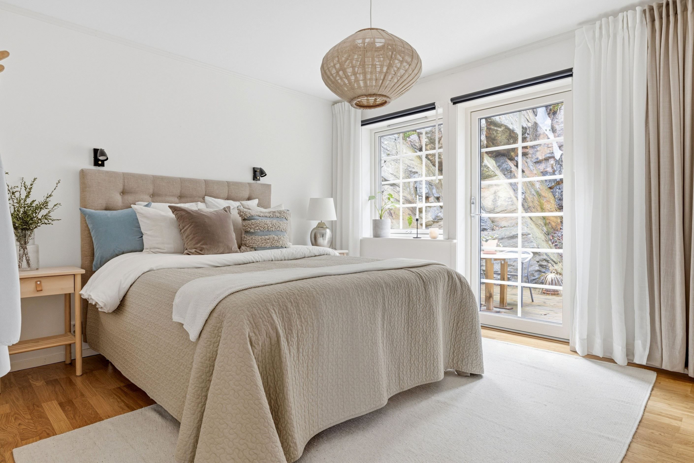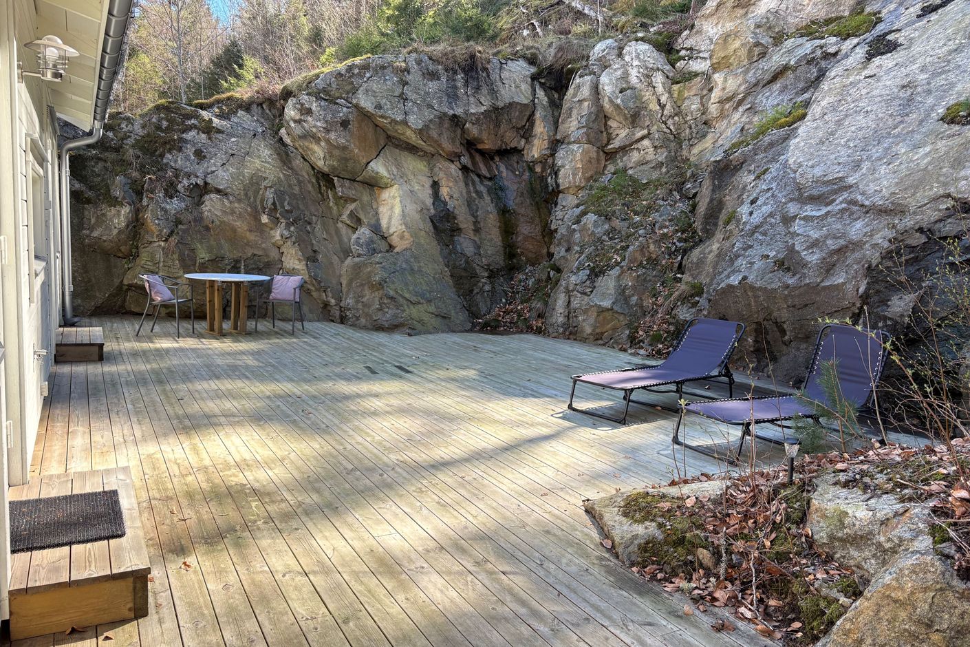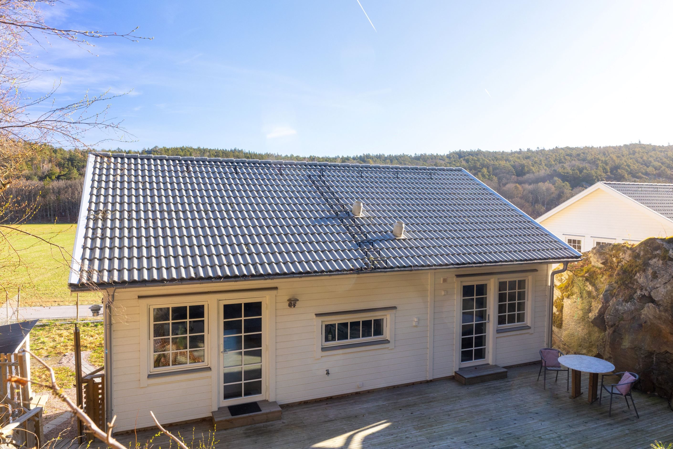 En trappa upp öppnar bostadens sociala ytor upp sig i ett ljust och luftigt vardagsrum med stora fönsterpartier som släpper in rikligt med dagsljus. Här samsas vardagsrum, matplats och ett modernt kök i en öppen och inbjudande planlösning som passar lika bra för vardagsliv som för sociala tillställningar. På det övre planet finns även två sovrum samt ett stilrent badrum. Från både köket och ett av sovrummen nås den härliga uteplatsen – en privat och insynsskyddad oas där naturens klippor skapar en unik och rogivande miljö. Här finns gott om plats för utemöbler och middagar under sommarhalvåret.