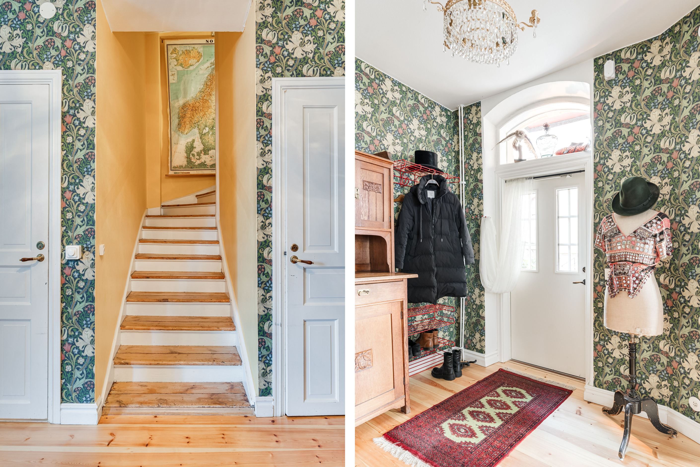 När du tar trappan upp till första våningen möts du av en möblerbar hall med stora fönster som släpper in rikligt med dagsljus. Härifrån når du de två rymliga sovrummen, var och en med sin egen karaktär och unika detaljer som vittnar om tidsperiodens arkitektoniska skicklighet. Det finns också ett andra badrum med ett stort badkar för avkoppling.