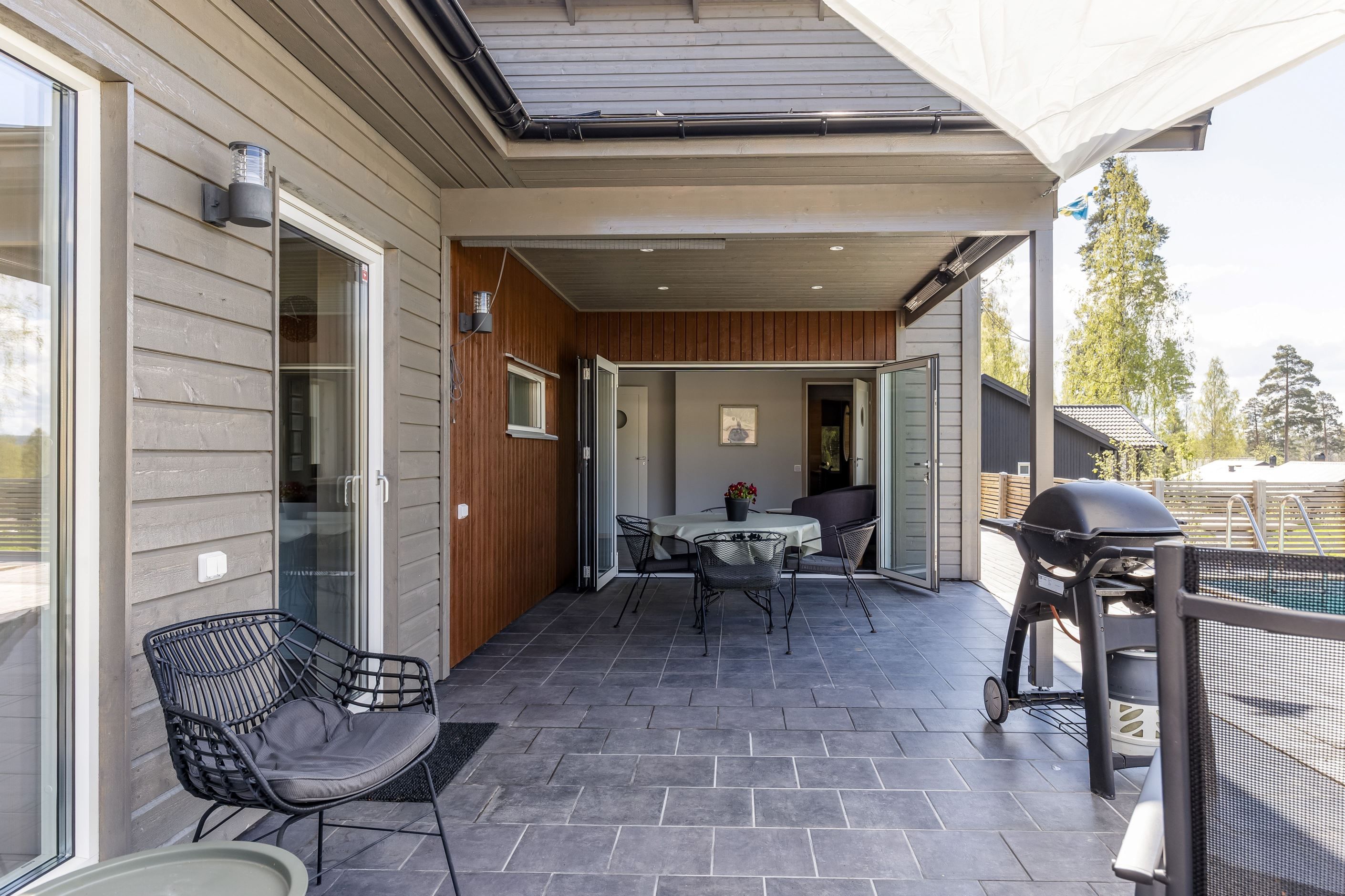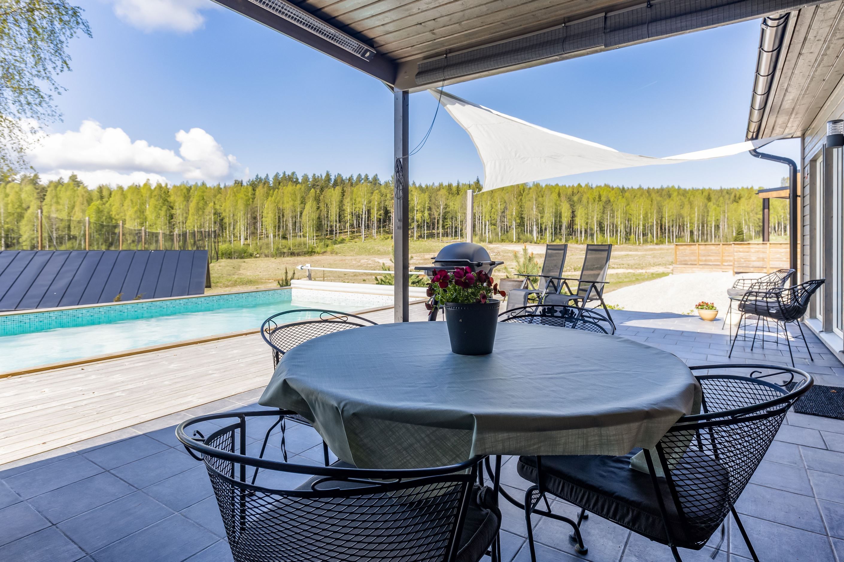 Den öppna planlösningen mellan kök och vardagsrum ger inbjudande och sociala ytor med ett fantastiskt ljusflöde. Uteplatsen och poolområdet blir en naturlig förlängning av bostaden och bjuder in till ett liv där vardag möter semesterkänsla. Den uppvärmda poolen, bastun och det inglasade uterummet samverkar till en exklusiv helhet som förhöjer såväl vardag som fest. Här finns gott om plats för umgänge, avkoppling och långa, minnesvärda sommarkvällar i en lugn och ombonad miljö.