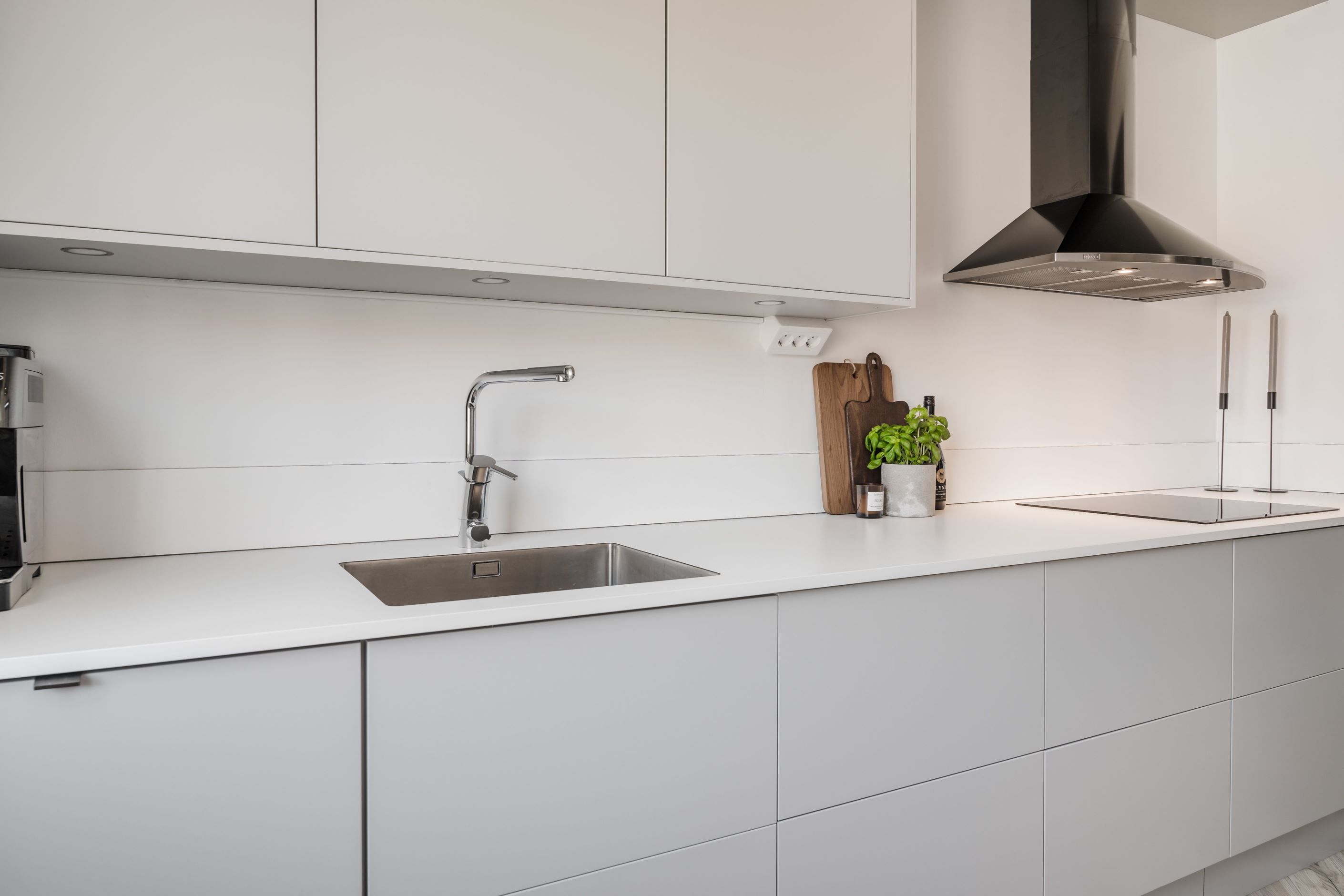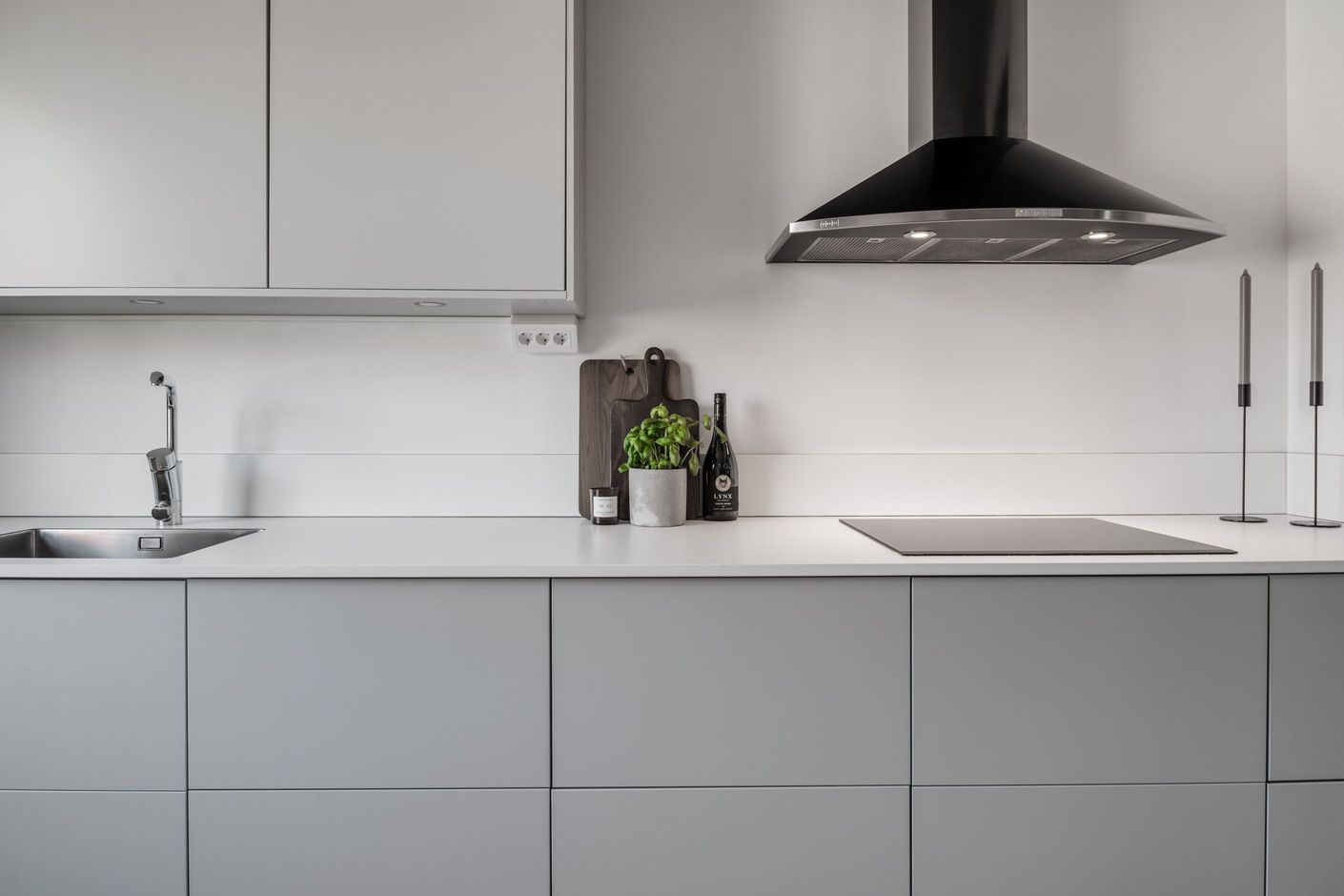 Köket är smakfullt renoverat med ljusgrå, beslagfria luckor och erbjuder gott om både förvaring och arbetsyta. Den maskinella utrustningen är komplett och vid fönstret finns plats för matbord för fyra personer vilket blir en naturlig samlingspunkt för både vardag och middagar.