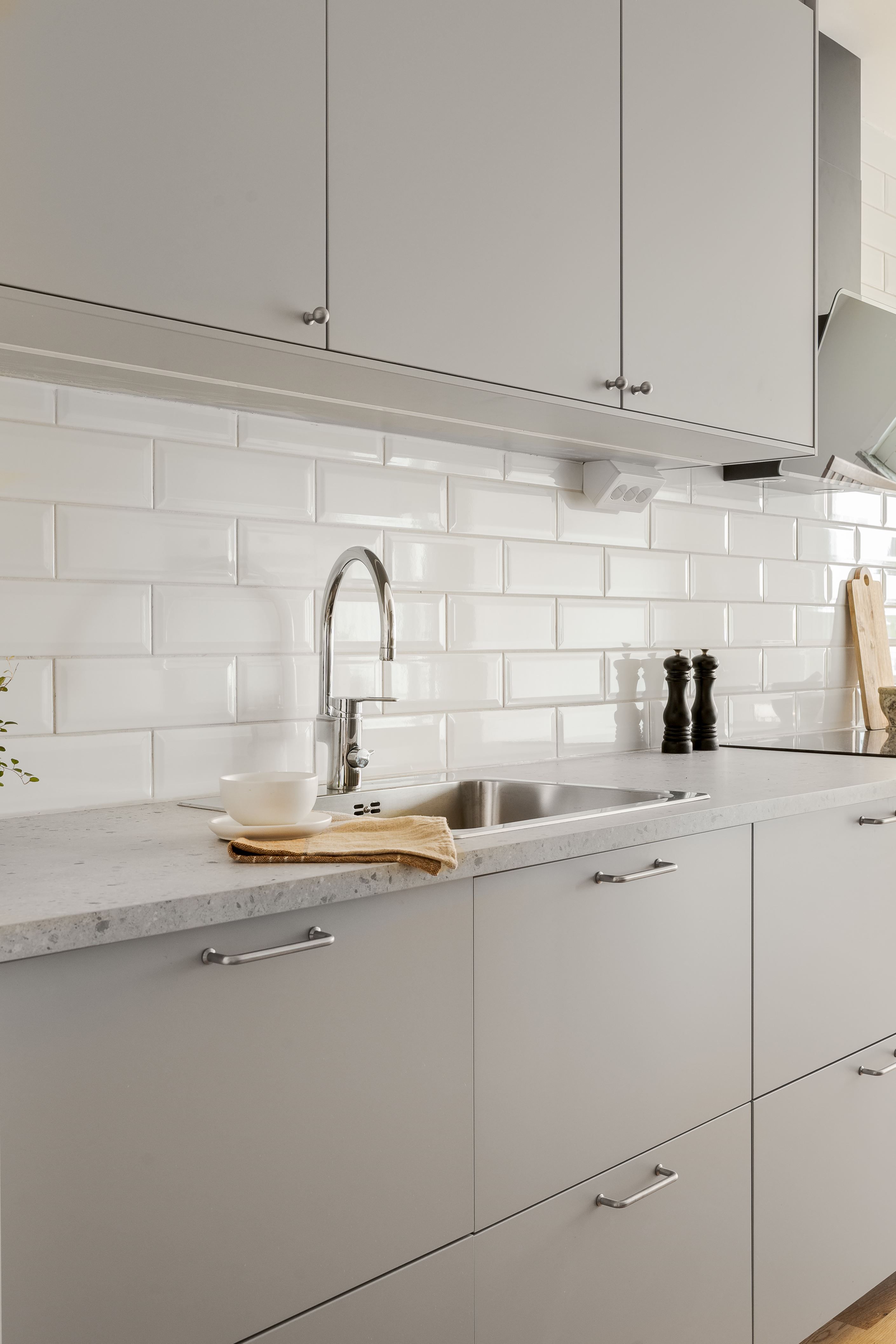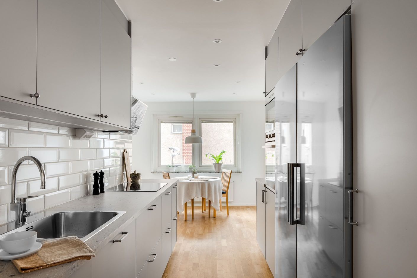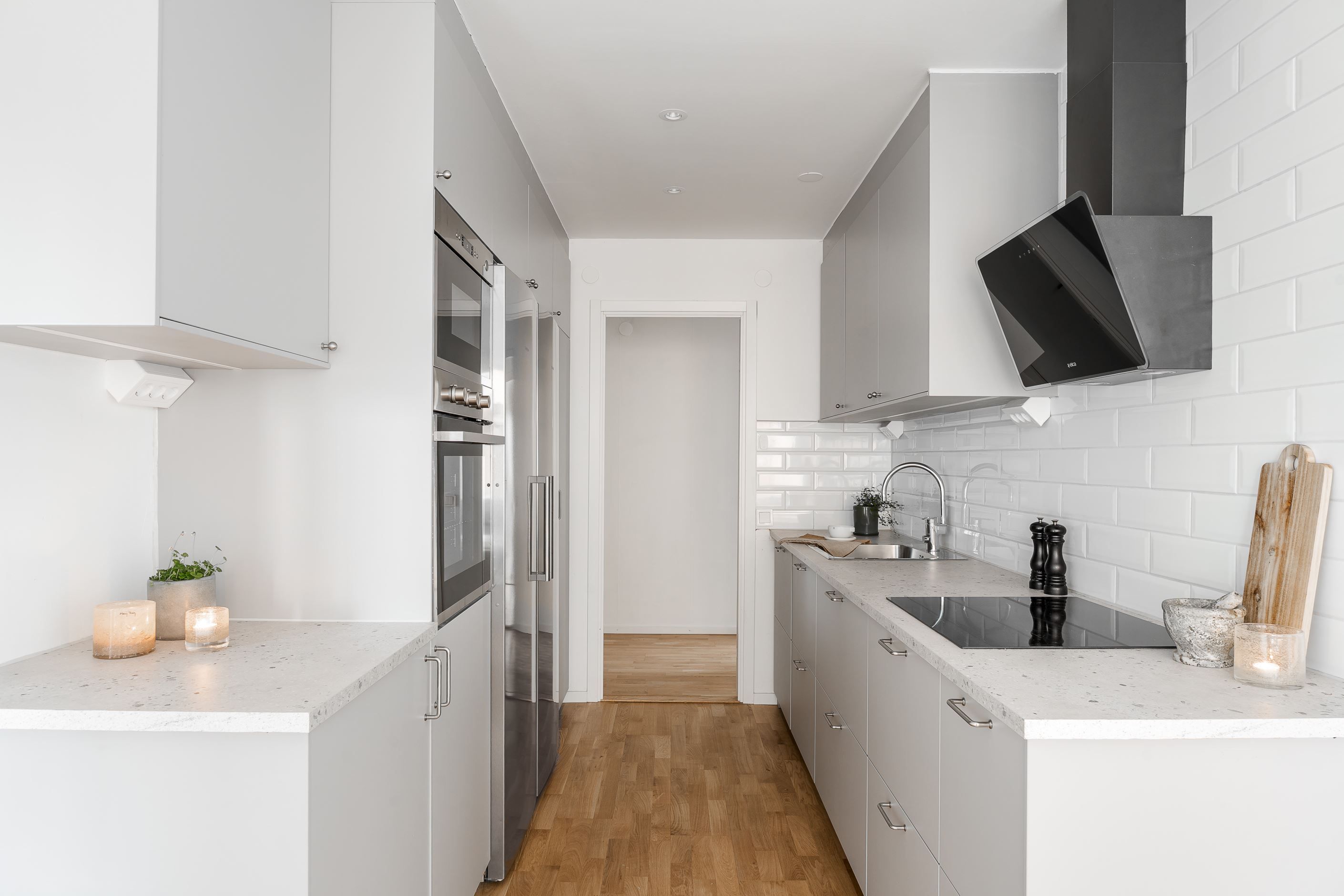 Det nyligen renoverade köket går i en stilren färgsättning och är utrustat med moderna vitvaror, gott om arbetsyta samt plats för ett rymligt matbord – en perfekt samlingspunkt för både vardag och fest.