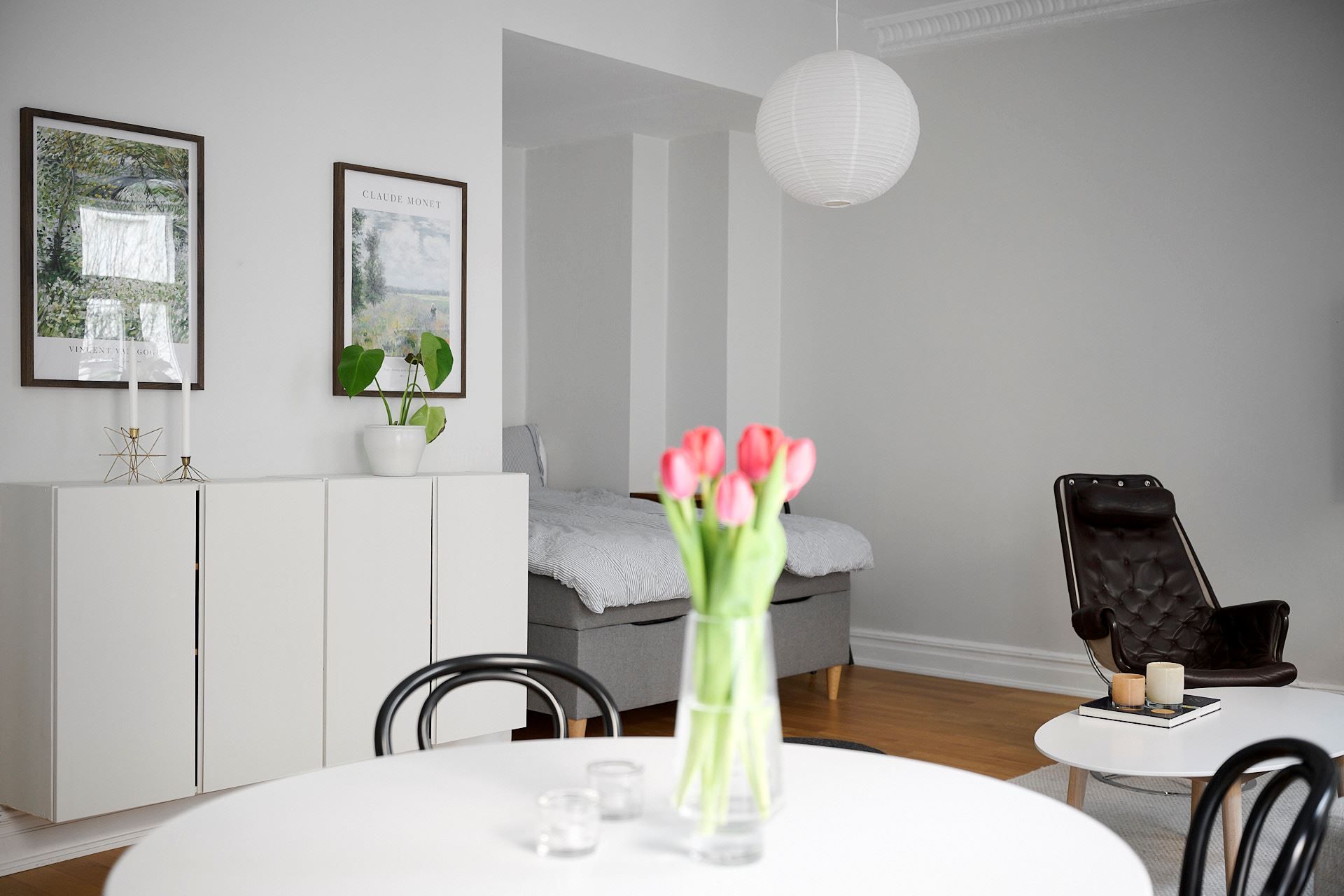 Lägenheten som är 44 kvadratmeter har en takhöjd på hela 2,95 meter och i kombination med de stora fönsterna skapas ett rikligt ljusinsläpp. Rummets storlek och disposition gör att stora sällskap är välkomna och skapar en social känsla!