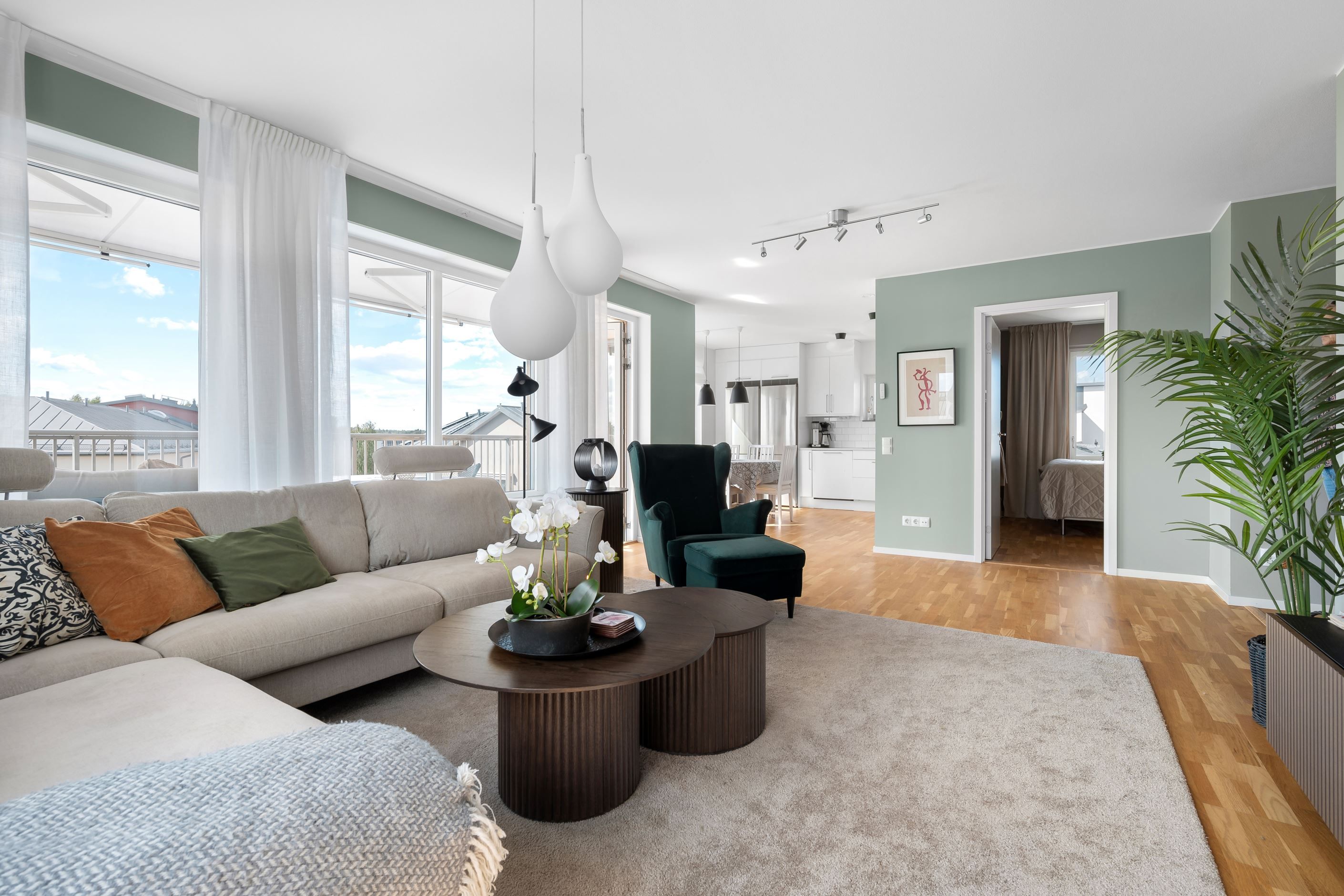 Genomtänkt planlösning med tre sovrum samt kök som smälter samman med vardagsrummet och ger en öppen och social yta. Härifrån har du en harmonisk övergång till den magiska terrassen med plats för stort matbord och lounge grupp för härliga grillkvällar med släkt och vänner. Om du letar efter en övergång från villa till lägenhet utan kompromisser är detta svaret.