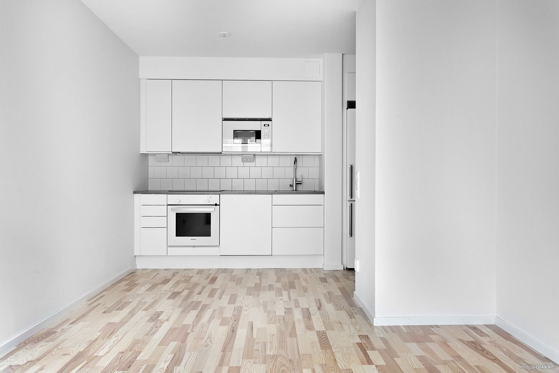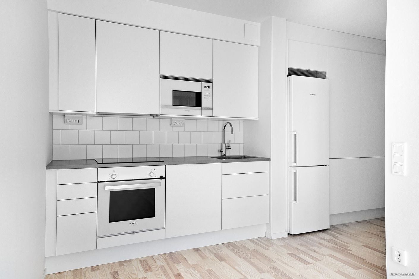 I lägenheten är det ljusa materialval, ett fullutrustat kök från Marbodal med induktionshäll, diskmaskin, inbyggd ugn och mikro, kombinerad kyl/frys. Samtliga vitvaror från Siemens och köksfläkt från Franke.