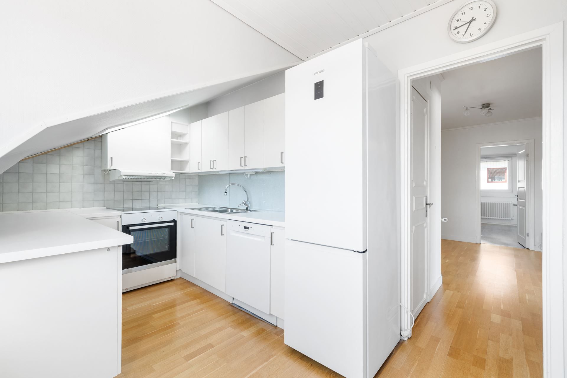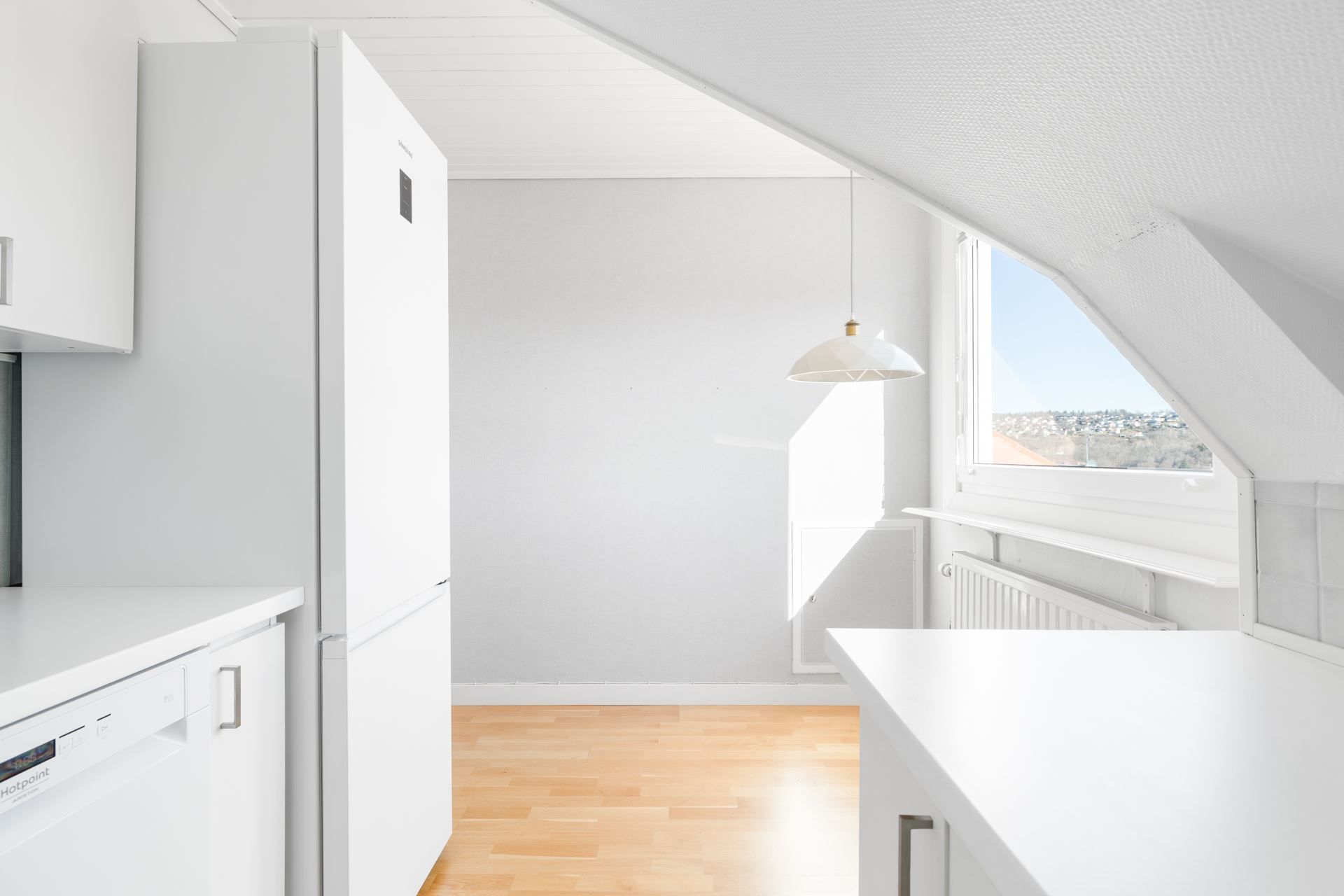 Köket är stilrent i vitt och i gott skick med bra arbetsytor och utrustat med kombinerad kyl och frys, diskmaskin samt spis – ett praktiskt och funktionellt kök som passar både vardag och helg.