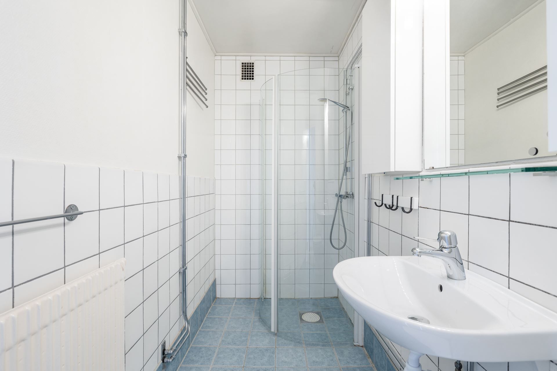Badrummet är utrustat med kaklade väggar och klinkergolv samt dusch och wc. Här finns även möjlighet att installera tvättmaskin för den som önskar.