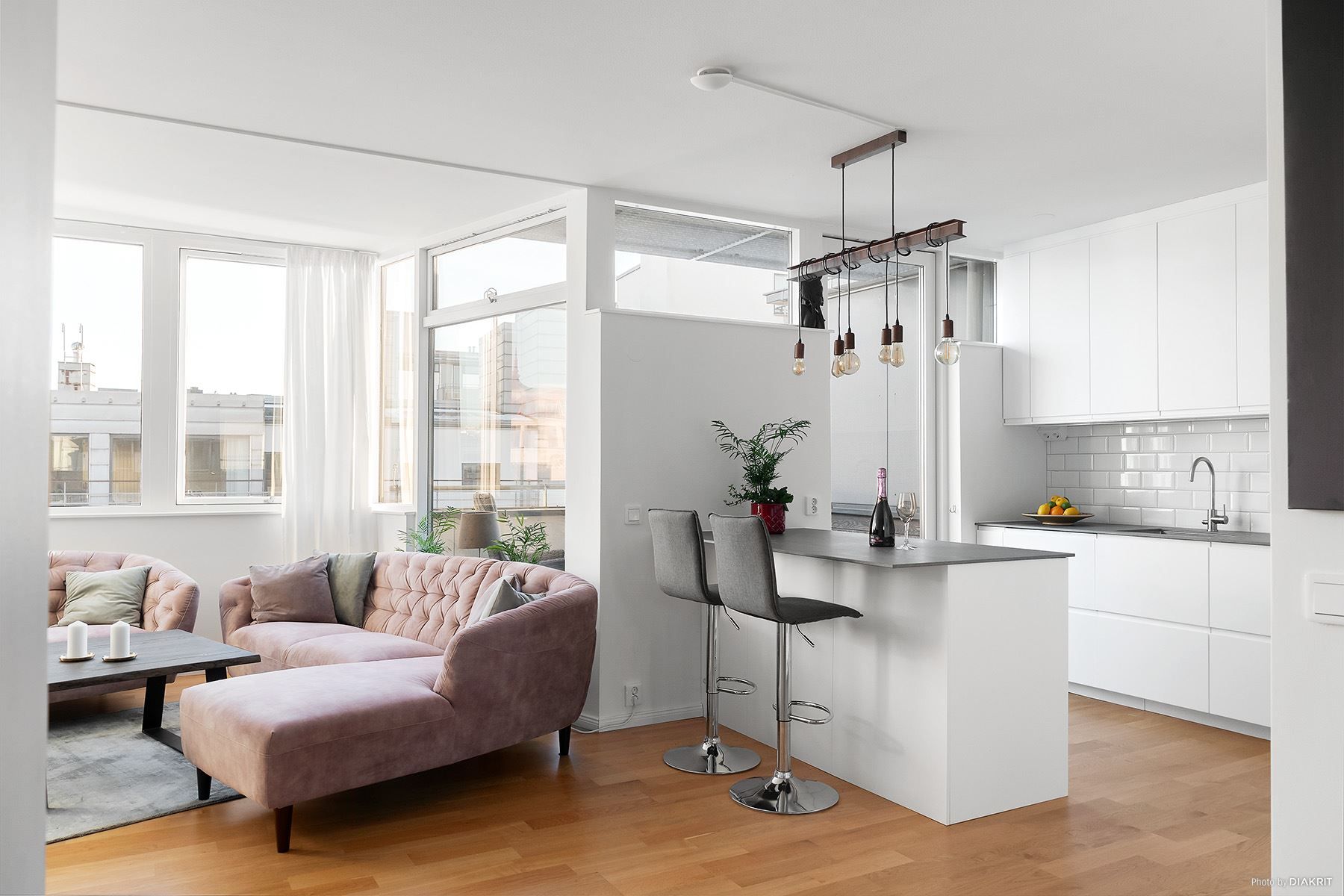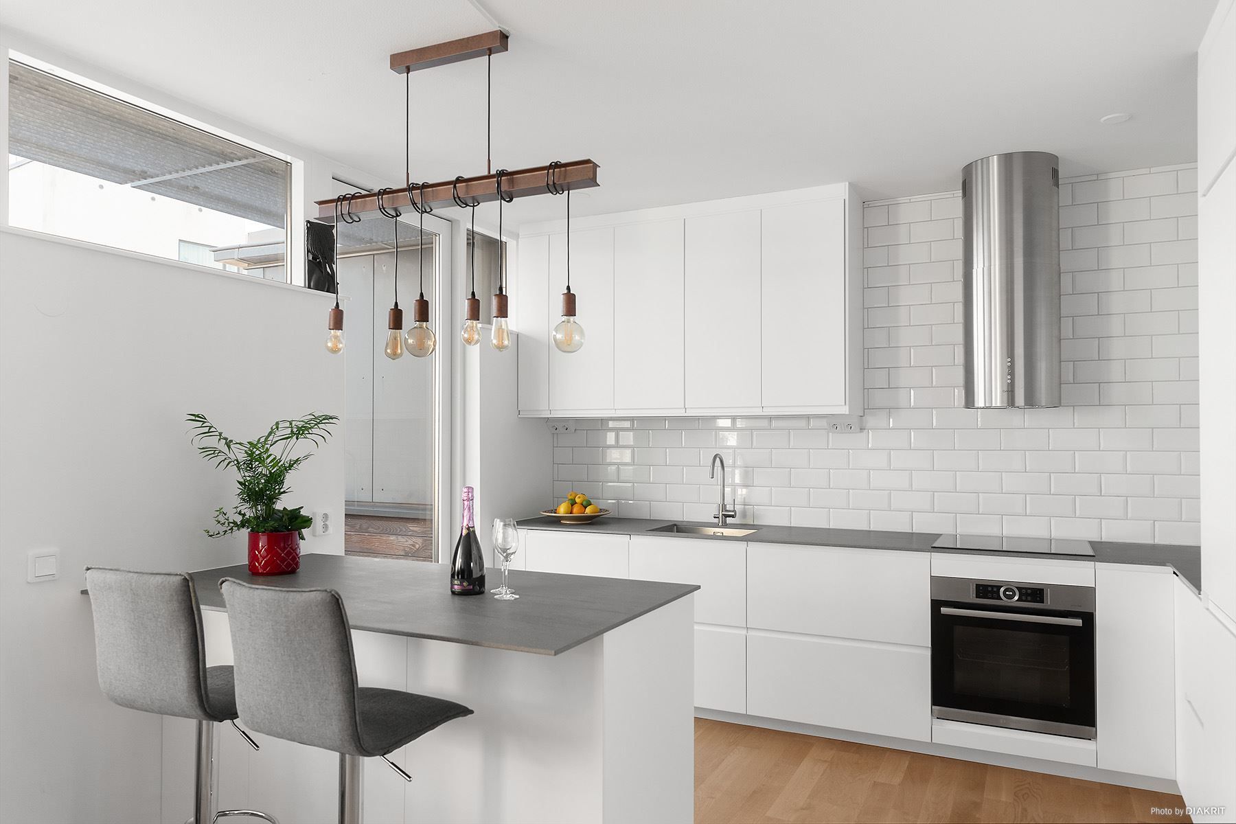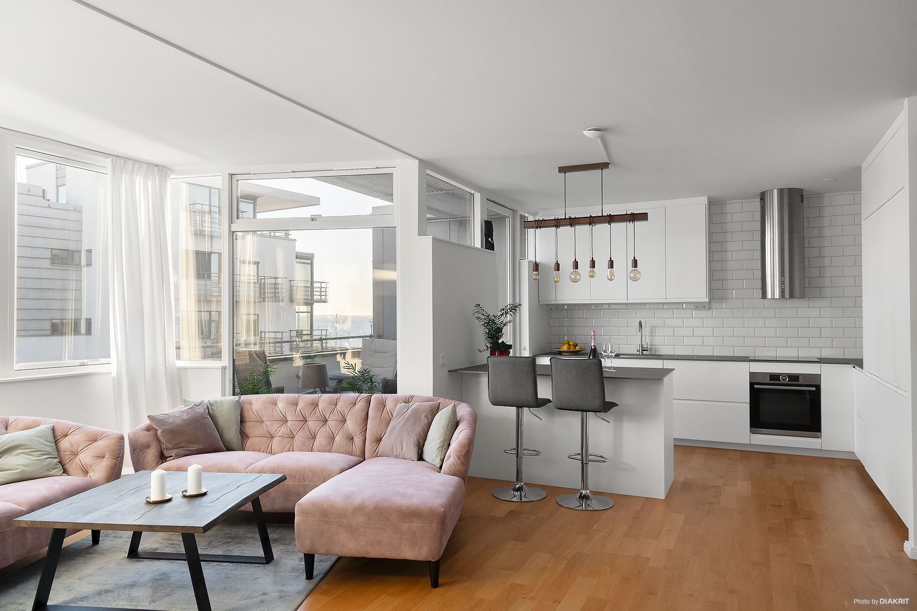 Den optimala planlösningen skapar en rymlig och social atmosfär, där kökets stora köksö smälter samman med vardagsrummet och matplatsen. De stora fönsterpartierna i söderläge ger ett fantastiskt ljusinsläpp, och frånvaron av grannar ovanför garanterar en rofylld boendemiljö.
