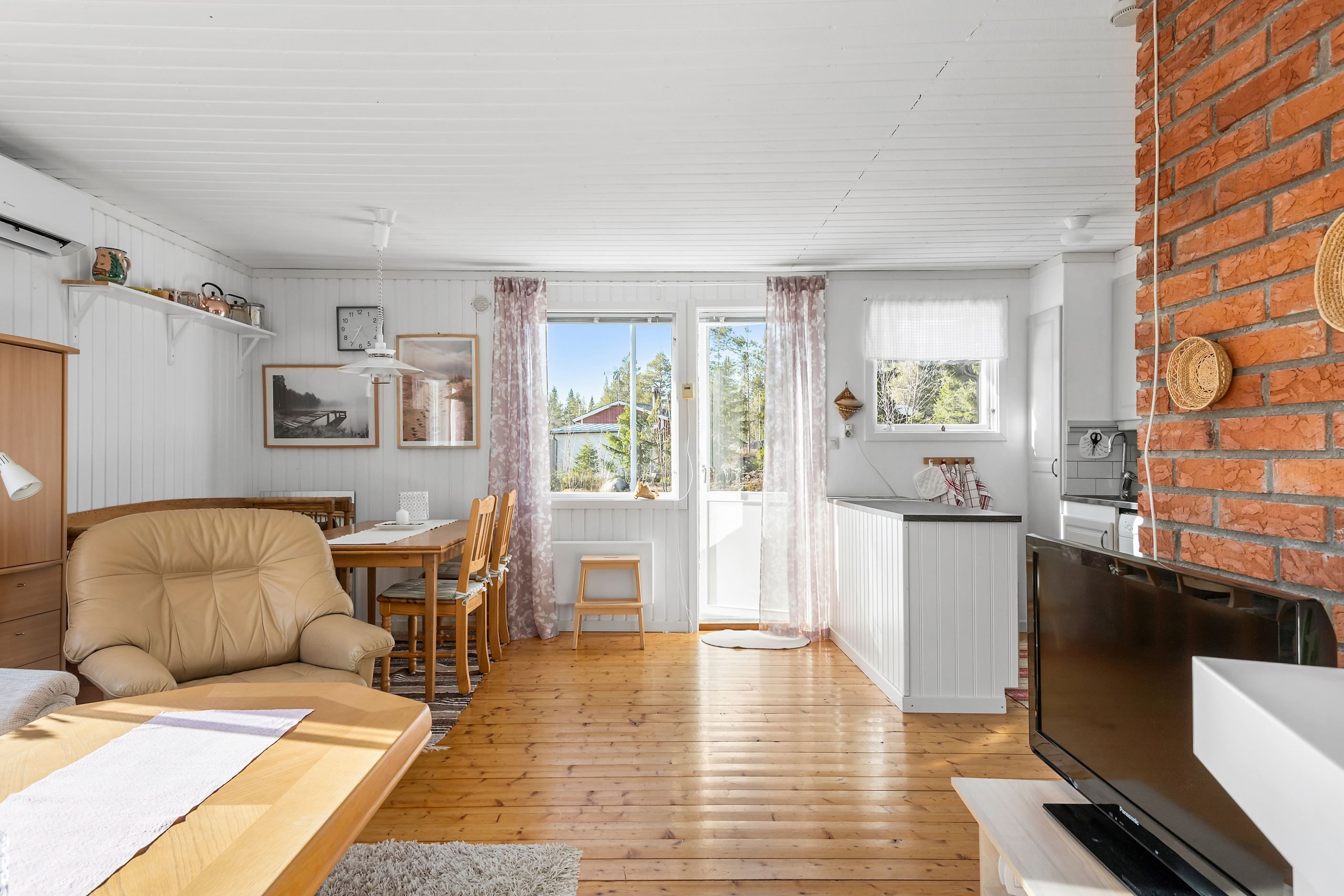 Öppen planlösning mellan kök och allrum som är möblerat med matbord och soffgrupp. Allrummet har flera stora fönster ger ett härligt ljus till rummet och utsikt mot havet. I allrummet finns en värmande kamin (godkänd), luft/luftvärmepump på väggen samt en dörr ut till altanen i söder- och västerläge.