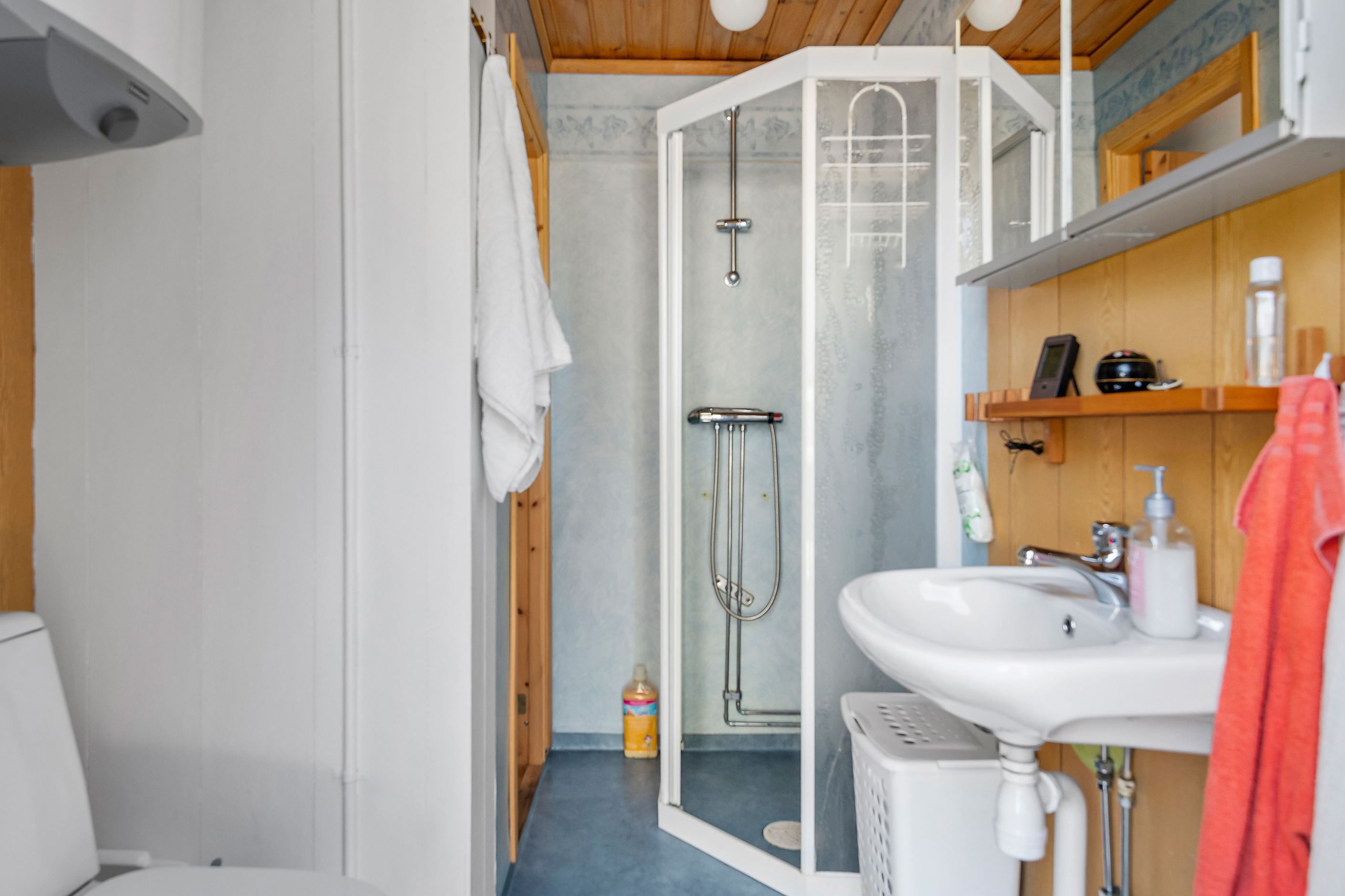 Wc/dusch med golv- och väggmatta, handfat med spegelskåp, vattentoalett samt en dusch med duschväggar. Ny varmvattenberedare på 50 liter.