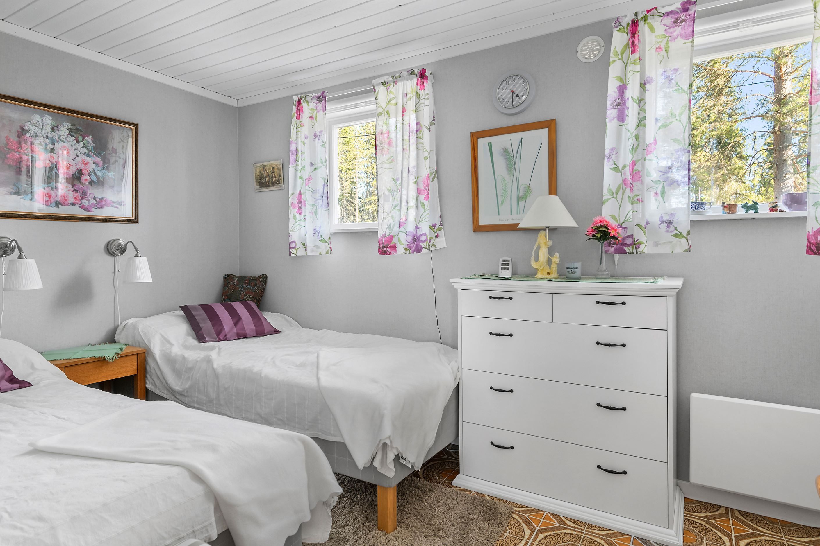 Sovrum med plats för två sängar, ljusinsläpp från två fönster och förvaringsmöjligheter.