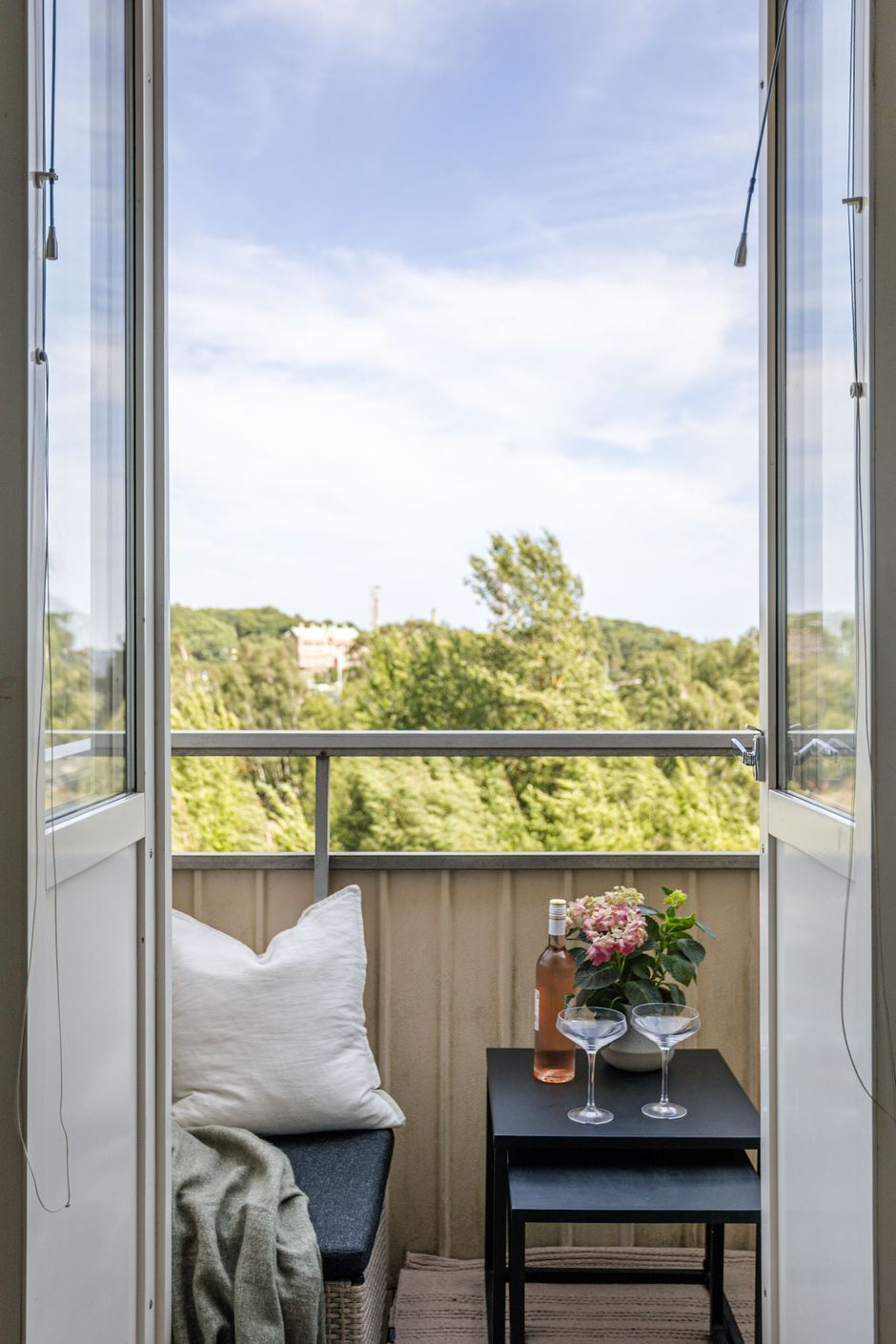 Balkongen i österläge vetter mot småbåtshamnen och bjuder på en rogivande utsikt – ett trivsamt inslag som förlänger bostadens kvaliteter.
