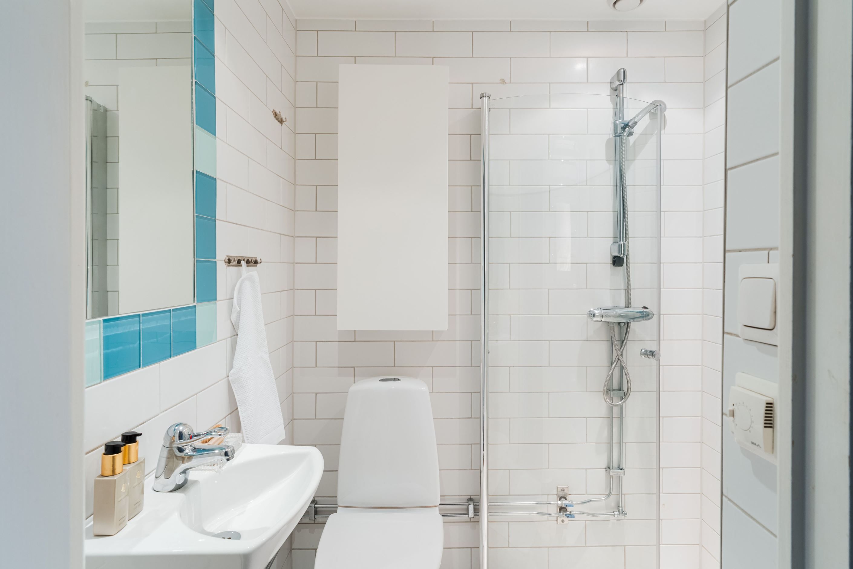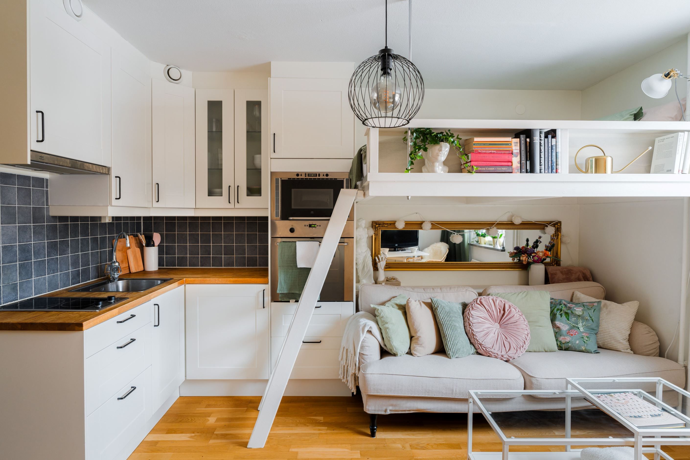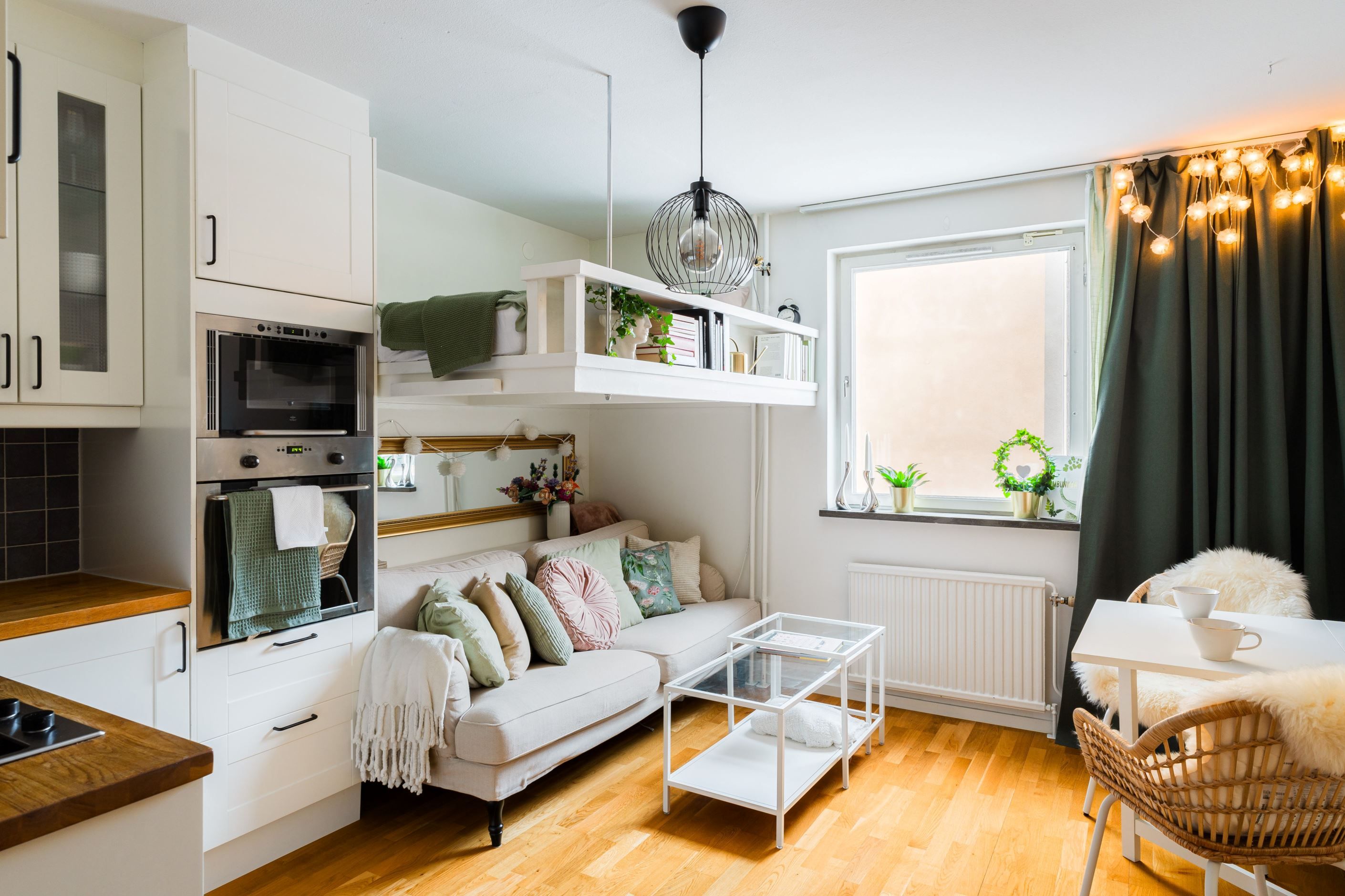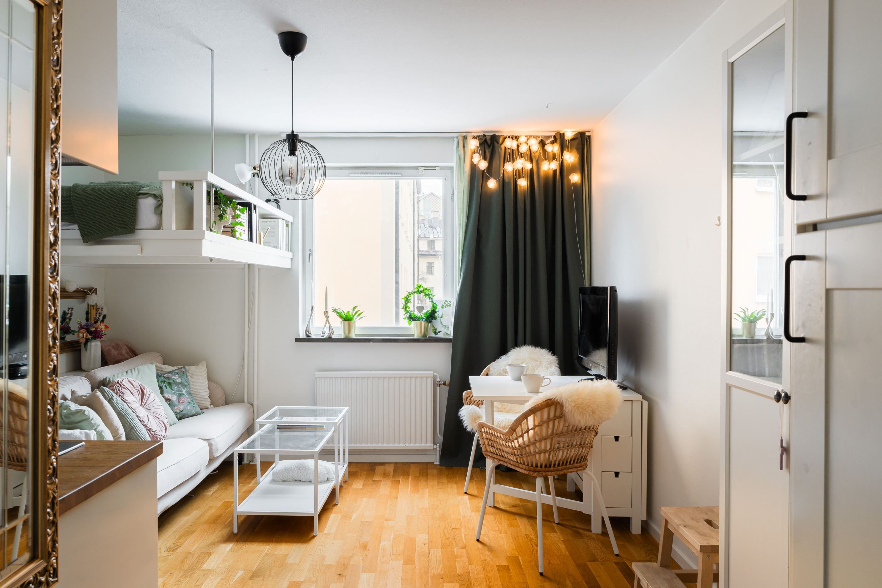 Stort helkaklat badrum med dusch och wc. En platsbyggd loftsäng med inbyggd bokhylla skapar plats för både matbord och soffhörna!