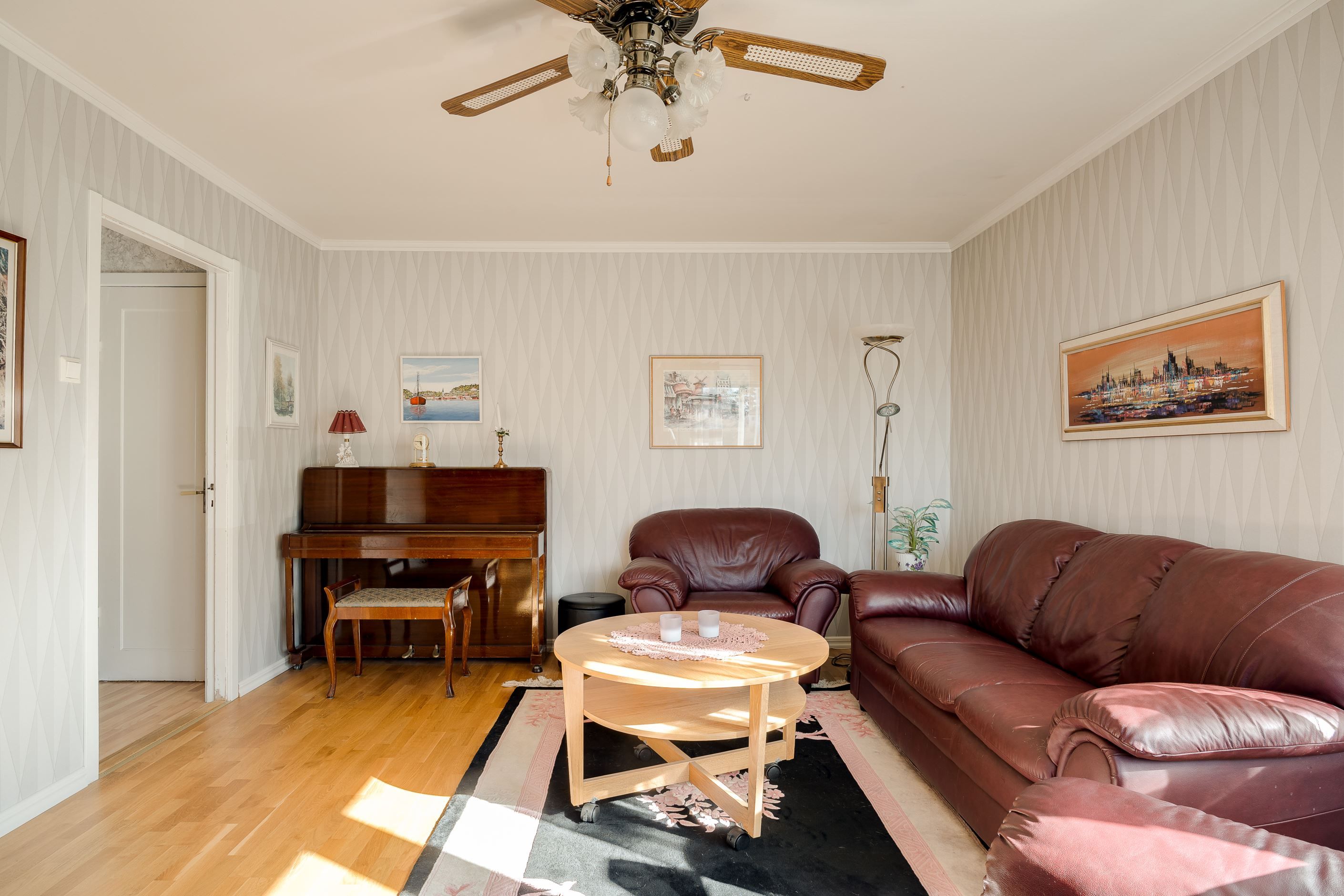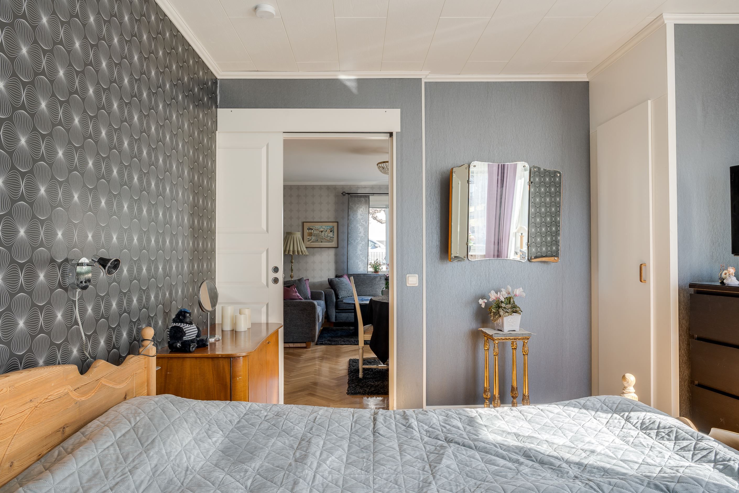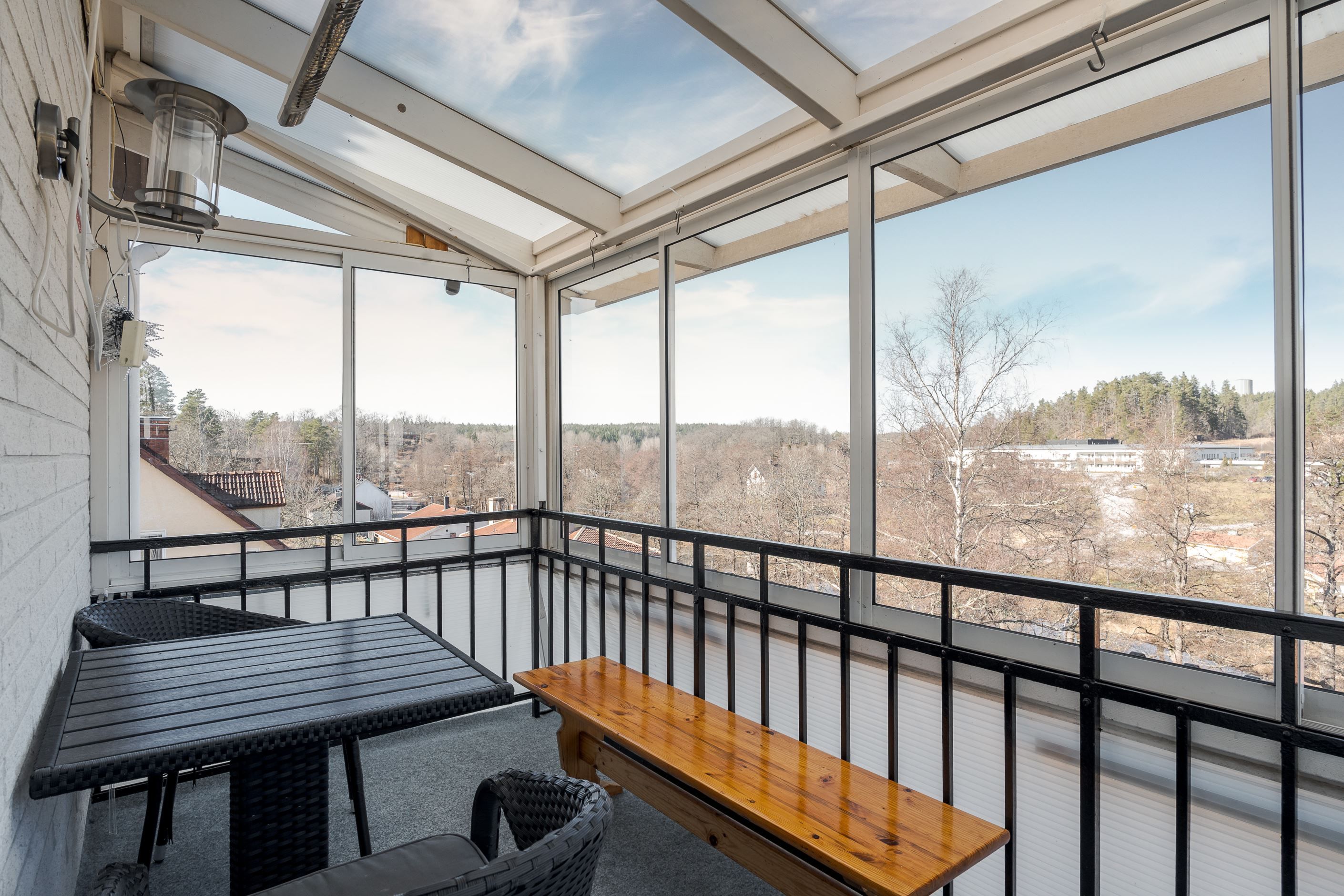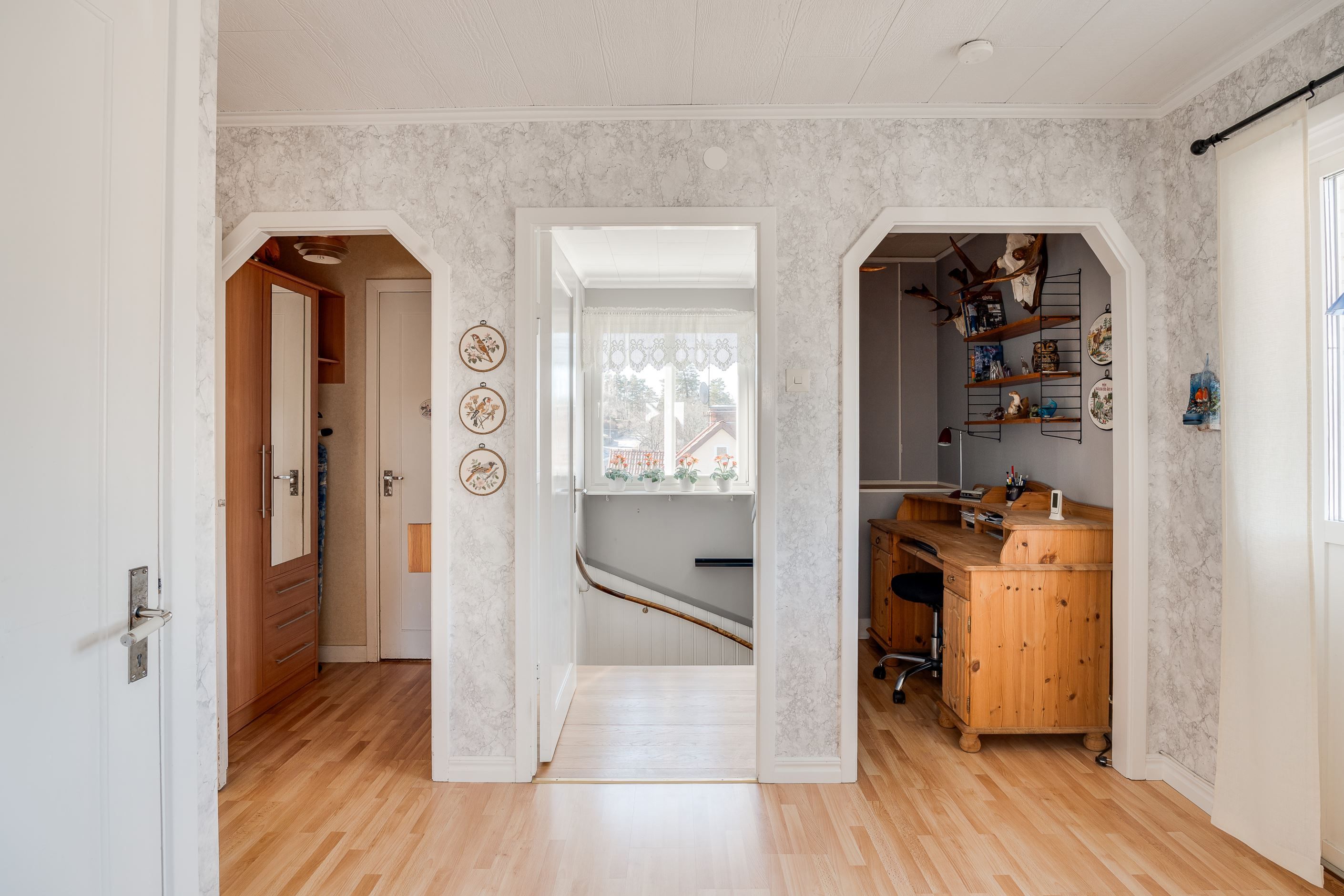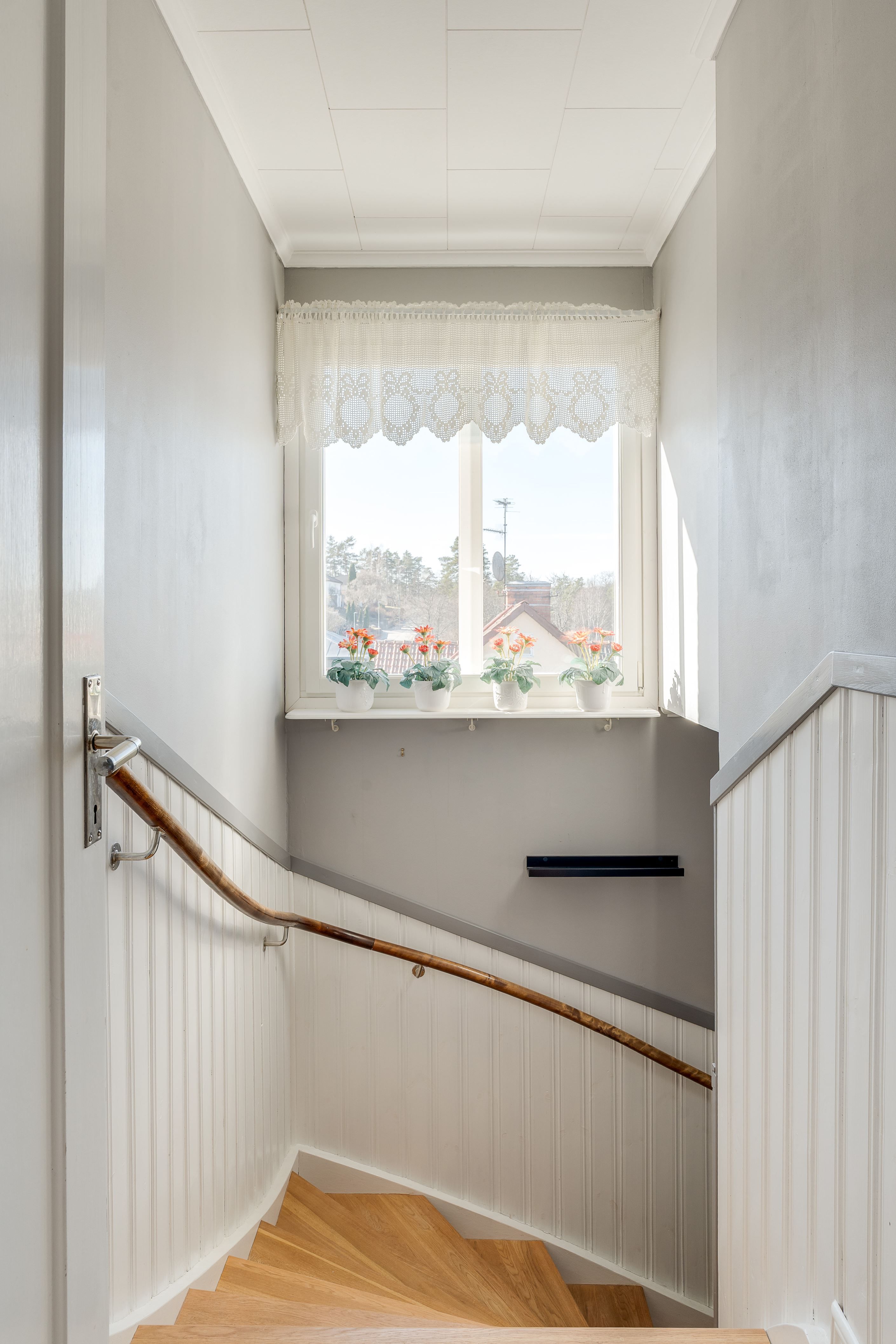 På övre plan finner vi två rofyllda sovrum samt ett vardagsrum. Härifrån blickar man ut över stadens takåsar och får njuta av kvällsljus och stämningsfulla vyer. Samt ett badrum, hall och mindre arbetsrum. Härifrån når man även den mysiga och väl använda inglasade balkongen.