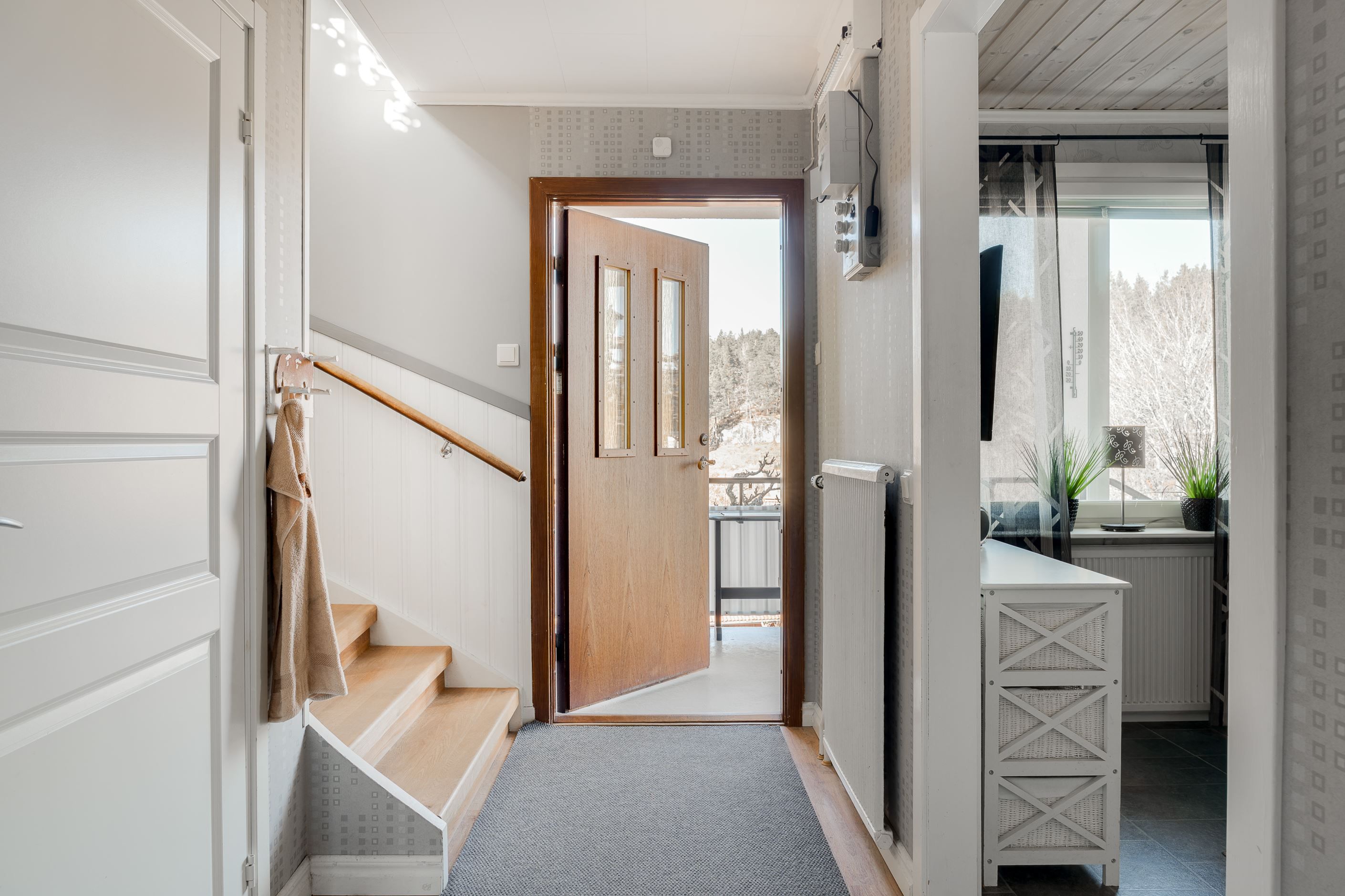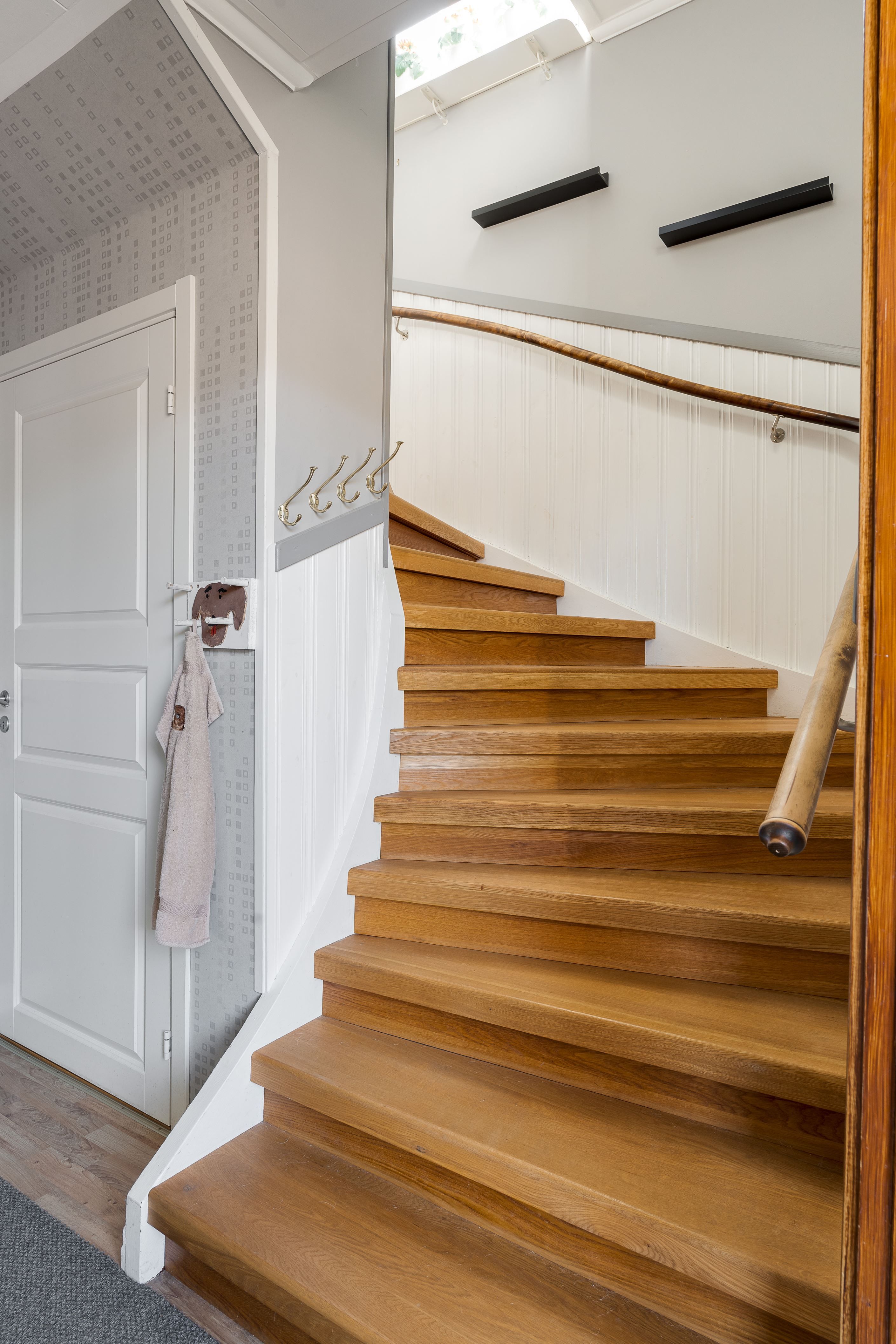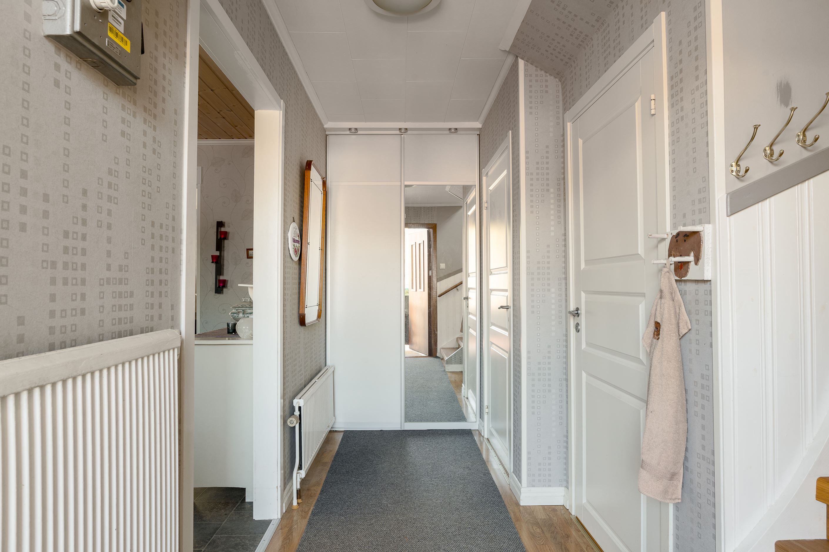 Entréplanet erbjuder en stor rymlig hall med avhängningsdel, garderober med skjutdörrar, badrum, ett stort och ljust modernt kök med fina maskiner och plats för ett stort matbord, ljust vardagsrum med fiskbens parkett och fönster åt två håll, ett av dem fyra sovrummen finns även på detta plan – utmärkt som gästrum, hemmakontor eller ungdomsrum.