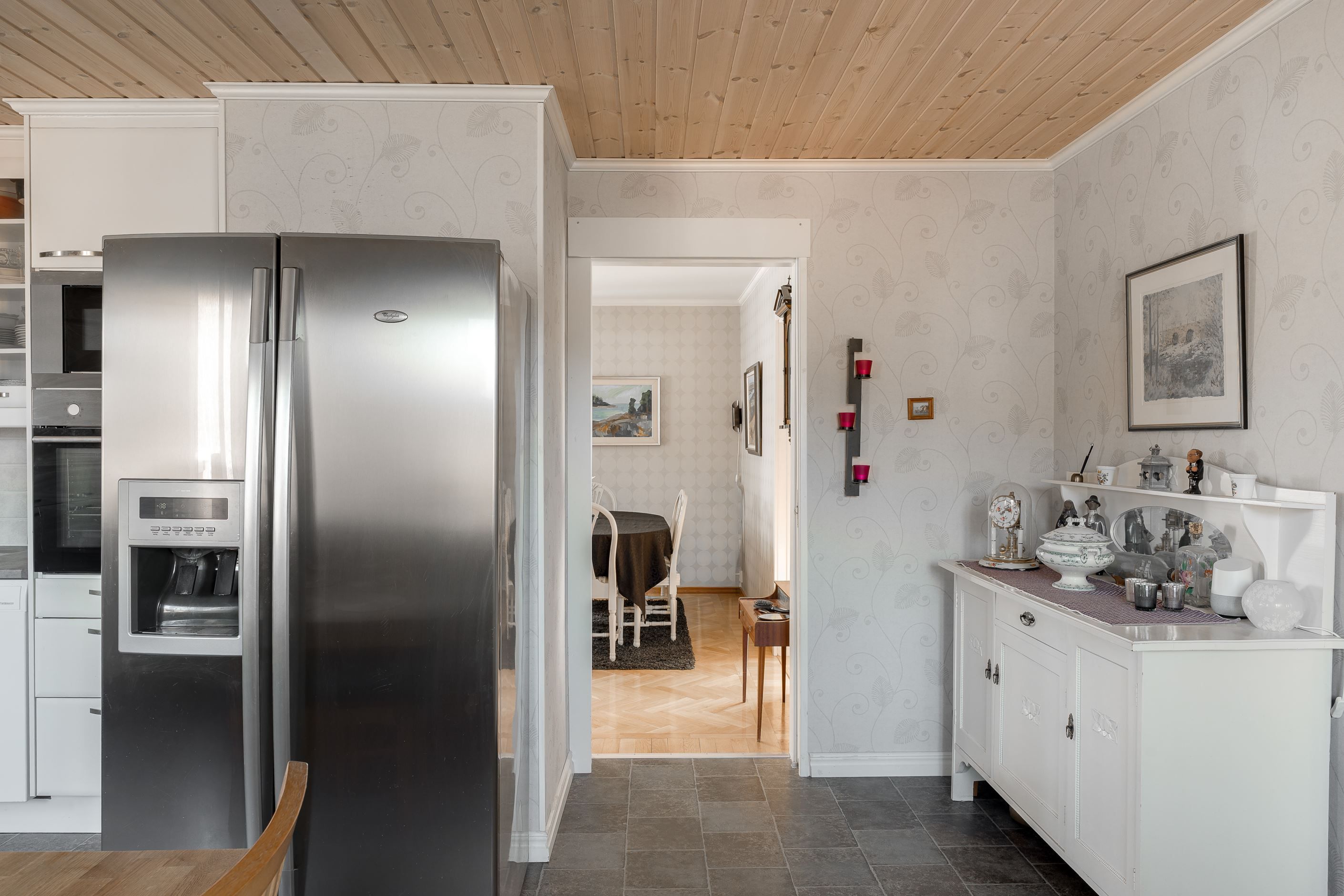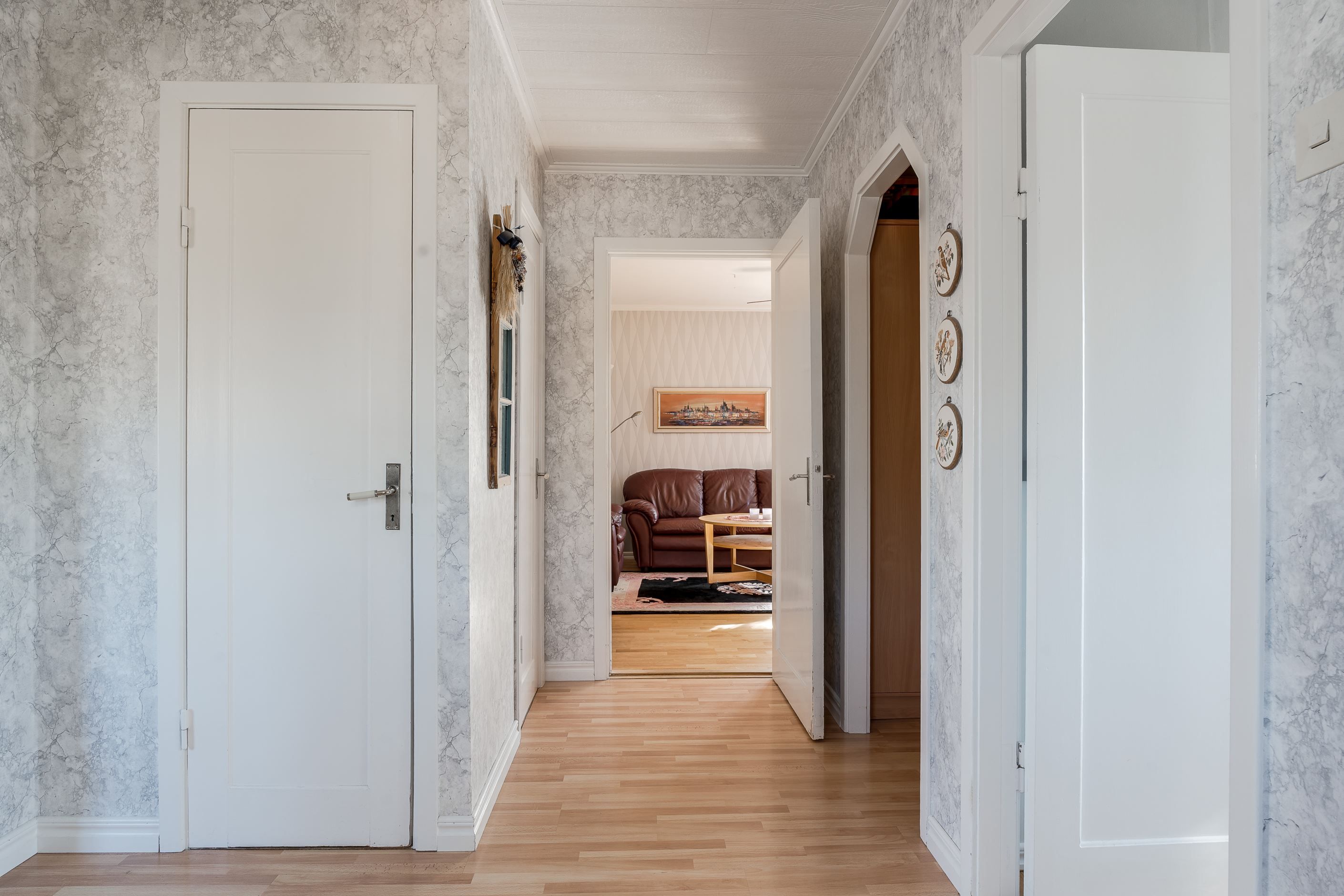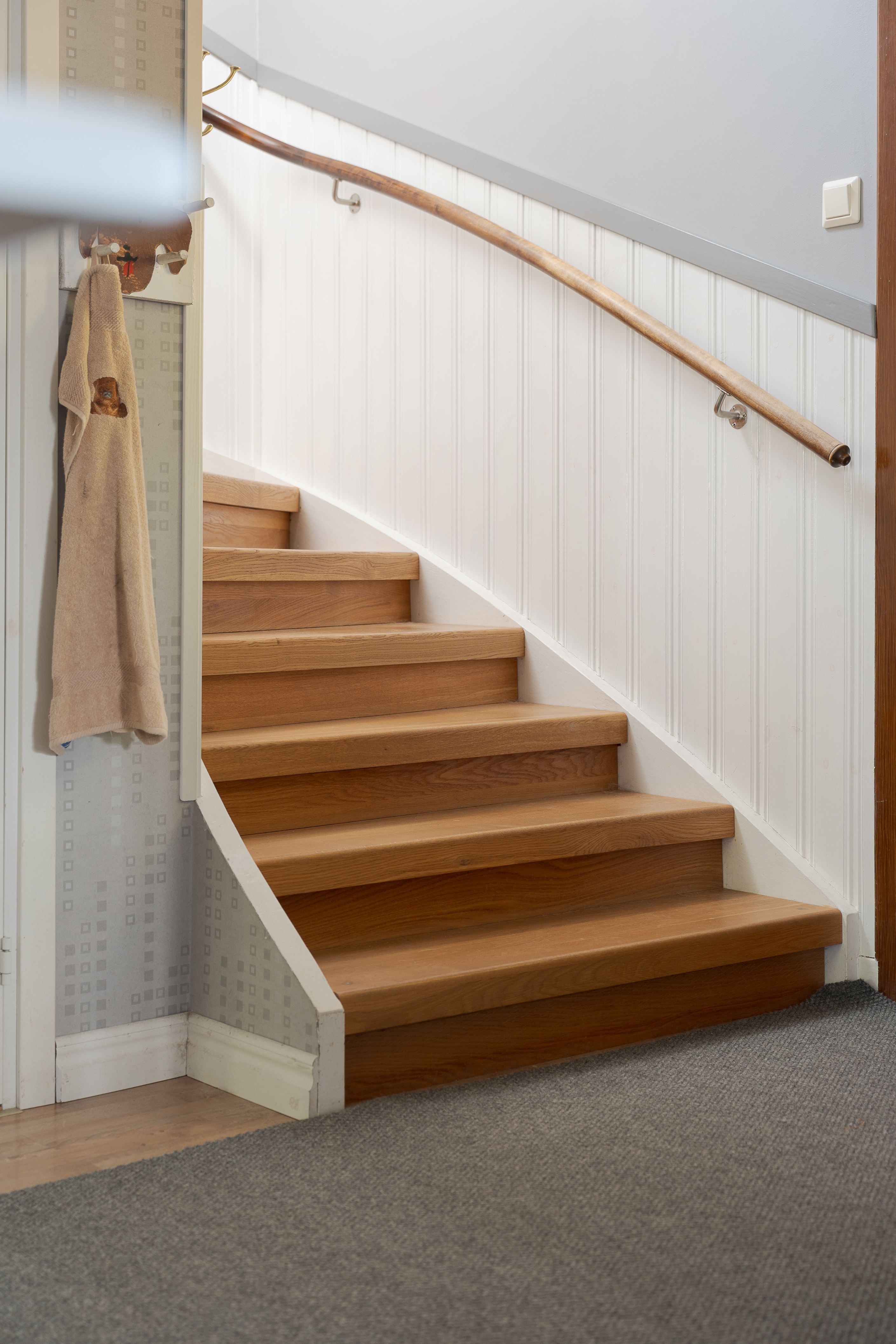 Entréplanet erbjuder en stor rymlig hall med avhängningsdel, garderober med skjutdörrar, badrum, ett stort och ljust modernt kök med fina maskiner och plats för ett stort matbord, ljust vardagsrum med fiskbens parkett och fönster åt två håll, ett av dem fyra sovrummen finns även på detta plan – utmärkt som gästrum, hemmakontor eller ungdomsrum.
