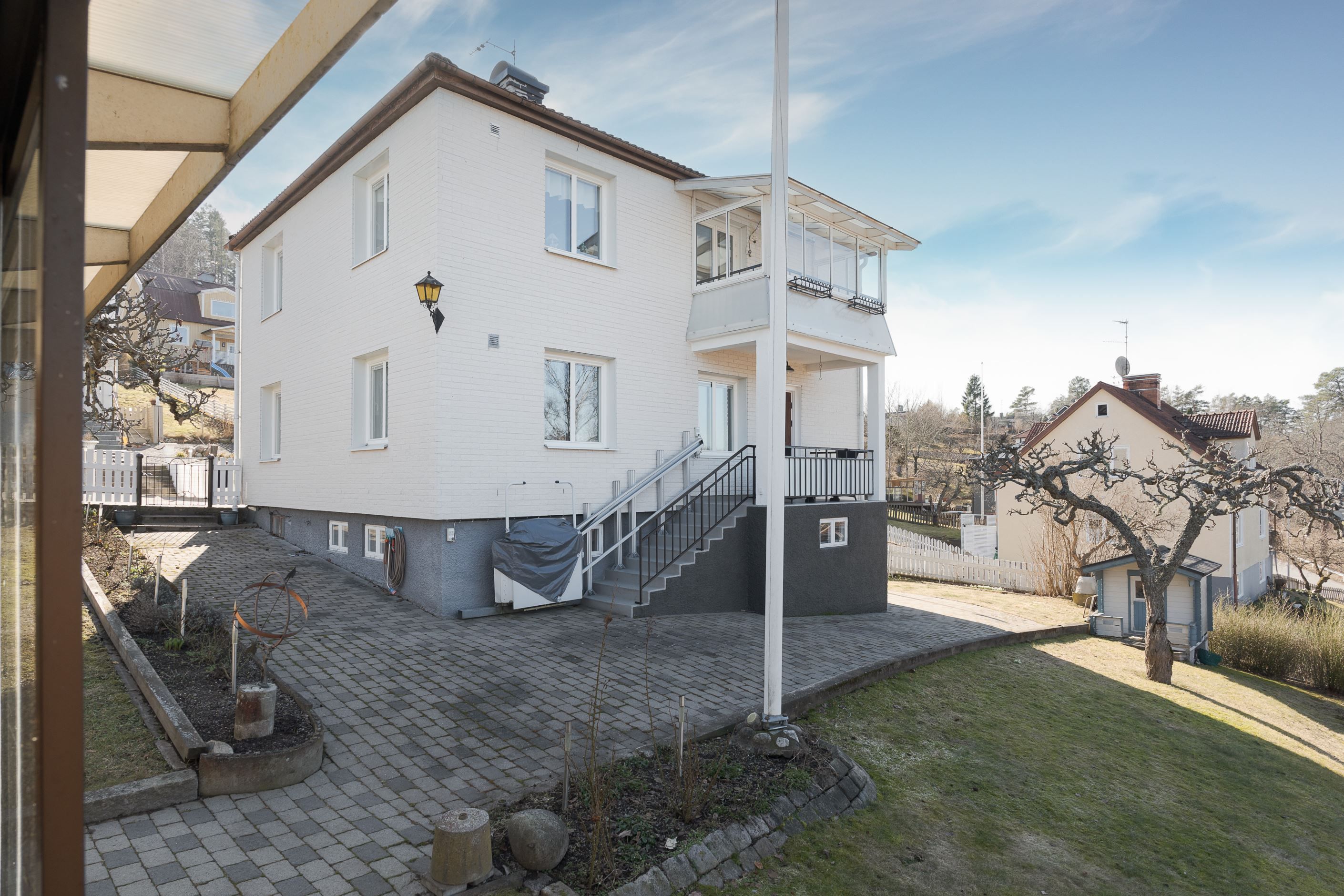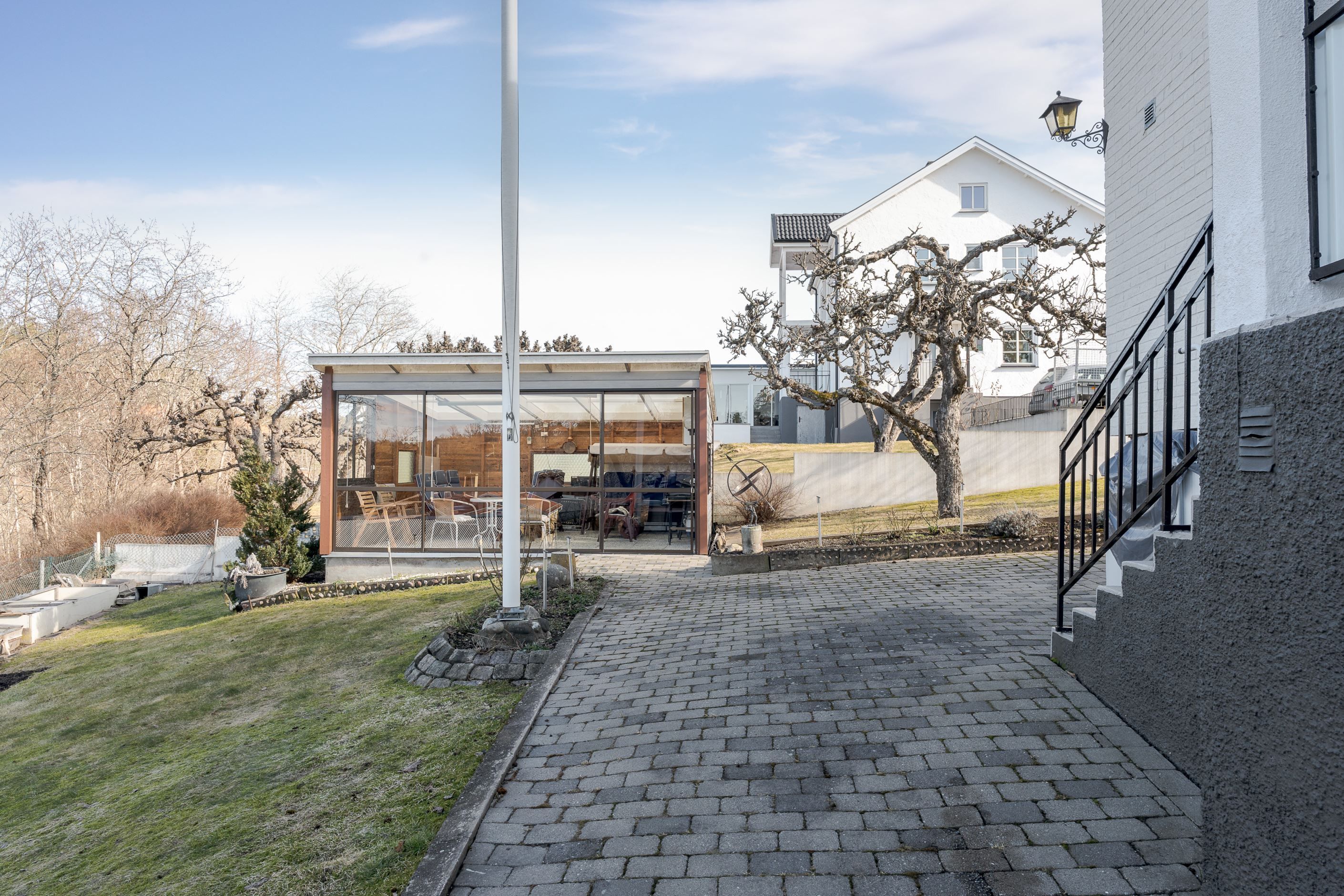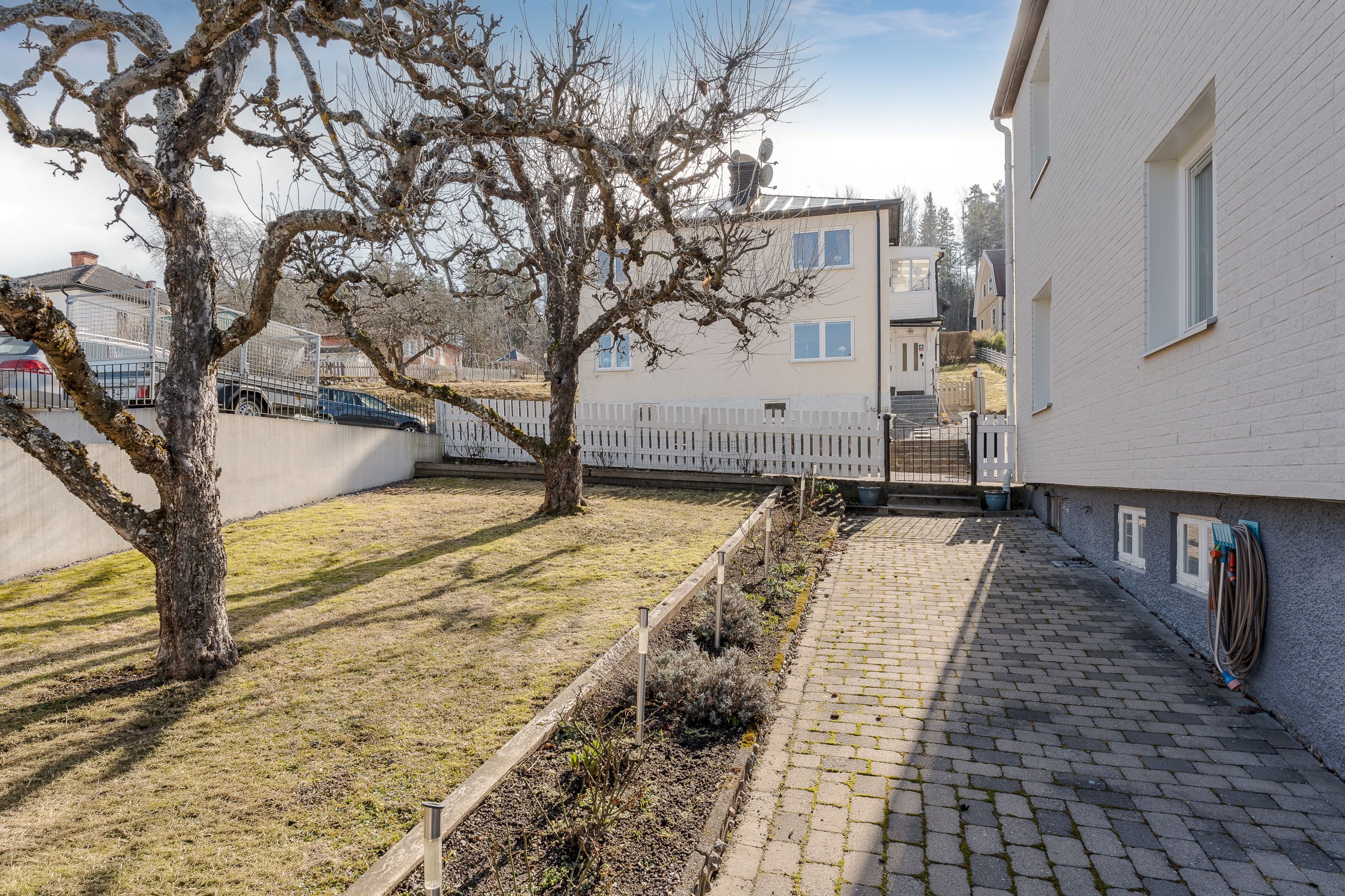 Tomten är välplanerad med gräsmatta, planteringar och ett generöst uterum. På tomten har man solchanser från morgon till kväll i olika vädersträck. Här finns plats för både loungemöbler, matgrupp och grill – sommarhalvåret gör sig extra bra just här. På uppfarten finns plats att parkera bilen om man inte väljer att köra in i garaget. Staket runt om hela fastigheten är smidigt för barn och husdjur.