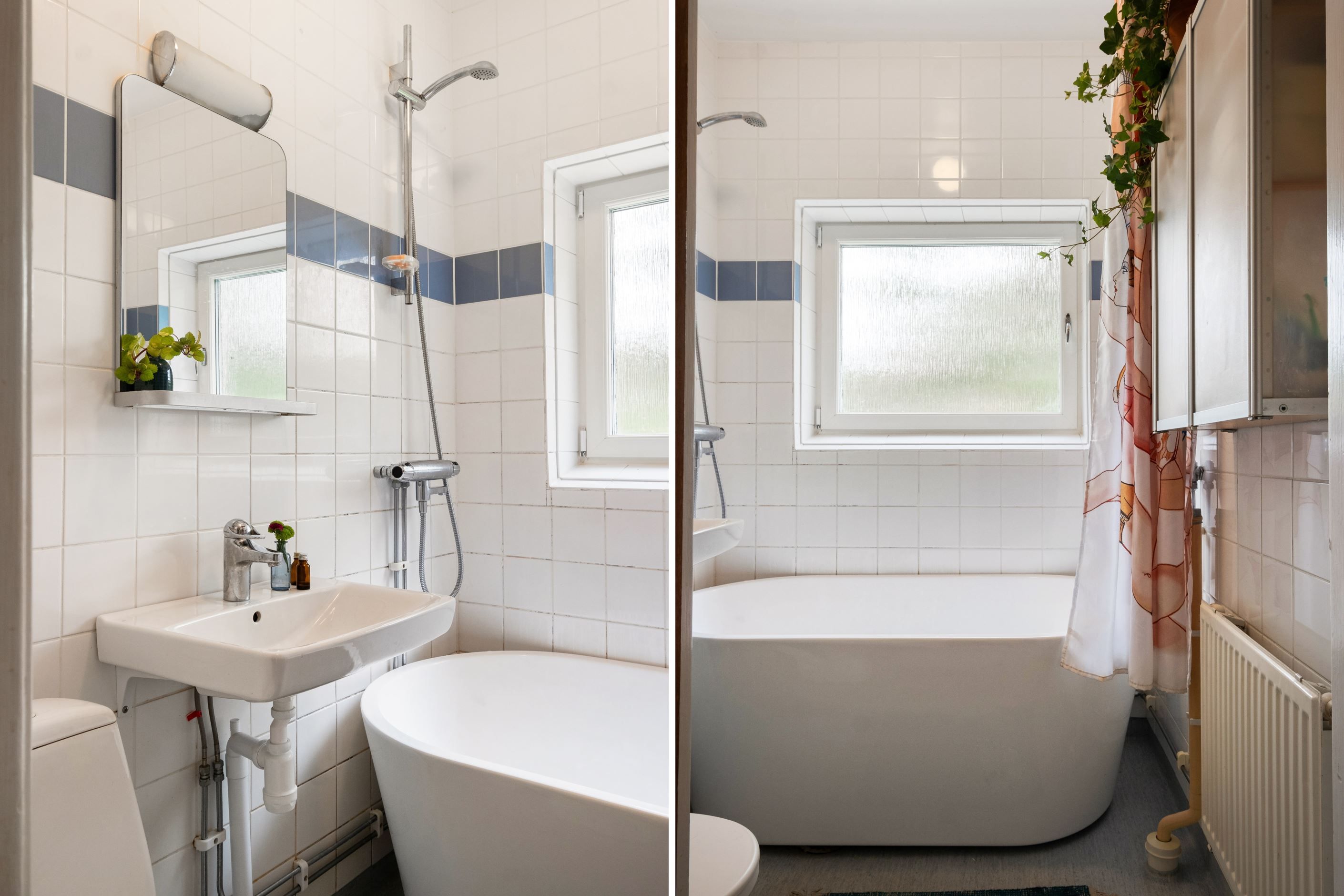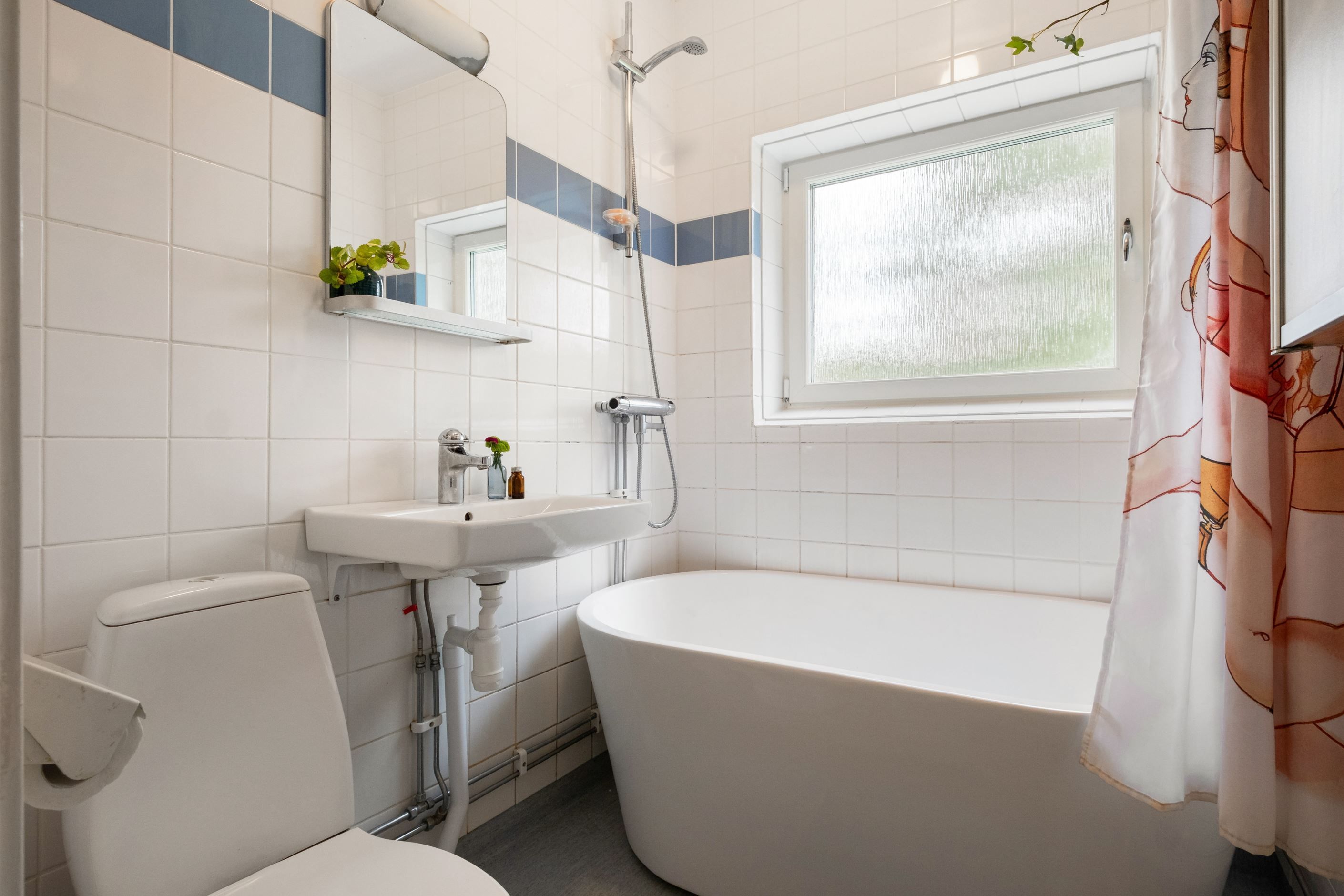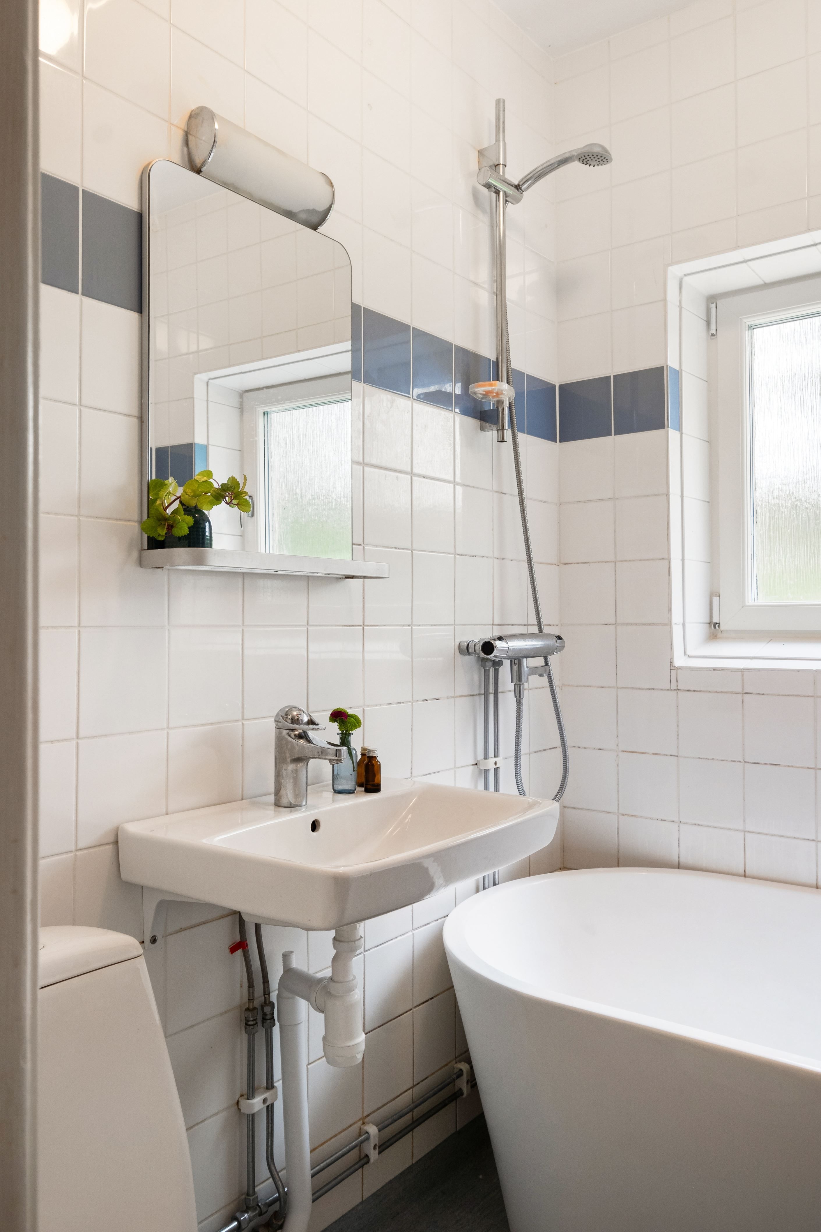 Badrummet är från stambytet 1992/1993 med en ljusblå våtrumsmatta på golv och kaklade väggar i vitt men en blå bård. Här finns badkar, handfat, badrumsskåp, toalett och en uppsatt hylla för extra förvaring ovanför dörren. Vädringsfönstret släpper in gott om naturligt ljus.