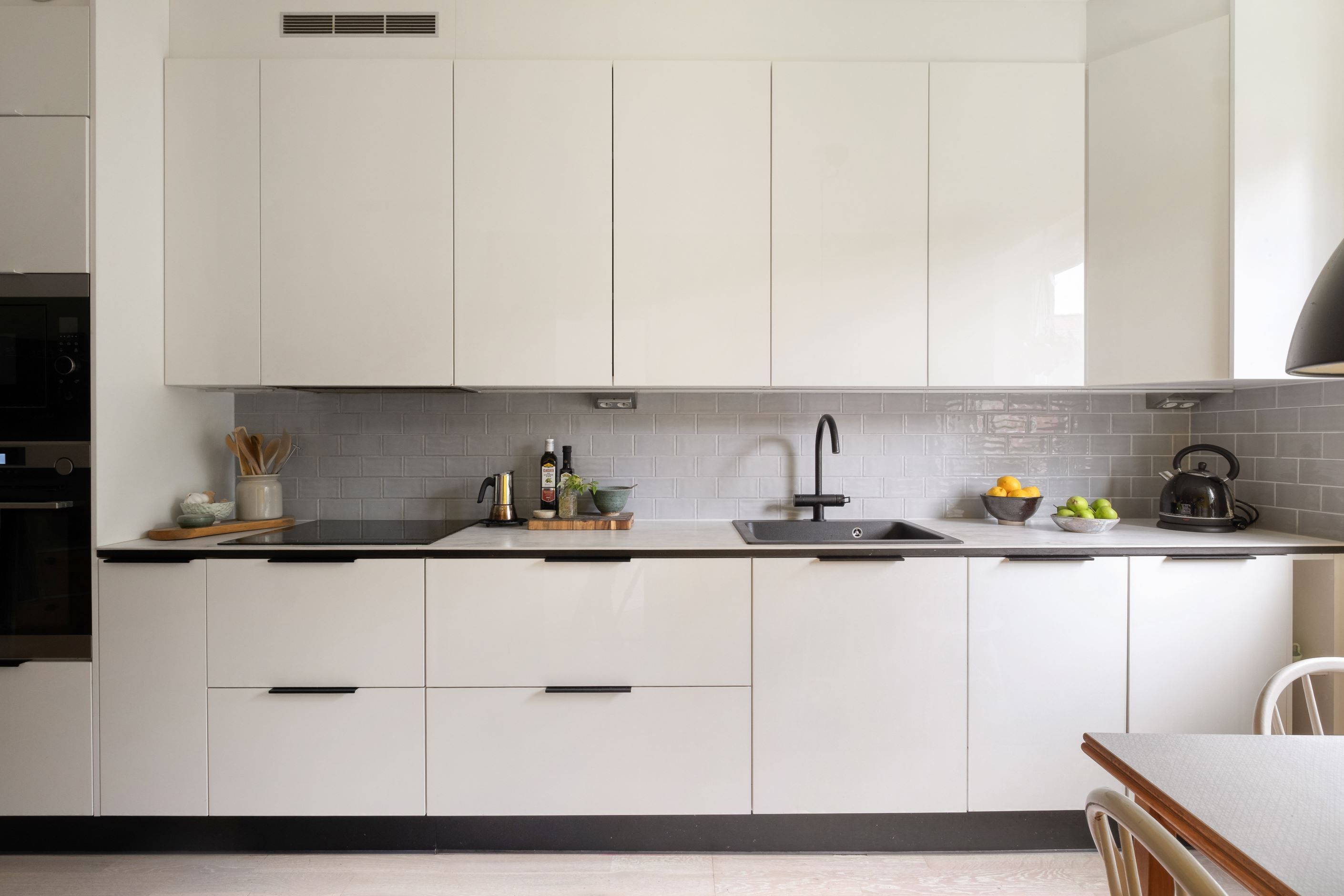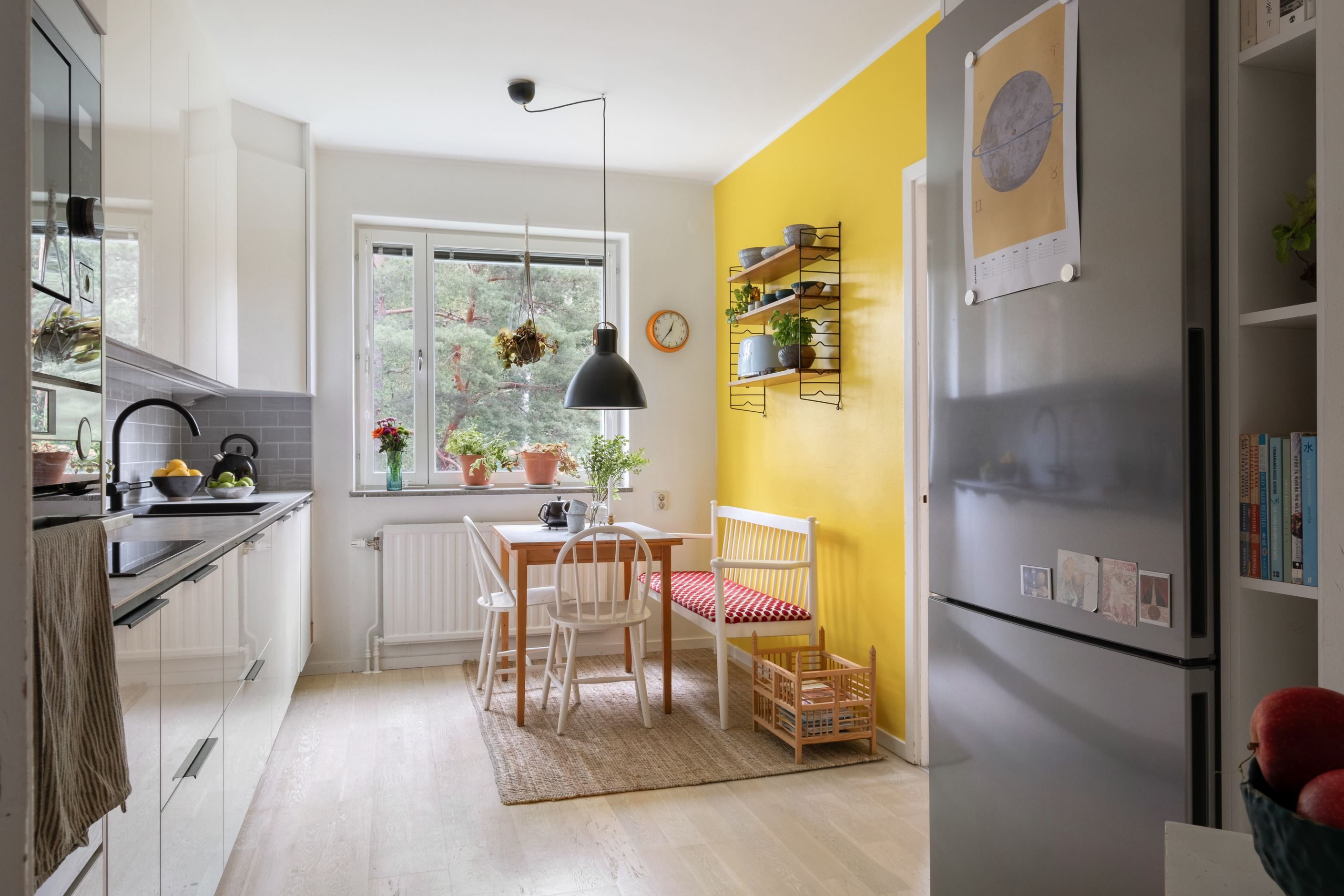 Den maskinella utrustningen är komplett och består av inbyggd ugn och mikro från AEG, induktionshäll, 45-cm diskmaskin från Electrolux samt en rejäl 70-cm kyl/frys från Siemens. Alla vitvaror är från 2019 i samband med köksrenoveringen.