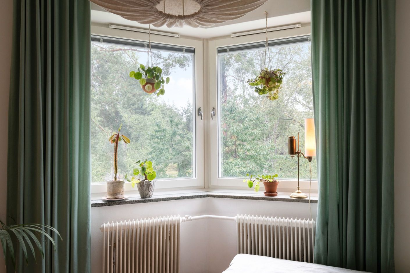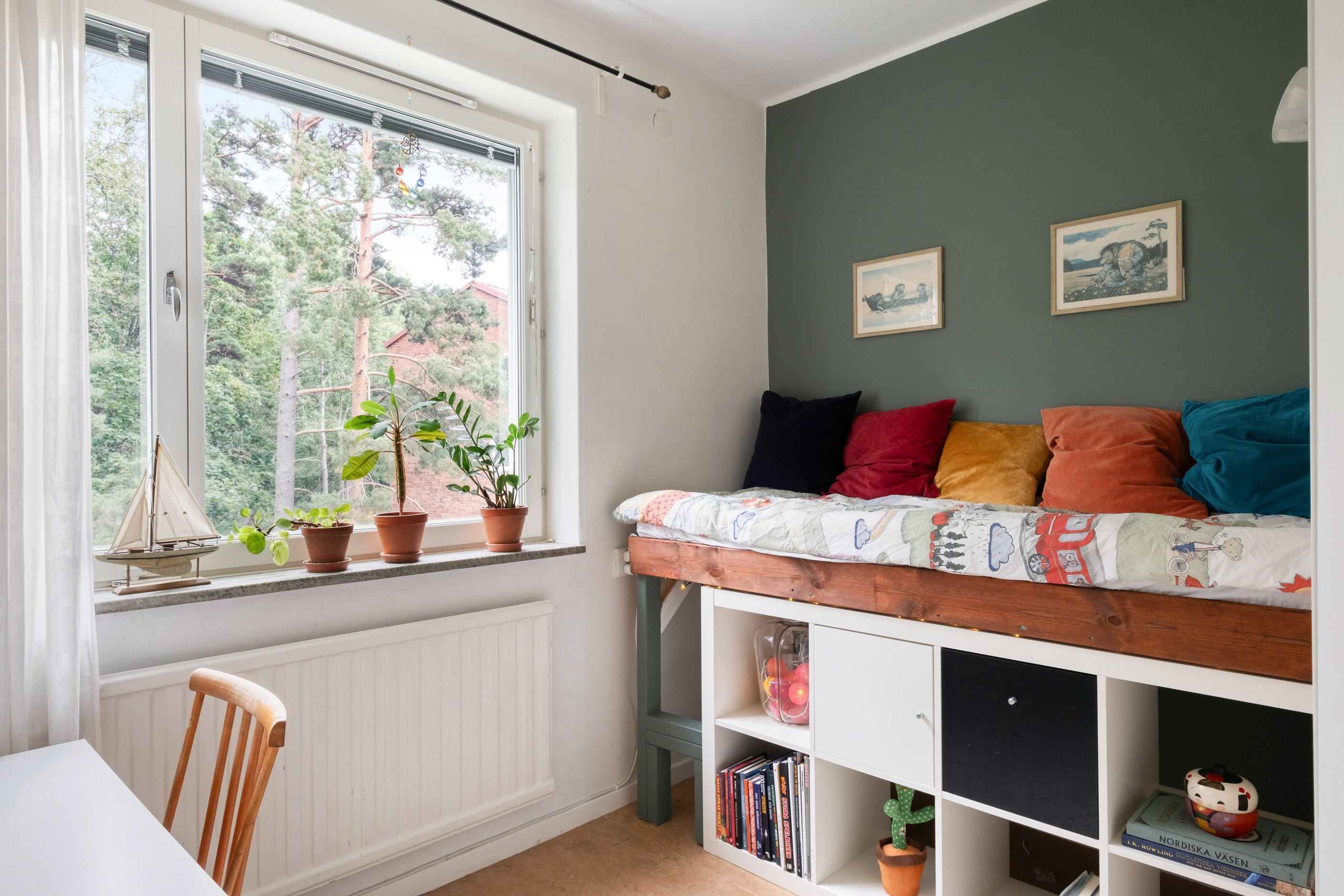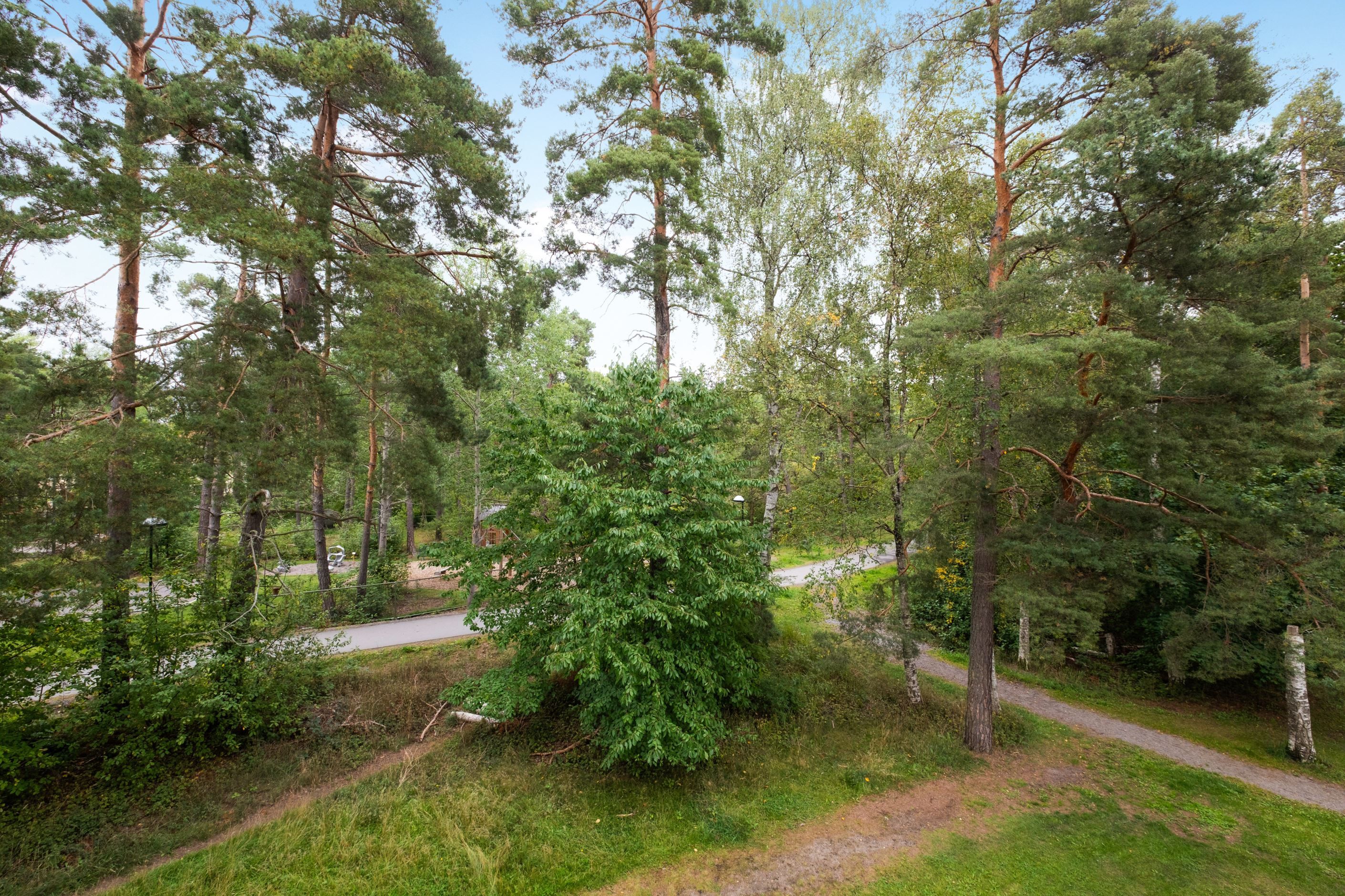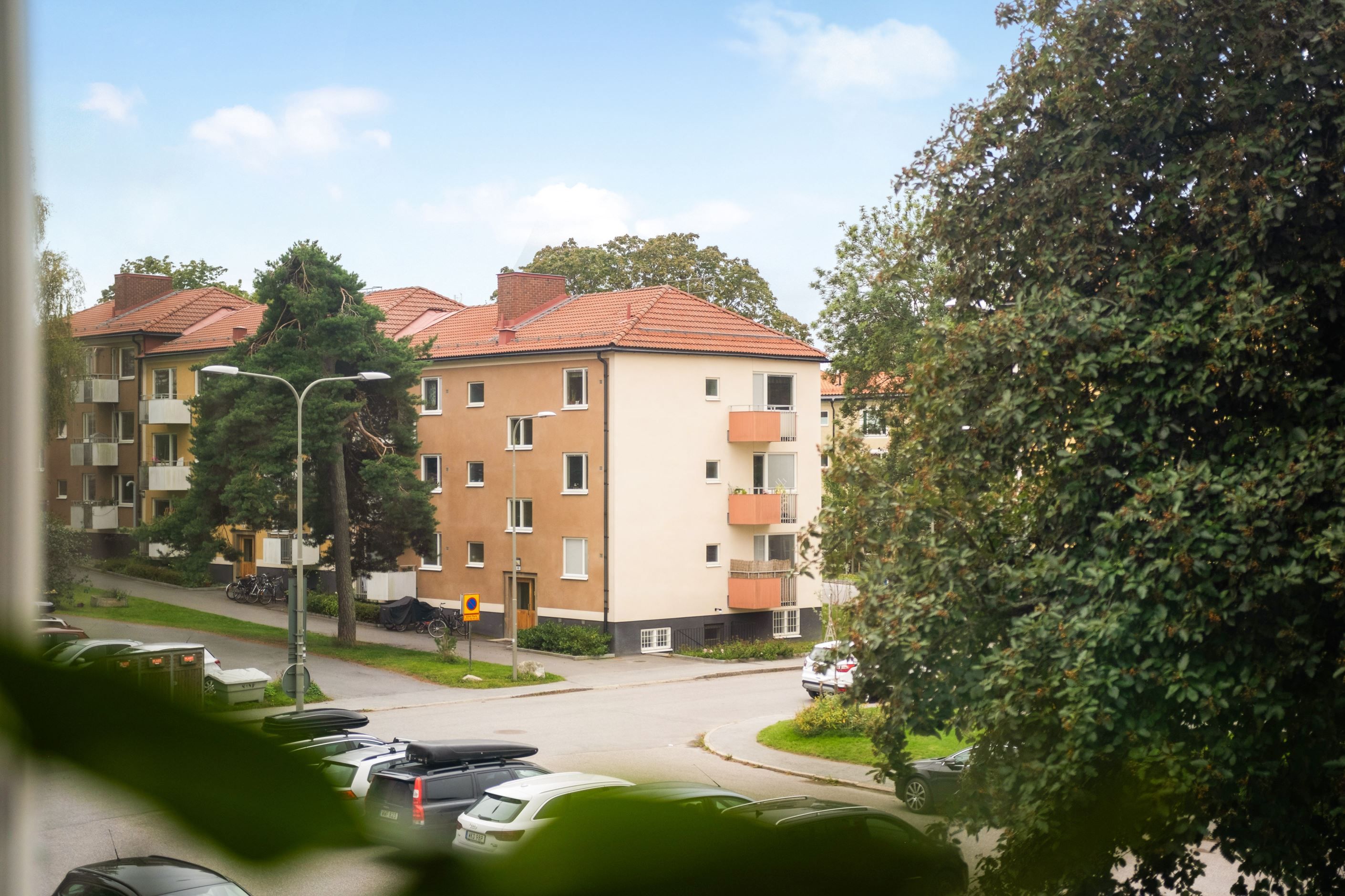 Lägenheten har ett högt läge huset, fritt från direkt insyn och med goda ljusinsläpp från tre väderstreck med fin utsikt över både gården utanför liksom grönskan intill.