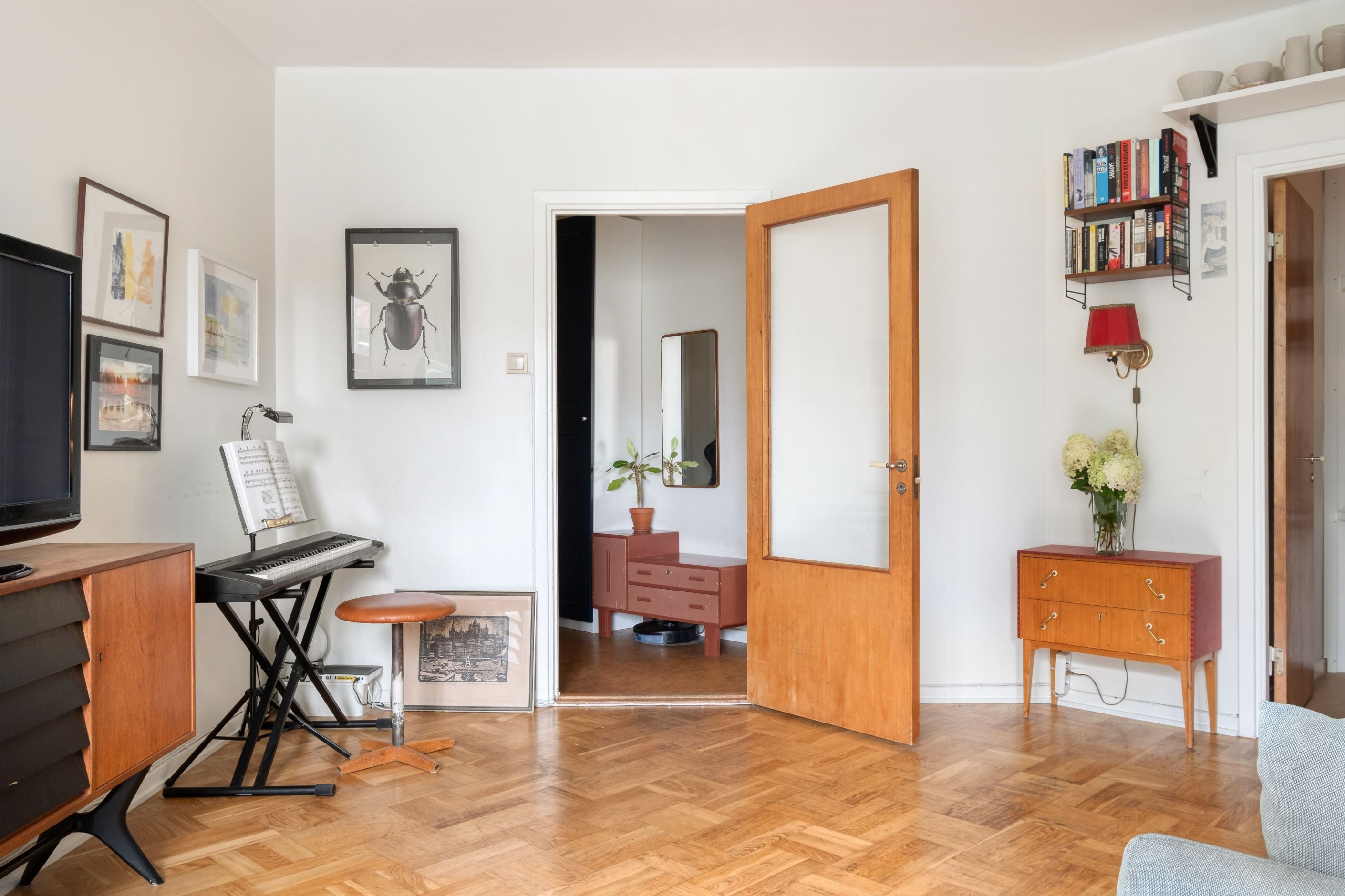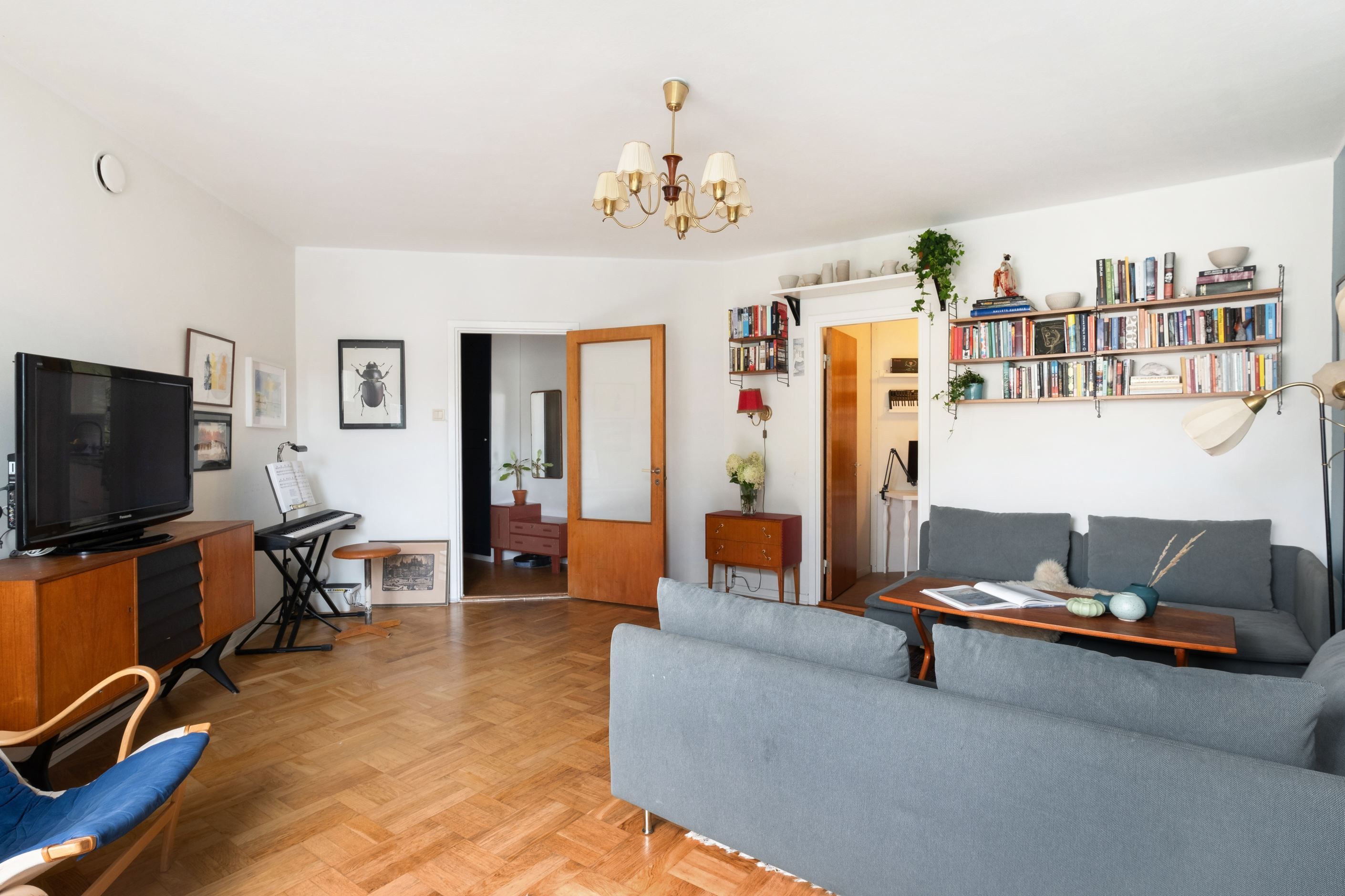 I det öppna vardagsrummet med originalparkett finns flera intressanta möbleringsalternativ. I vardagsrummet råder bra ljusinsläpp från stora fönster och fransk balkong som vetter mot en lugn återvändsgränd.