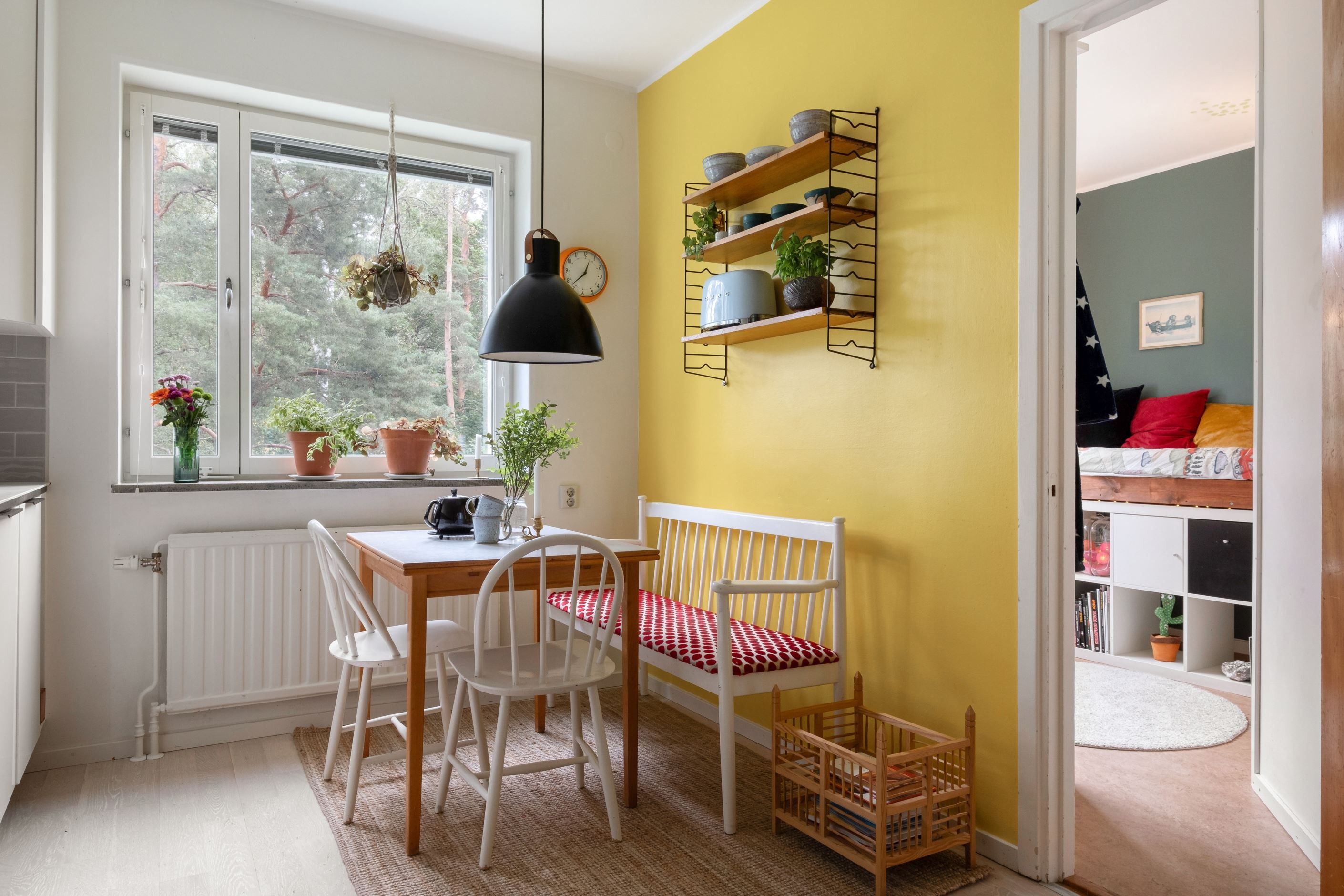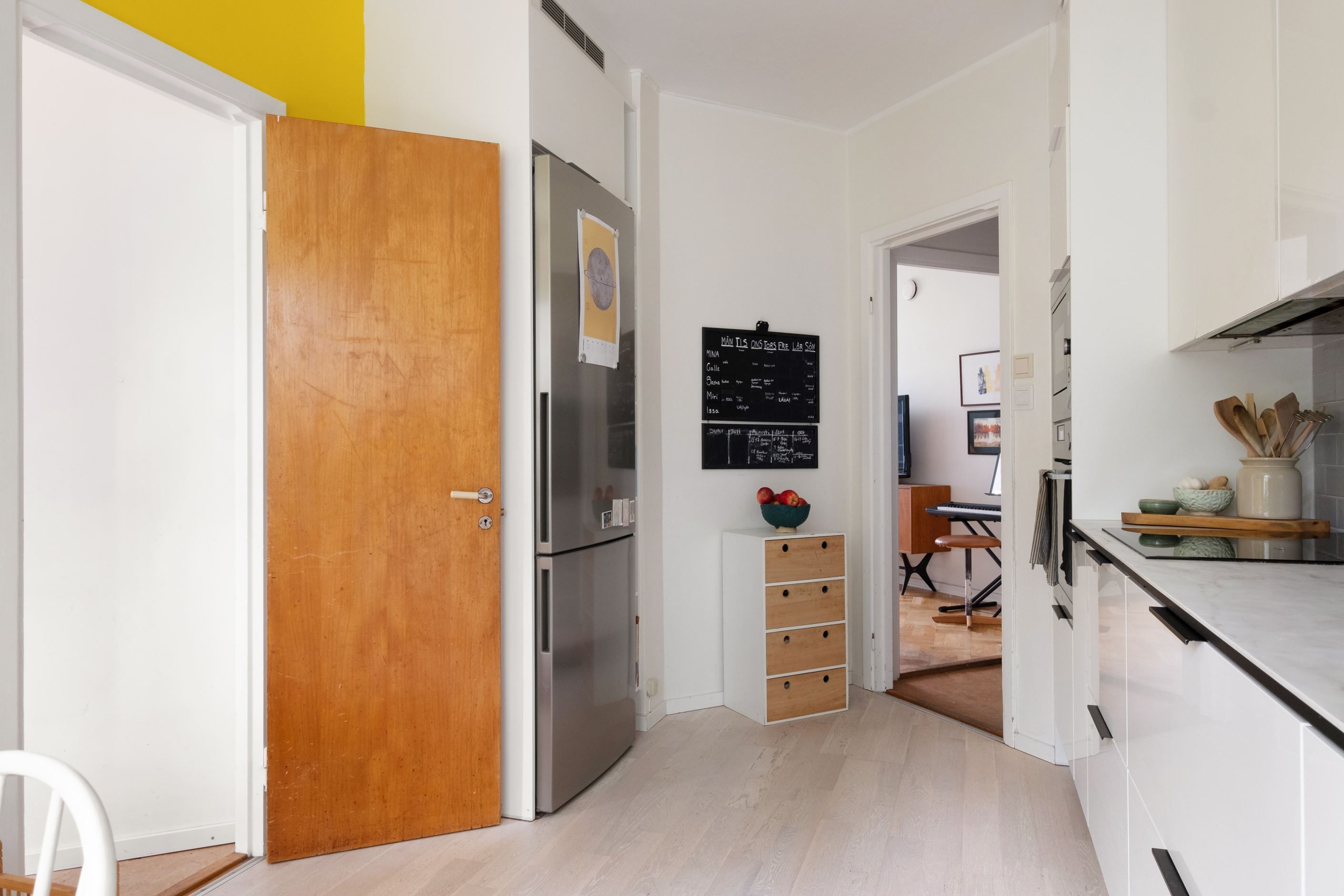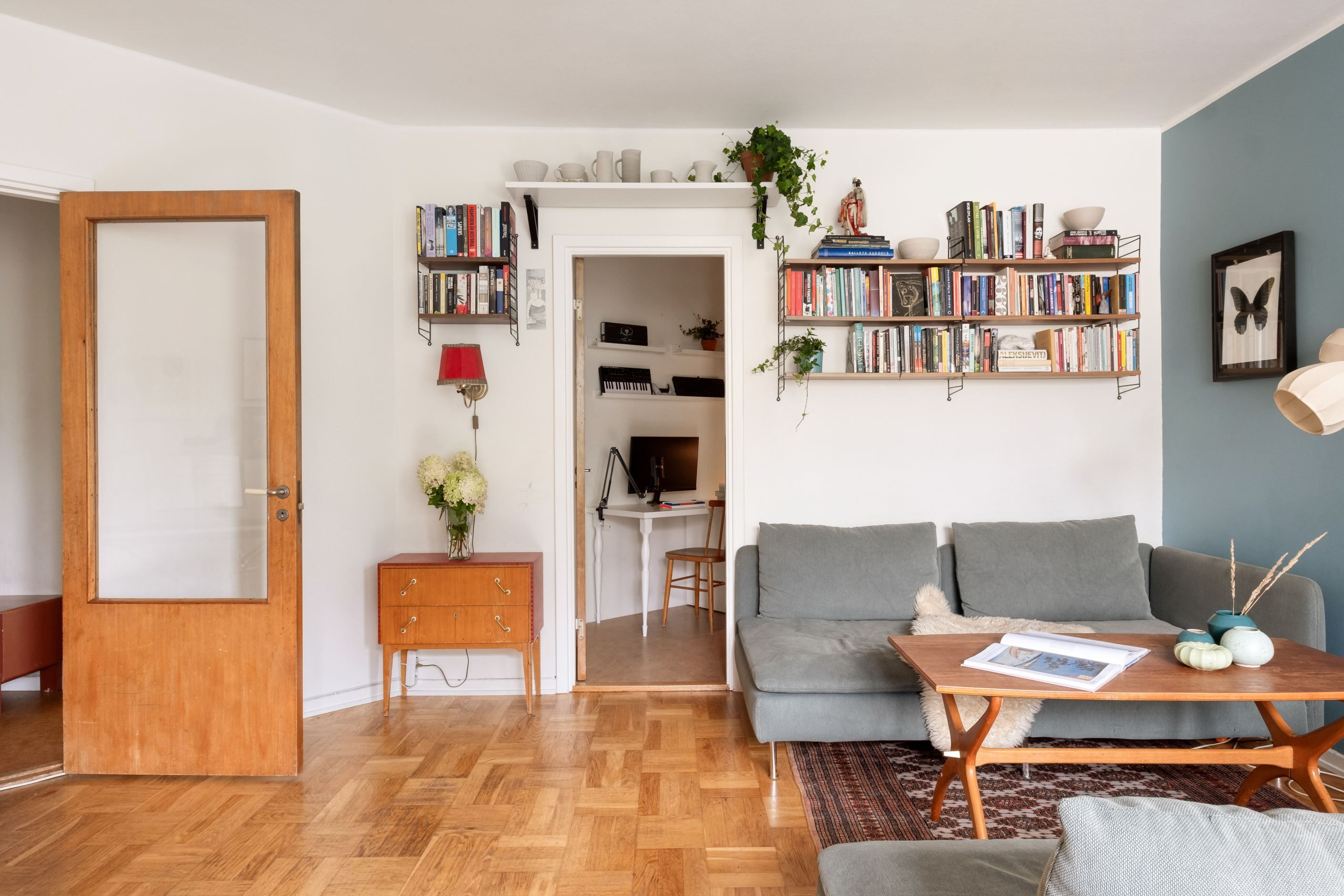 Väggarna är målade i två olika nyanser och på golvet ligger en vitpigmenterad 2-stavsparkett.