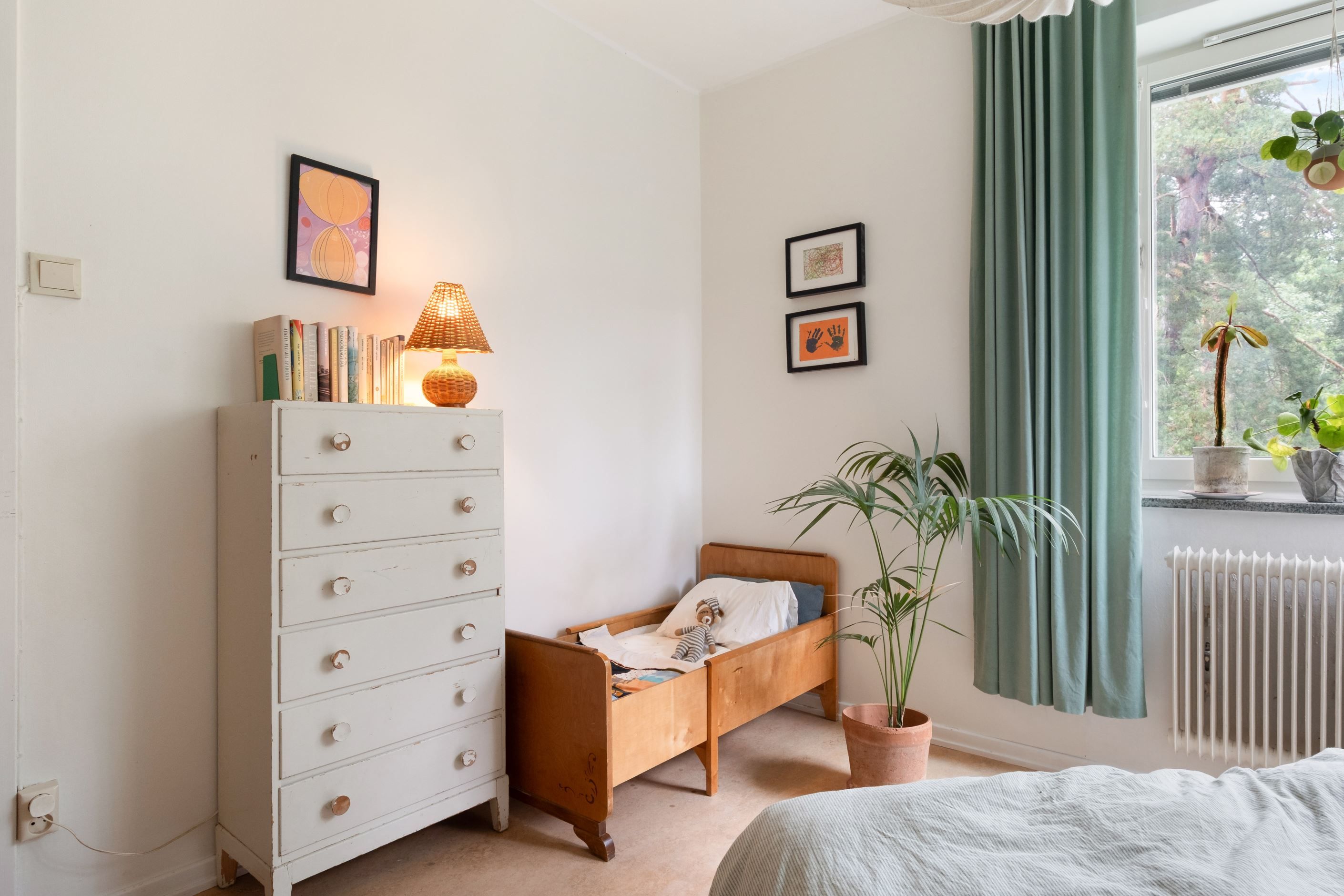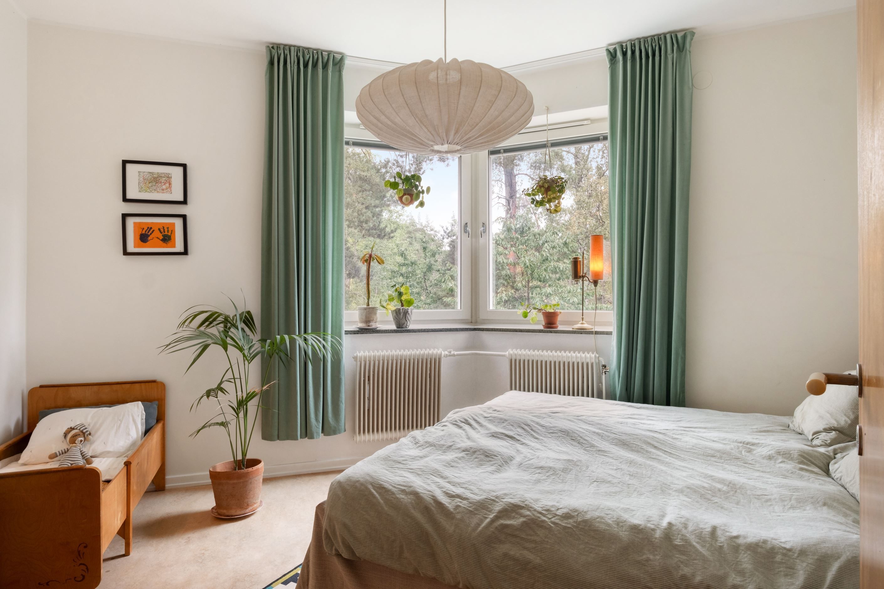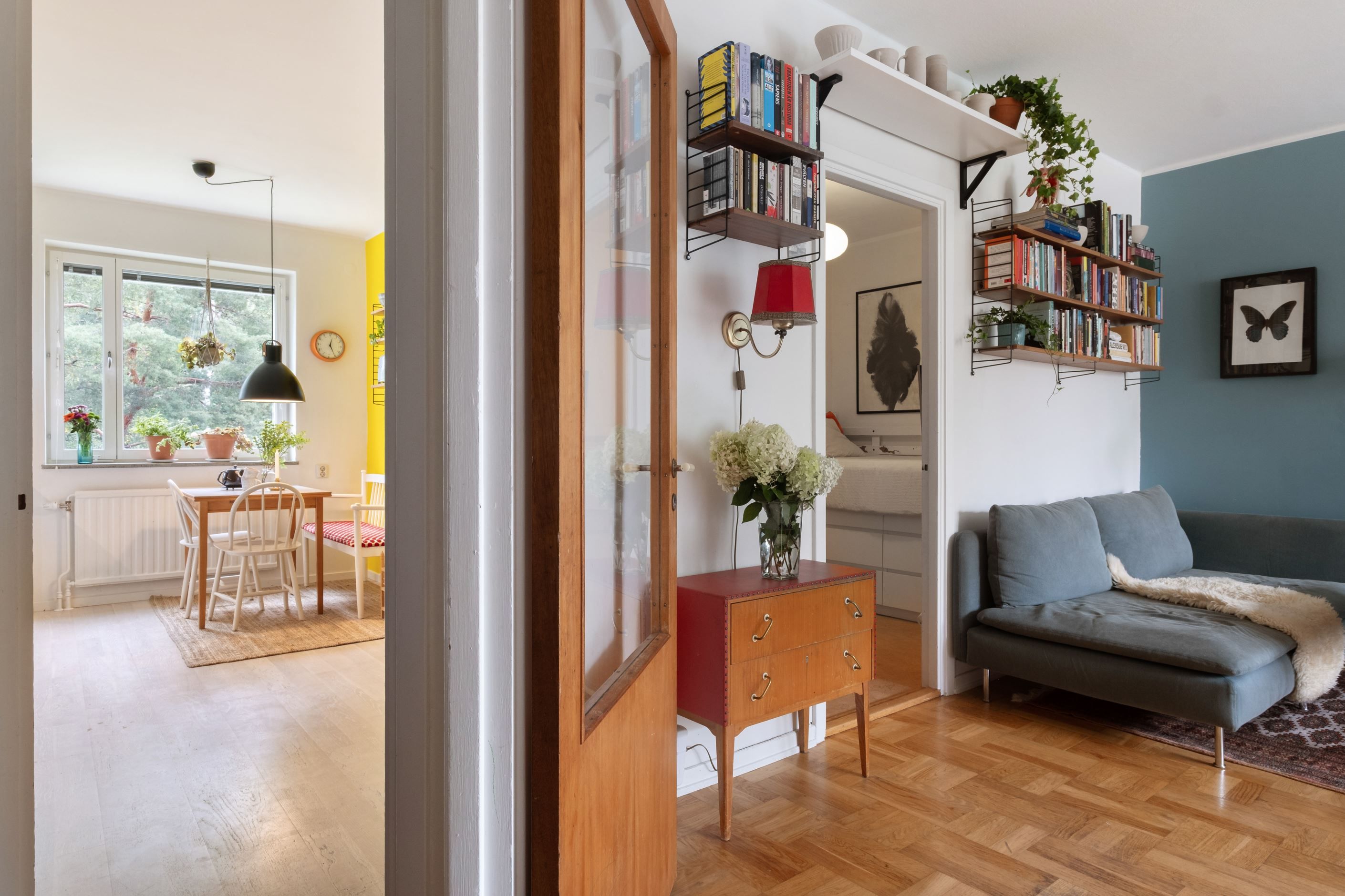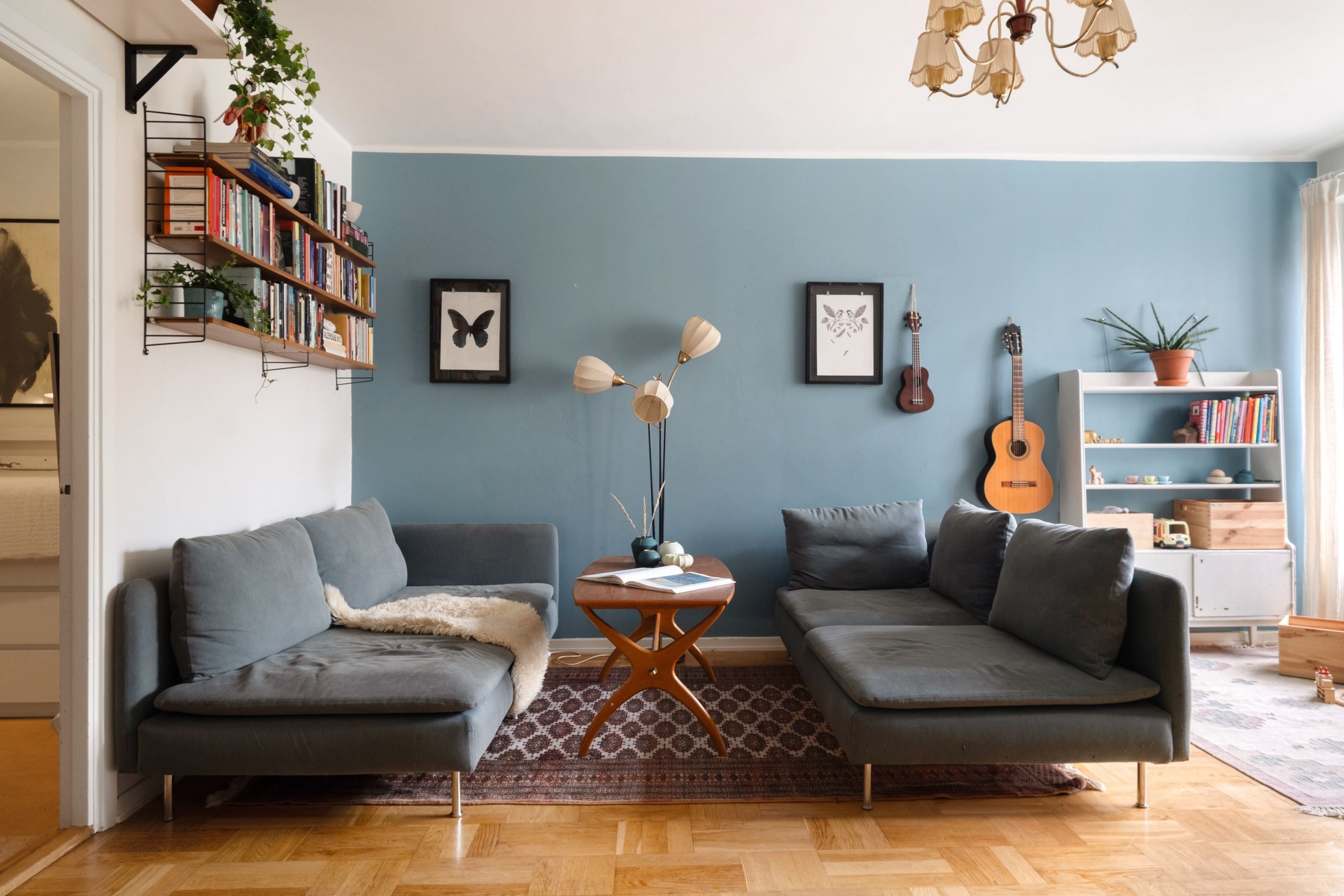 Väggarna är målade i två olika nyanser och på golvet ligger en vitpigmenterad 2-stavsparkett.