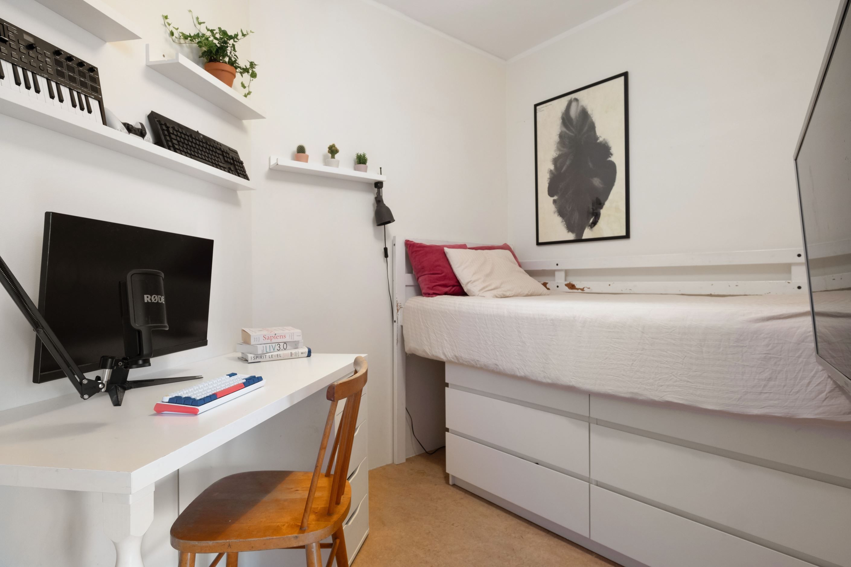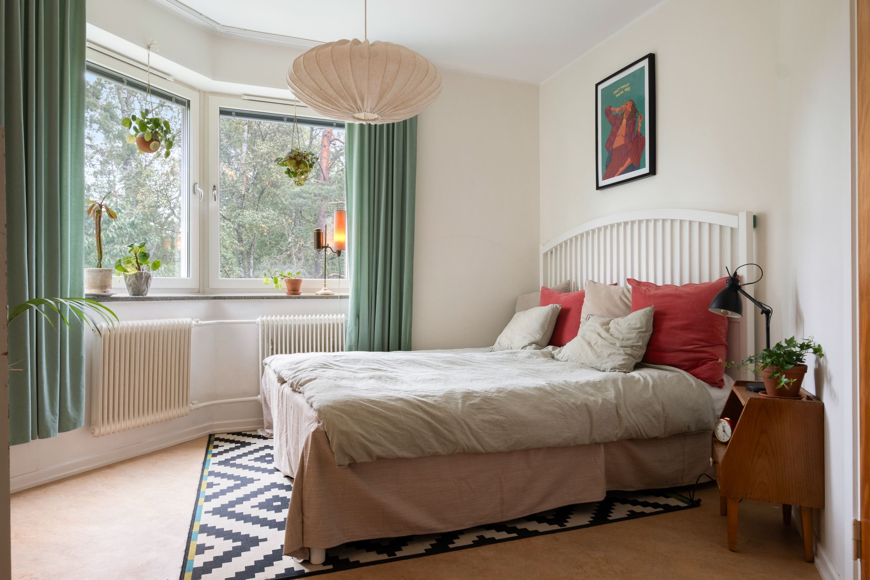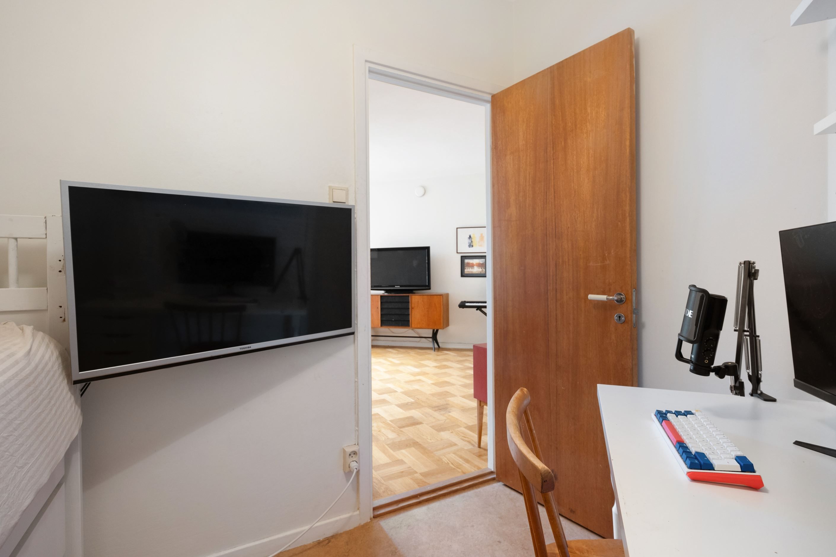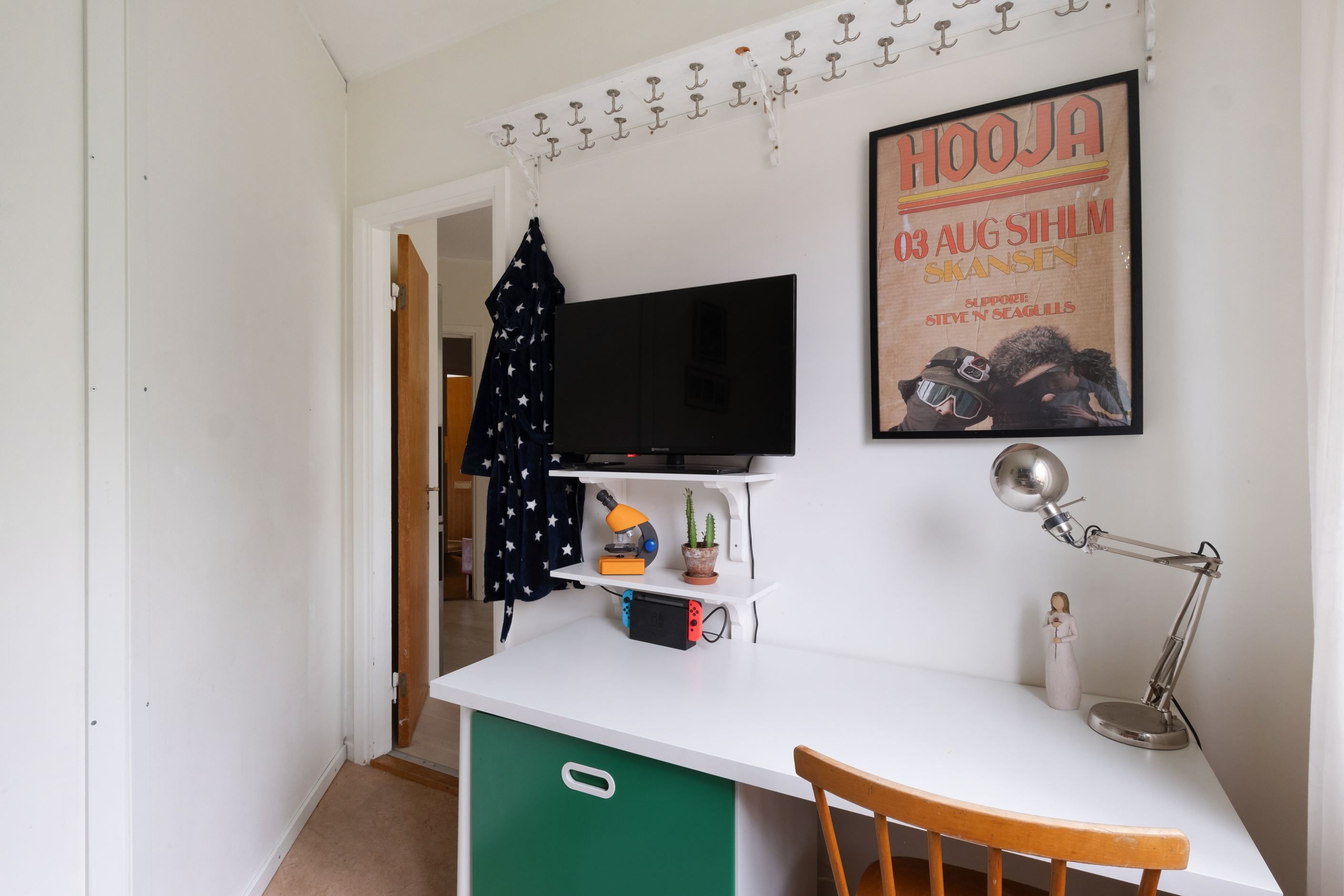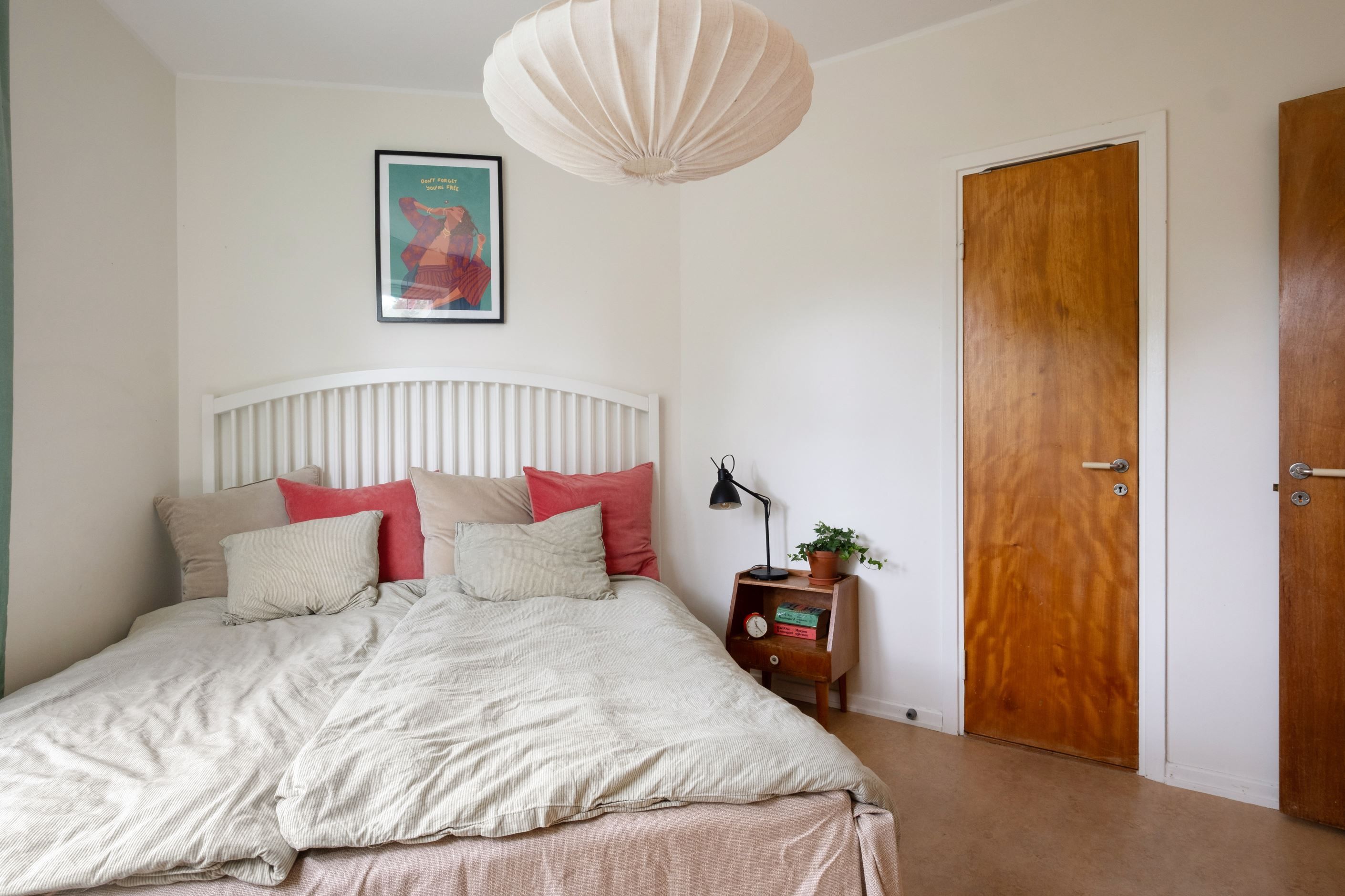 I de båda sovrummen finns ursrprungen gott om plats för större sovrumsmöblemang, det ena sovrummet har delats av till två rum - ett med ingång från köket, det andra rummer nås från vardagsrummet. De två mindre rummen rymmer ett komplett sovrumsmöblemang med en mindre enkelsäng/loft samt nattduks- och skrivbord.