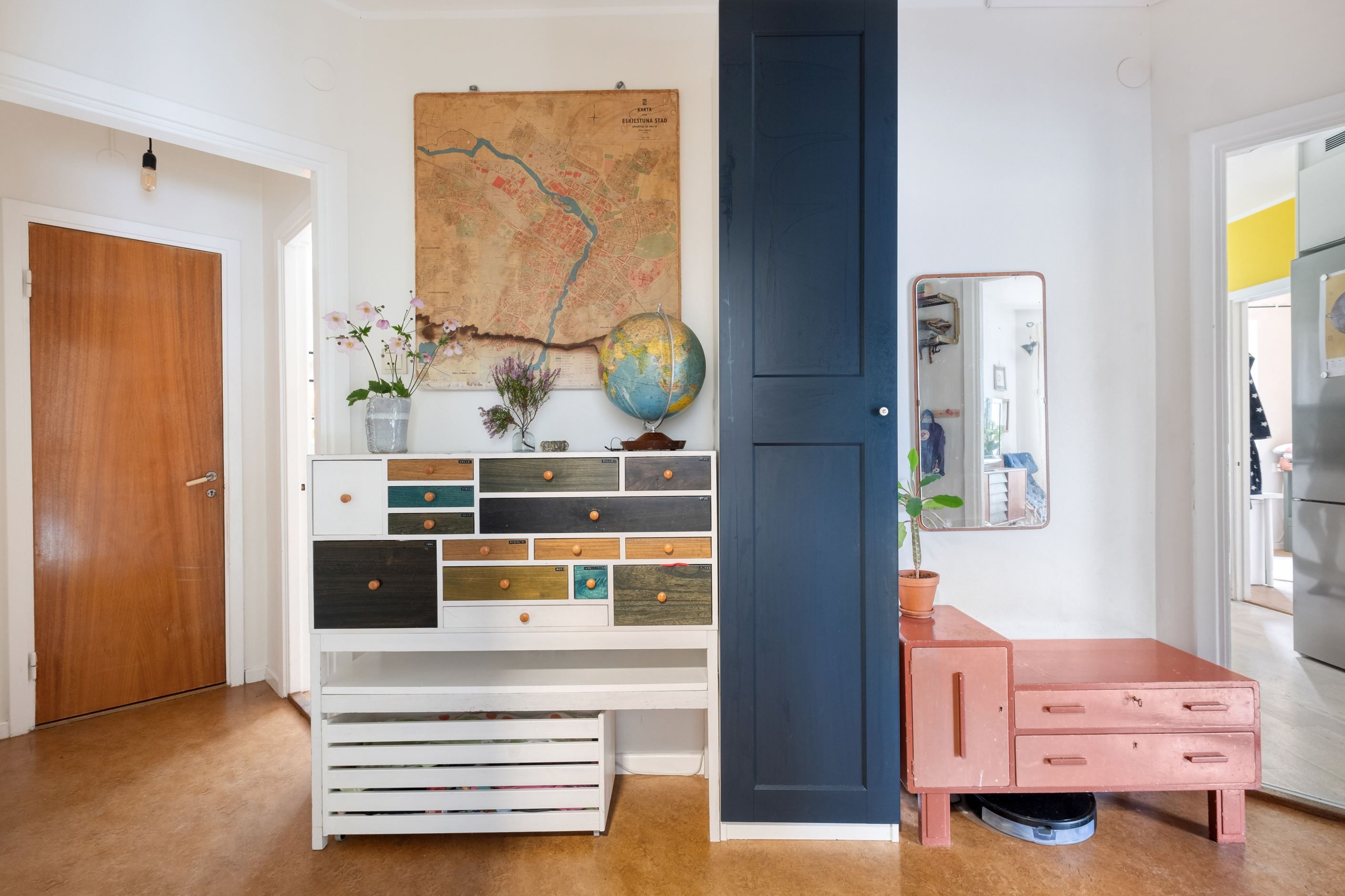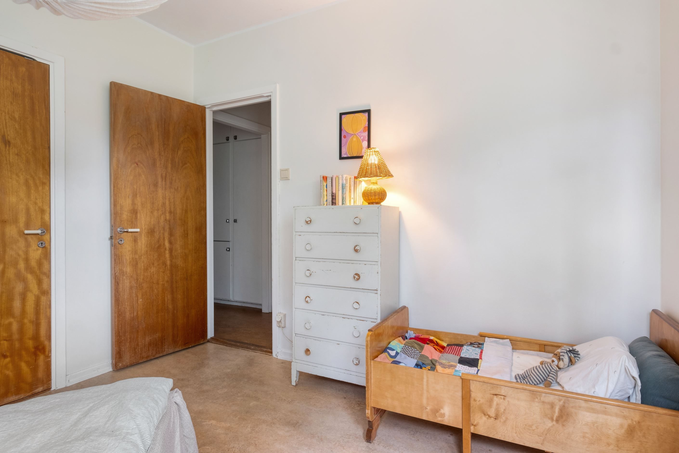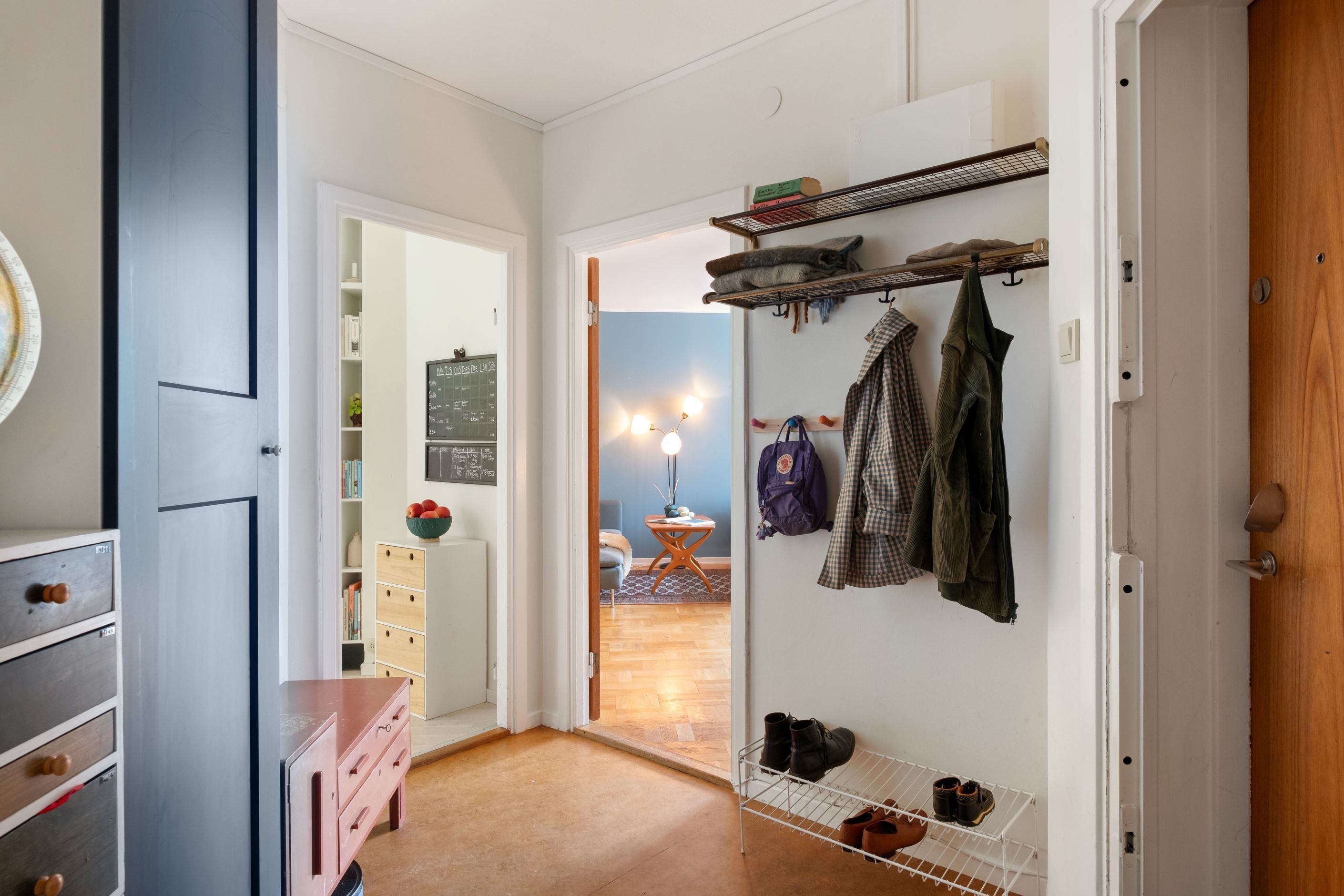 I hall och samtliga sovrum ligger en äldre plast/linoleummatta på golv, väggarna är målade i primärt ljusa kulörer.