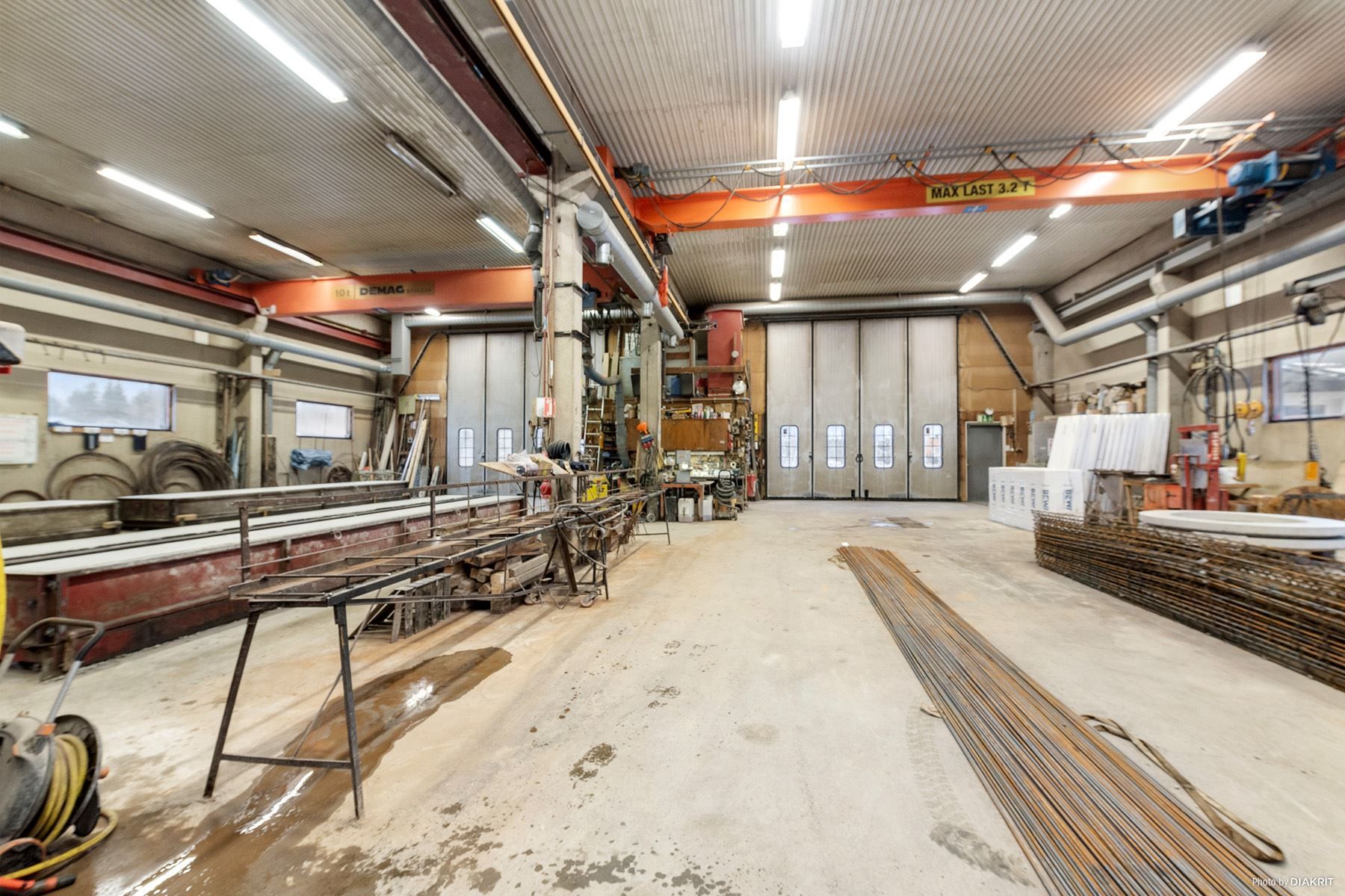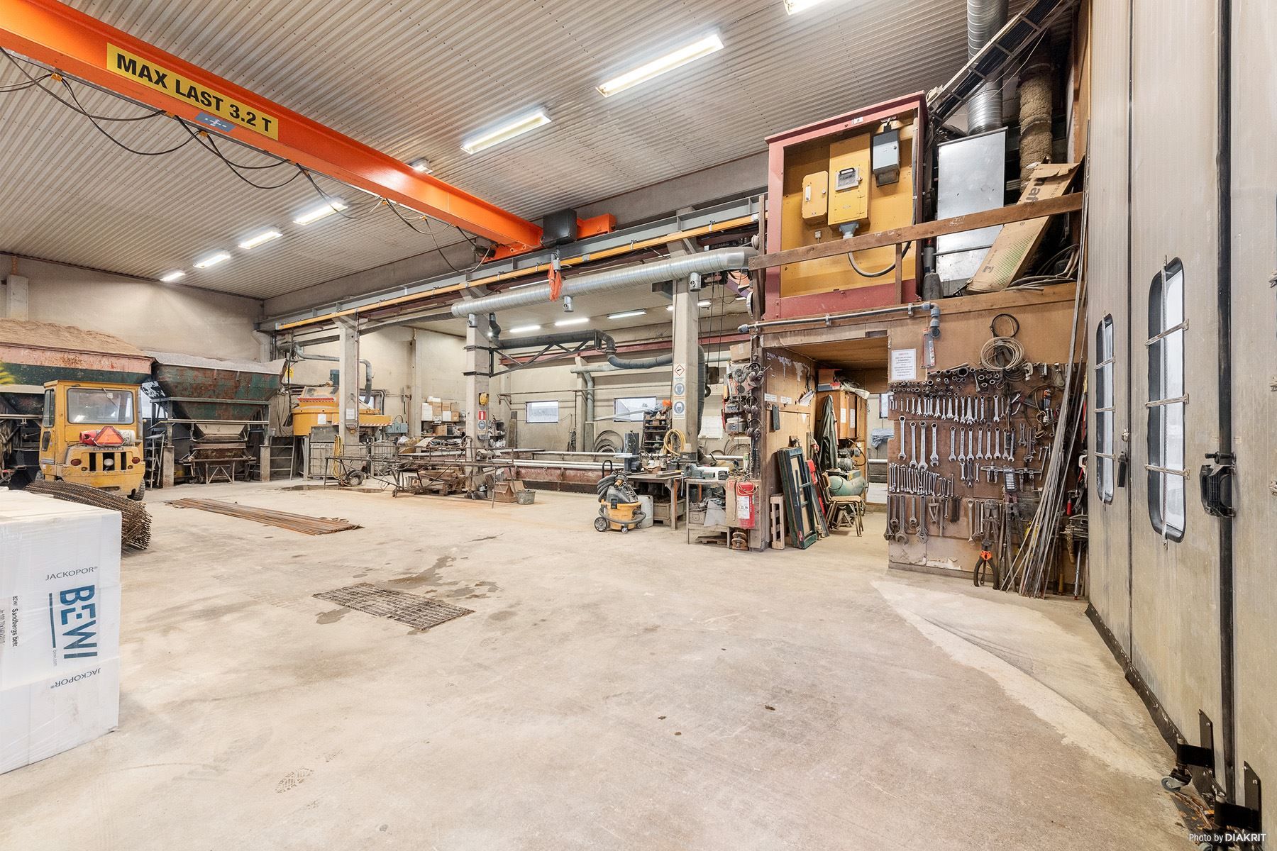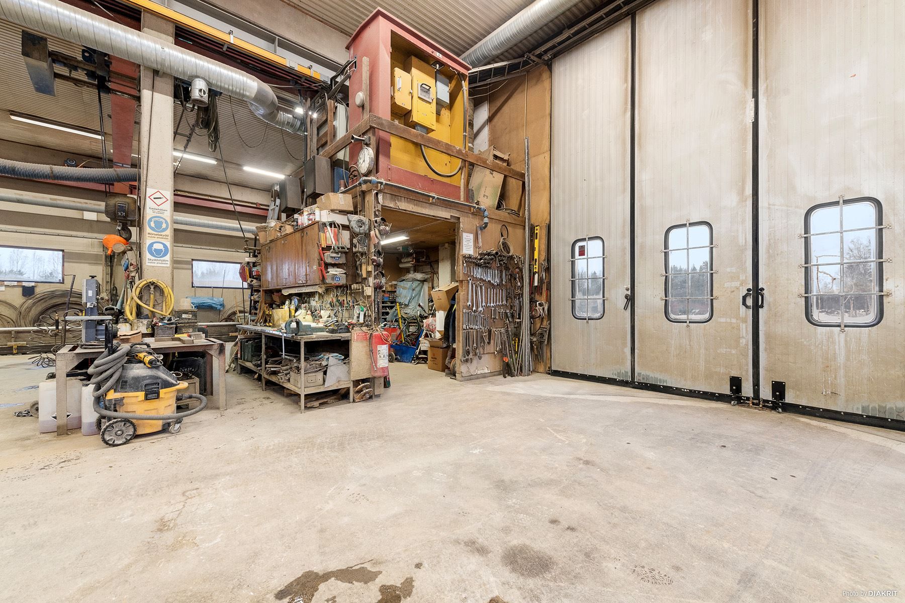 Byggnaden erbjuder rejäl produktionsyta med tilltagen takhöjd. Två traverser, 3,2 ton och 10 ton. Oljeavskiljare. Två stora garageportar om 5x5 meter. Uppvärmning sker genom vattenburen golvvärme via fjärrvärme och oljefyllda el-element. Mekanisk ventilation med återvinning (FTX).