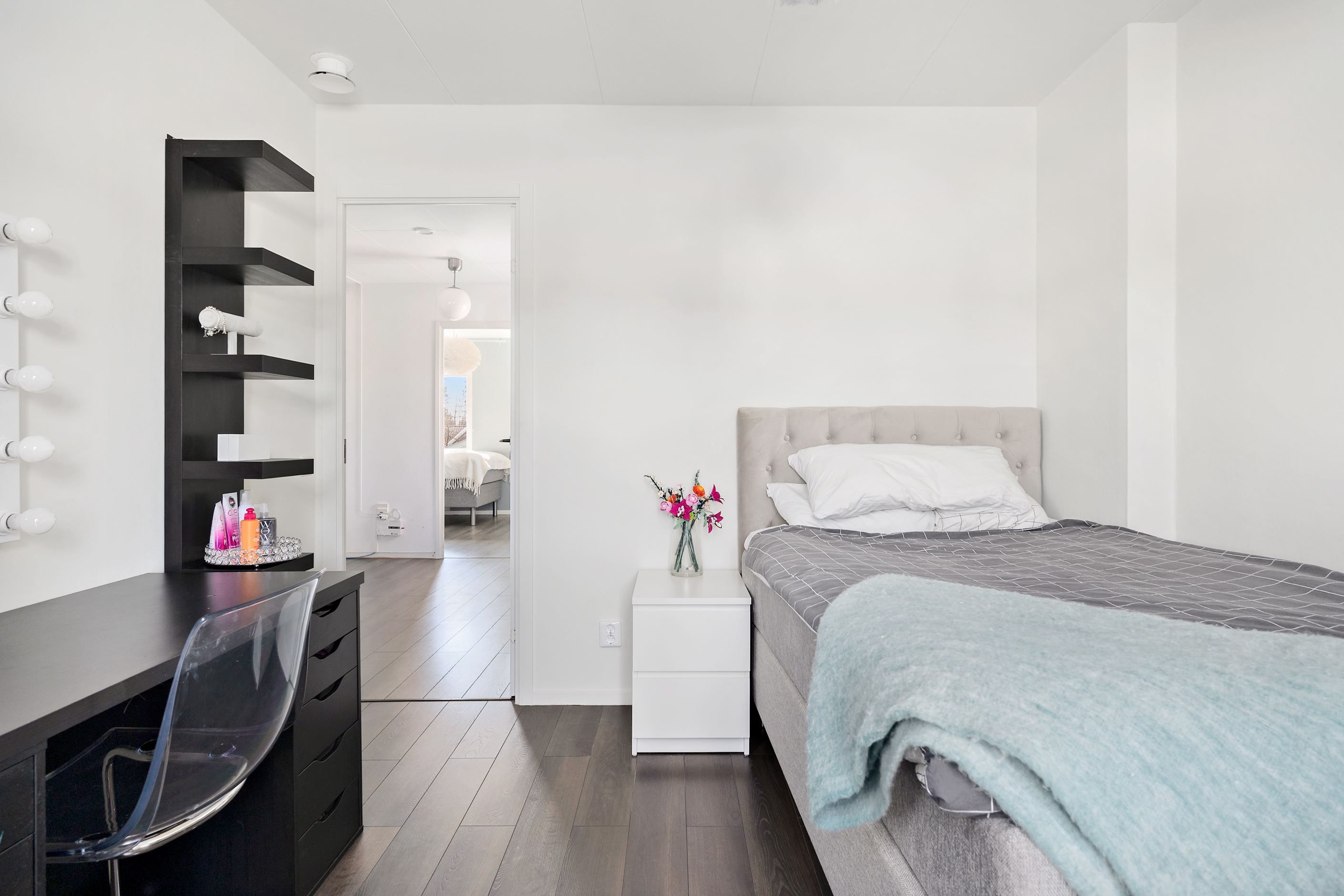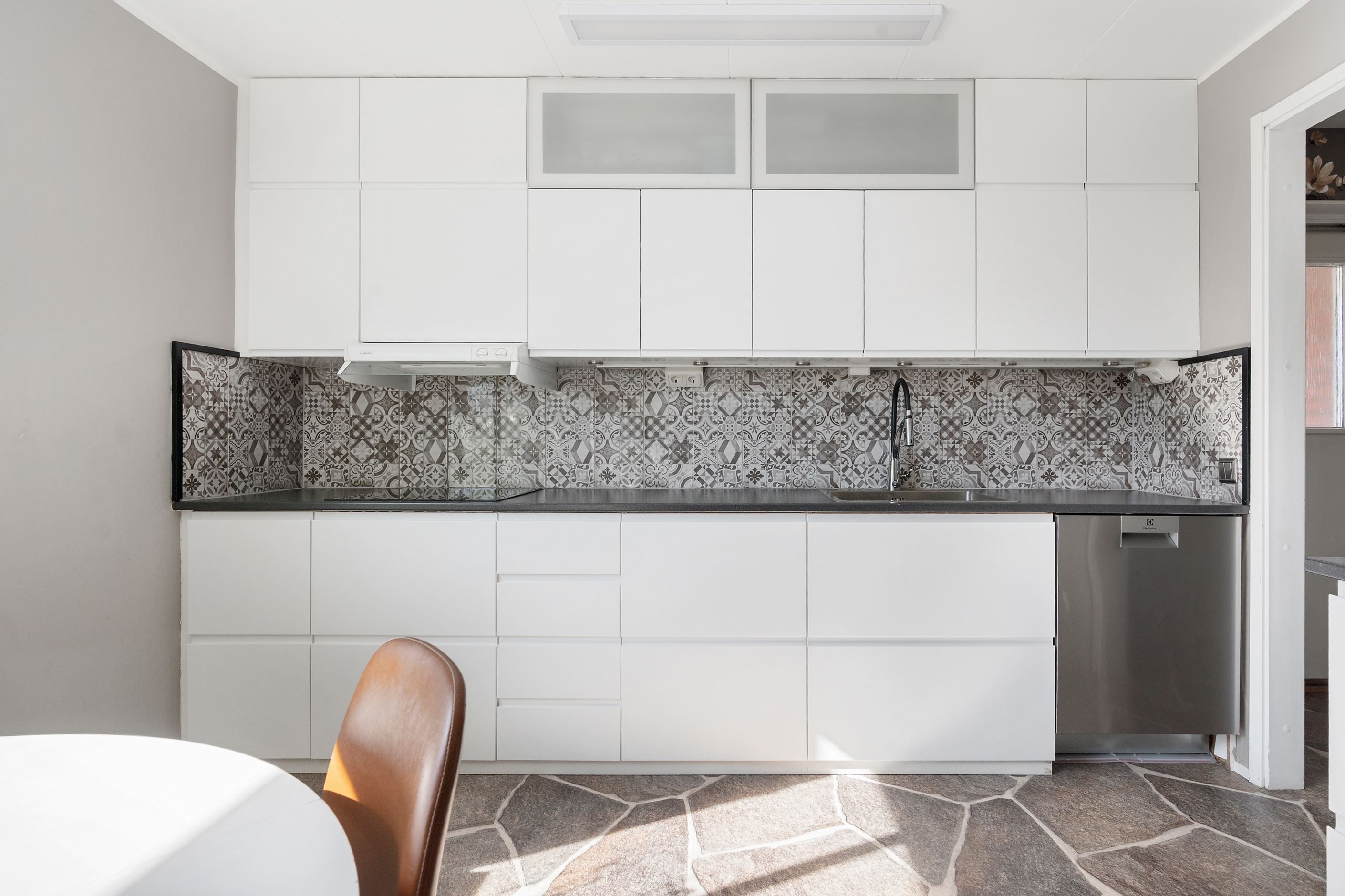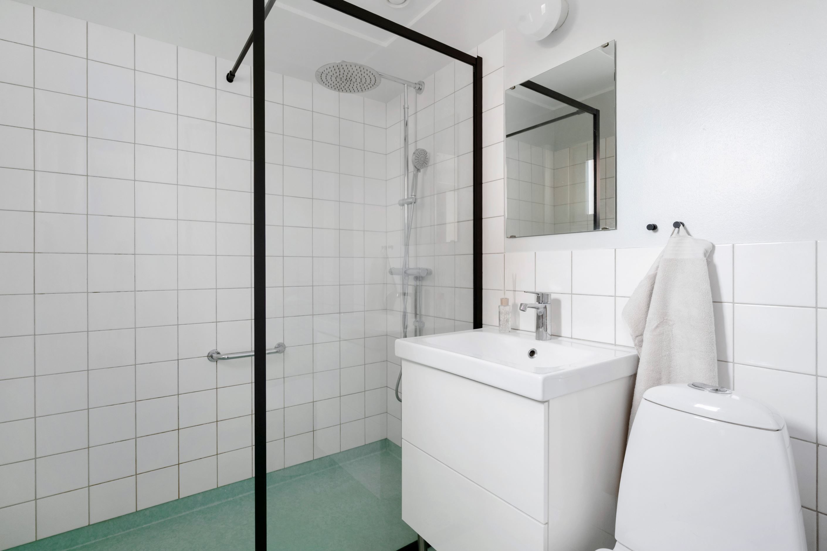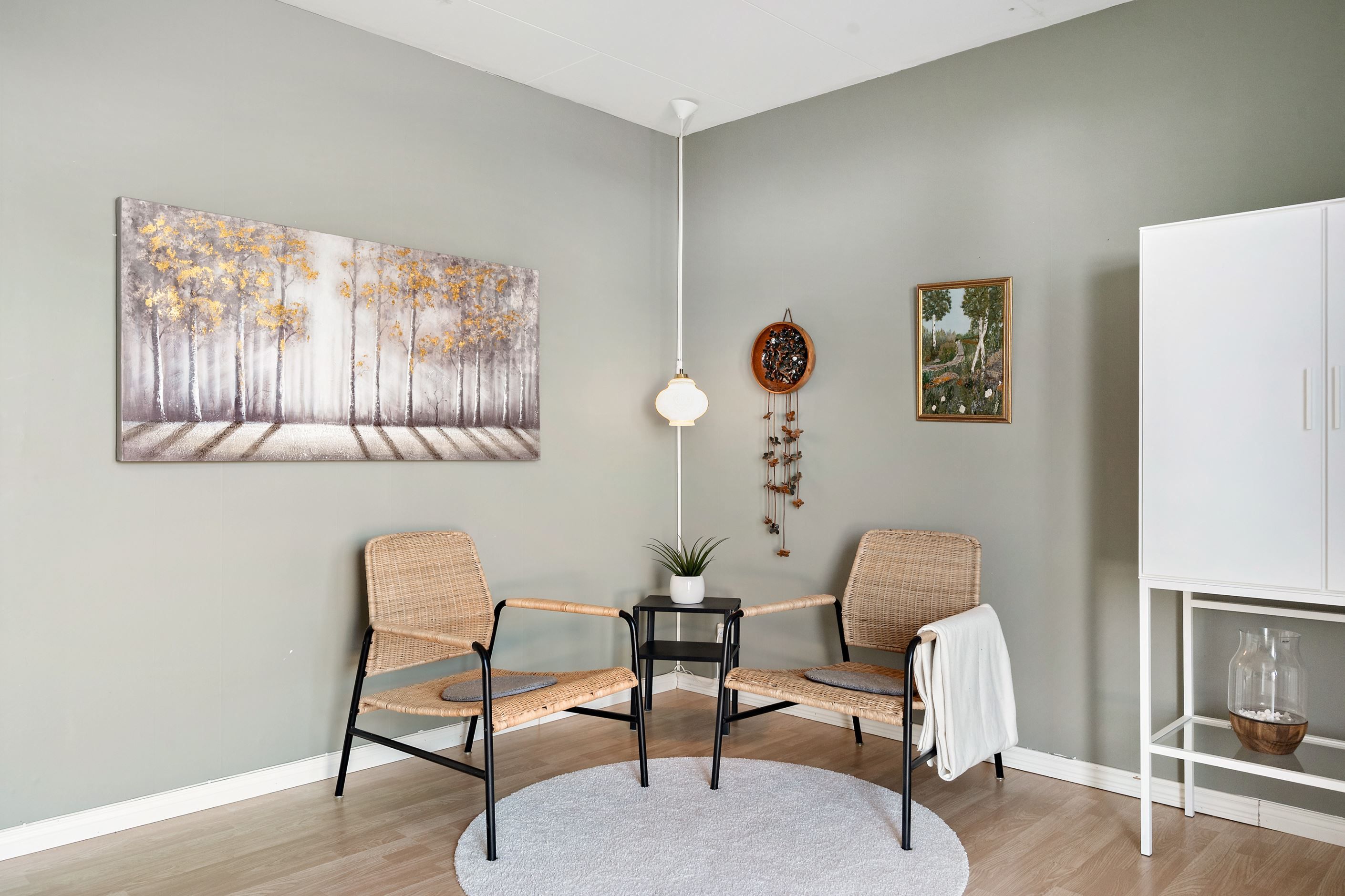 Bostaden erbjuder ett modernt och lättskött hem med genomgående målade ytskikt, stilrent kök med vita luckor och rostfria vitvaror samt två fräscha badrum med nya kommoder och speglar. Planlösningen är smart fördelad med sociala ytor på entréplan och en mer privat sovrumsdel på övre plan.