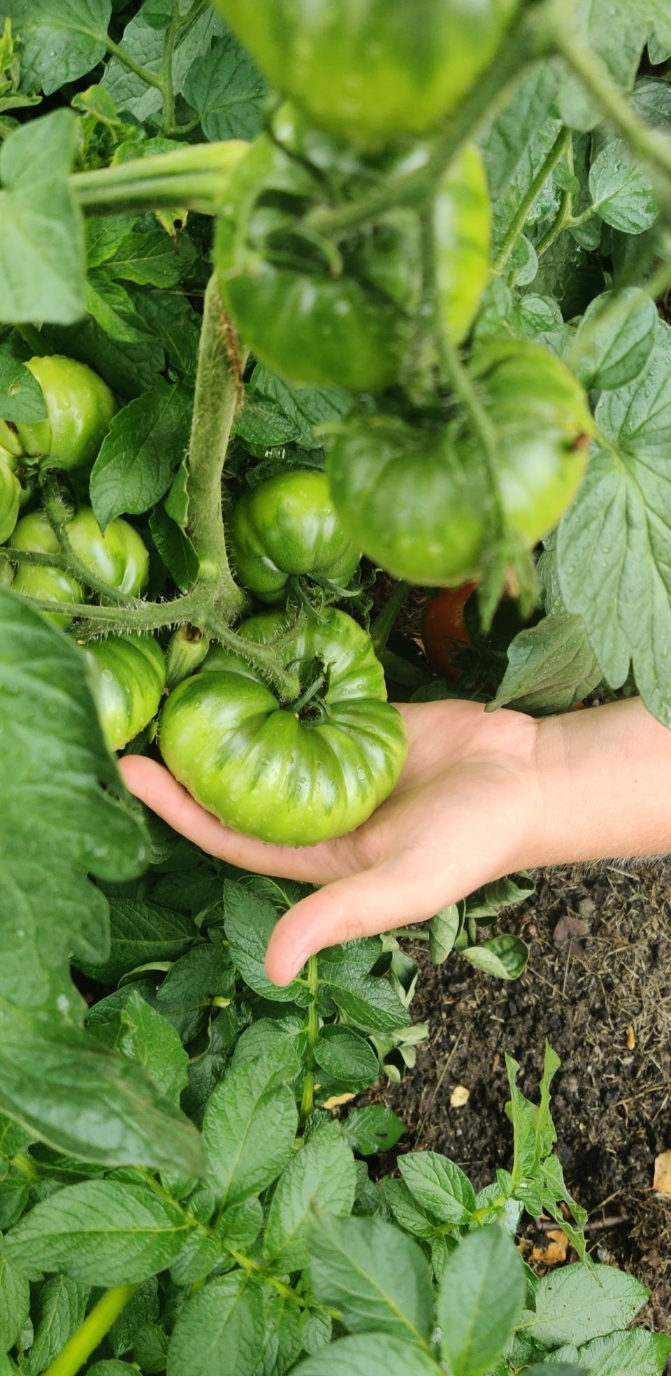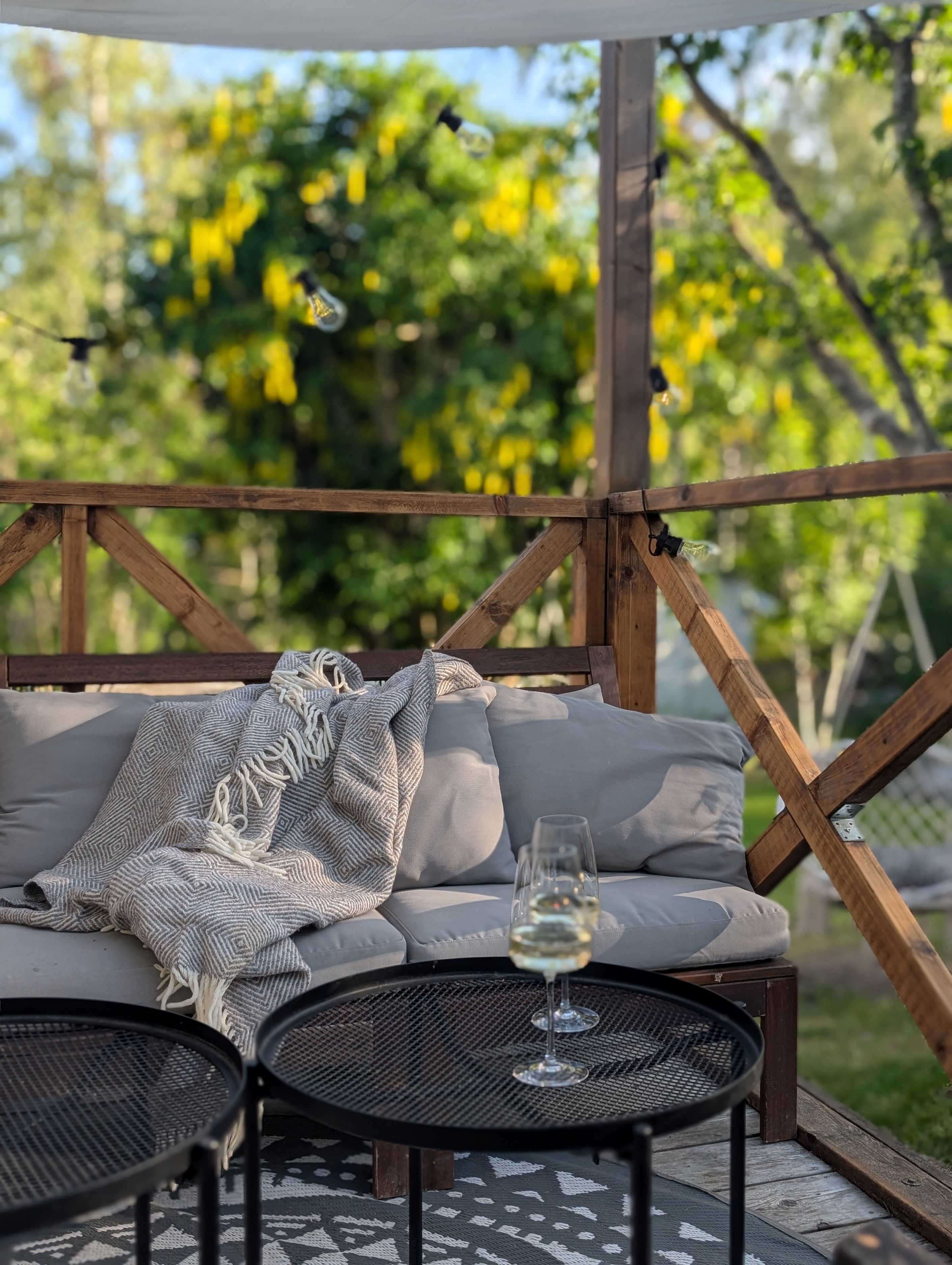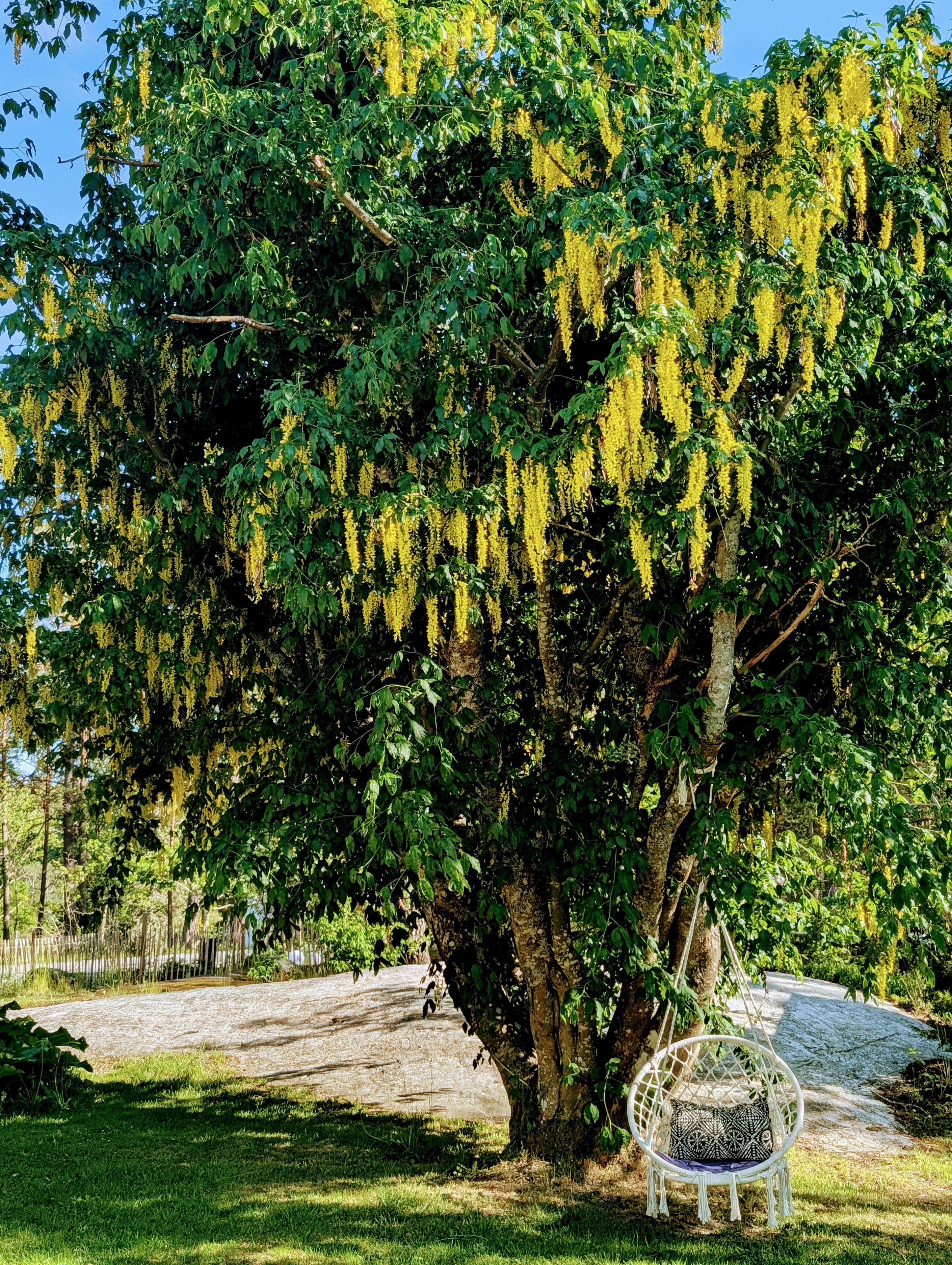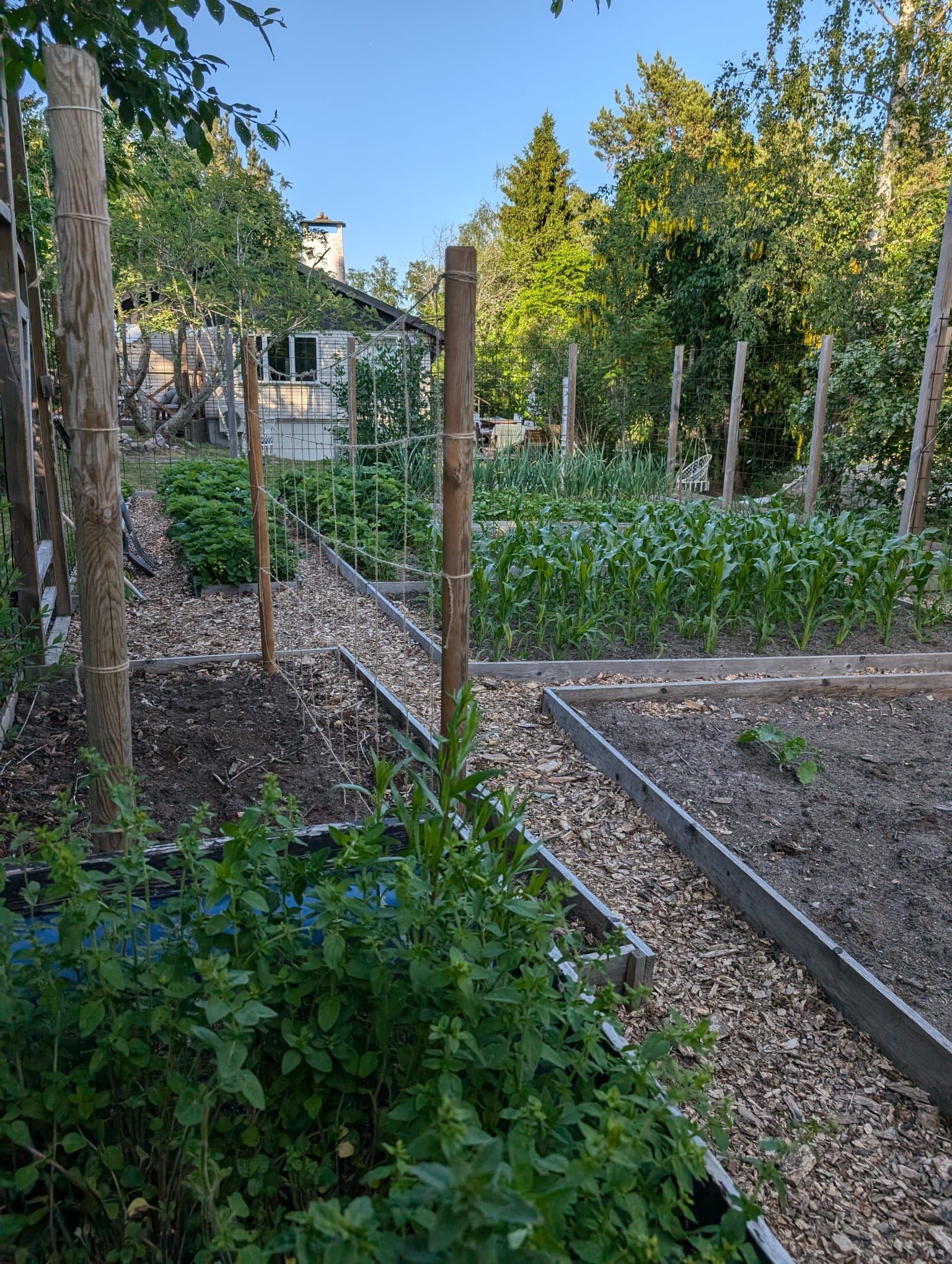 Tomten är en fridfull oas med odlingsbäddar, blommande perenner och frigående höns. Nuvarande familj odlar stora delar av sina grönsaker själva och lever ett stillsamt, naturnära liv. För gäster eller tonåringar finns ett charmigt gästhus i samklang med trädgården.