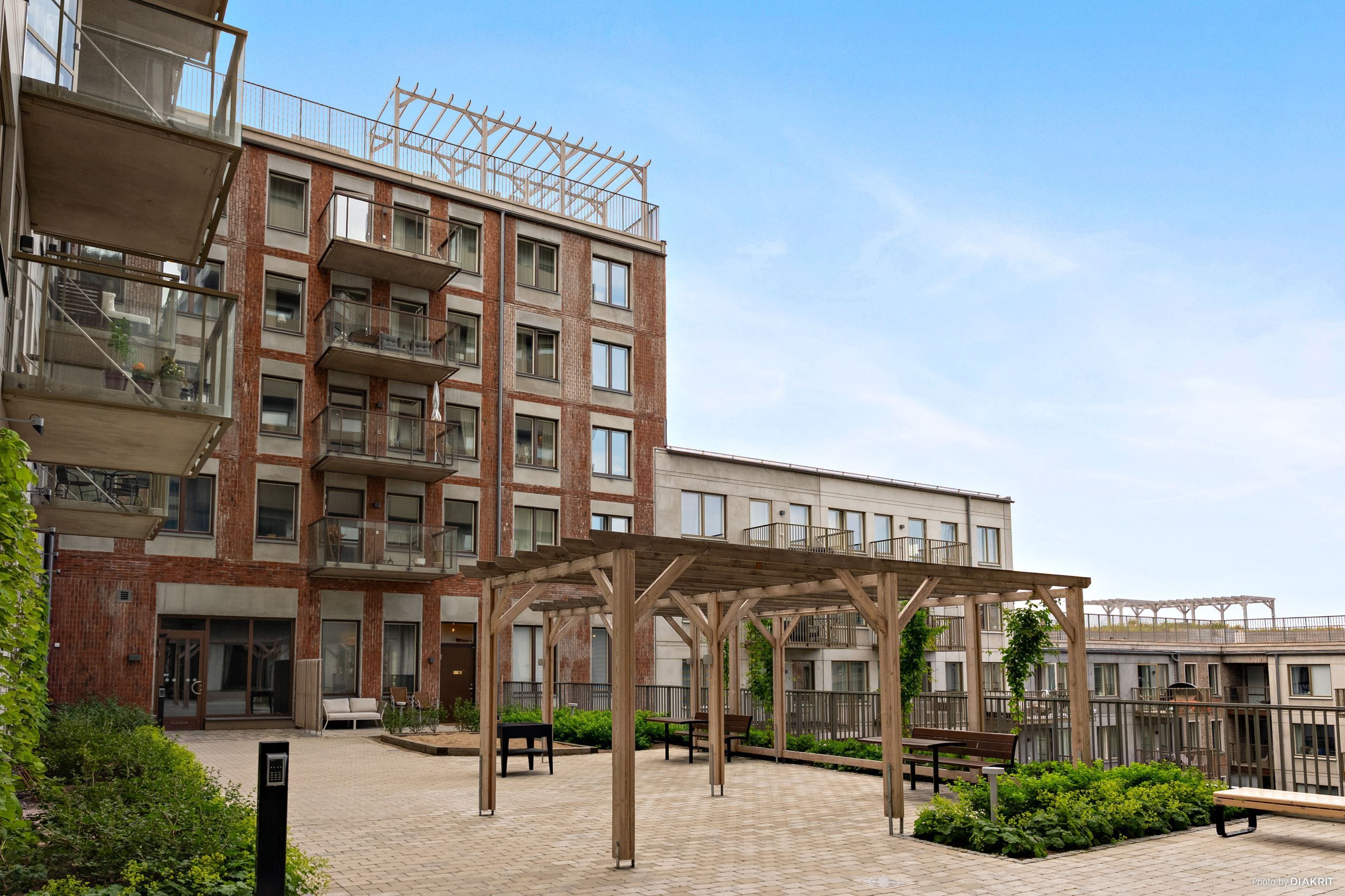 Nedre innergården med pergola, sittplatser och grill