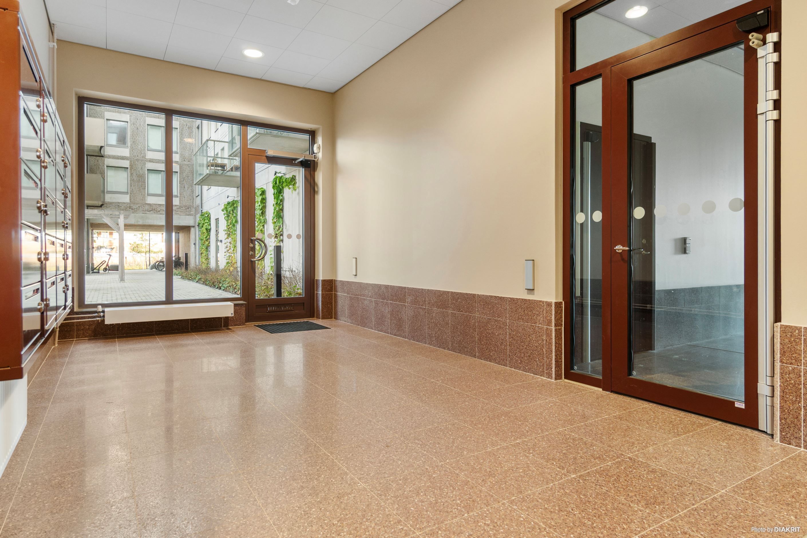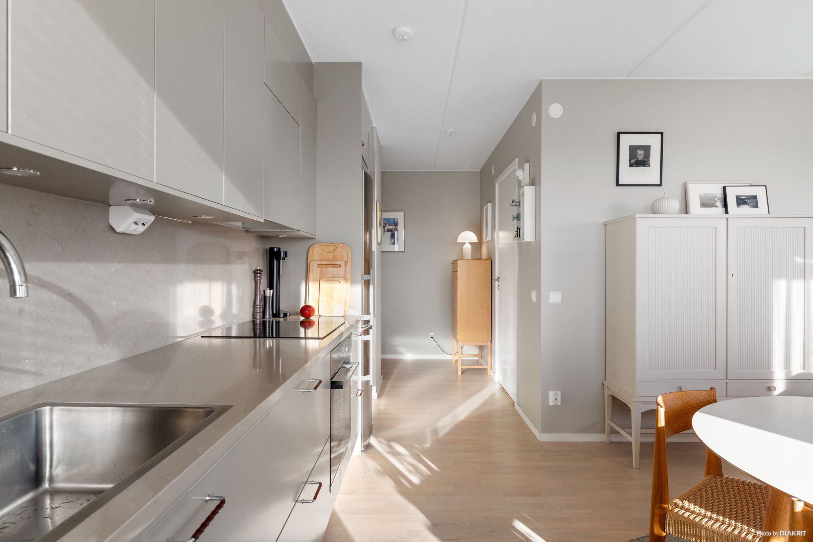 Den öppna planlösningen mellan kök och vardagsrum, tillsammans med de stora fönsterpartierna, ger bostaden dess alldeles speciella karaktär av ljus och rymd. Köket är från välrenommerade Vedum och går i beige ton, vilket ger ett stilrent intryck. Maskinell utrustning från Electrolux. Snyggt inrett, helkaklat badrum med komfortvärme i golvet, handdukstork samt kombinerad tvättmaskin och torktumlare. Stort sovrum med plats för dubbelsäng och gott om förvaring i rymlig garderobsvägg med skjutdörrar. Även i hallen finns bra förvaringsmöjlighet i två garderober. Lägenheten är mycket välplanerad och har fina, noga utvalda interiöra detaljer såsom vitpigmenterad ekparkett, köks-/badrumsinredning och garderober från Vedum samt fönsterbänkar i natursten. Källarförråd finns.