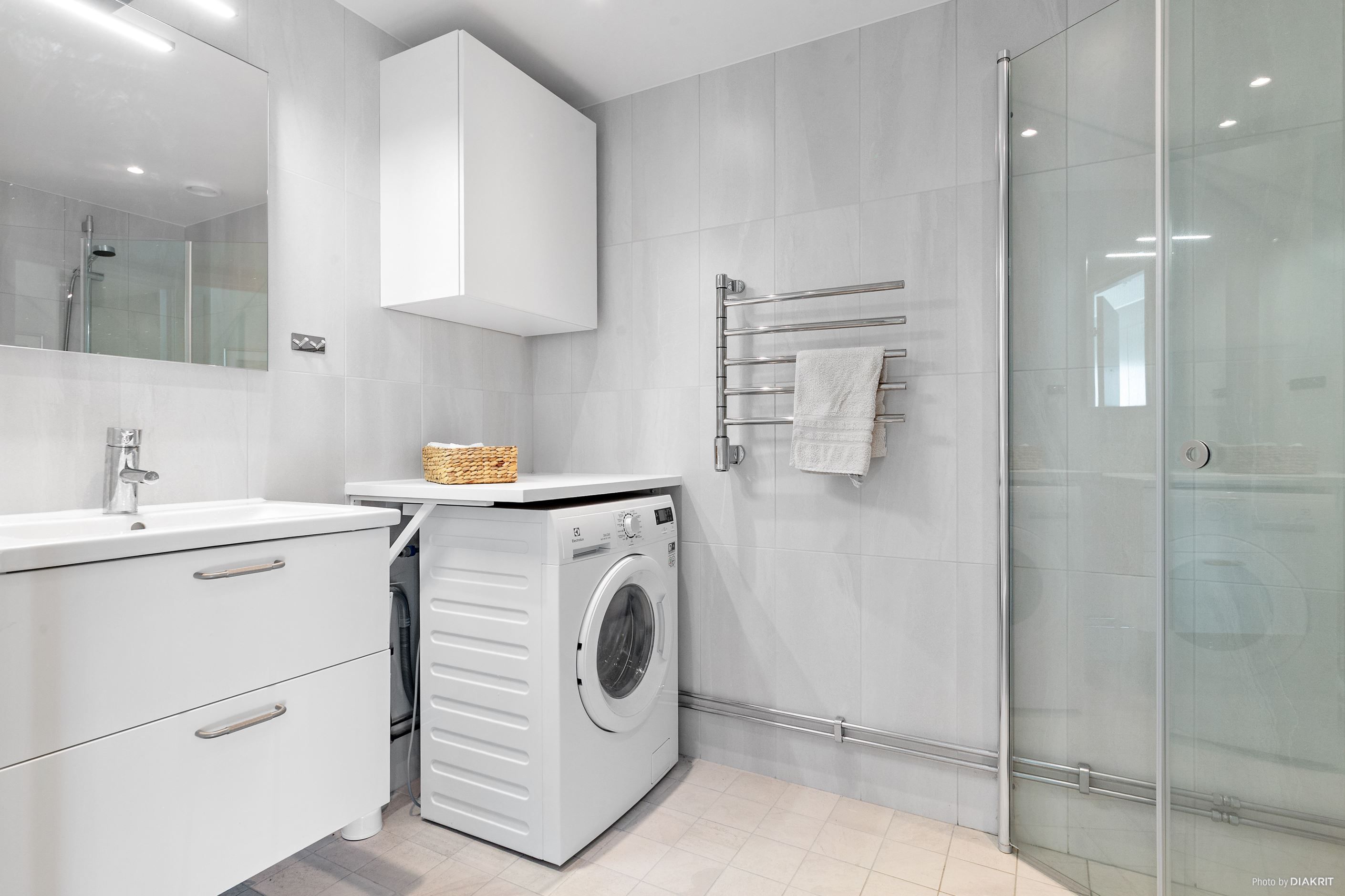 Helkaklat badrum med tvätt/tork och handdukstork samt komfortvärme i golvet