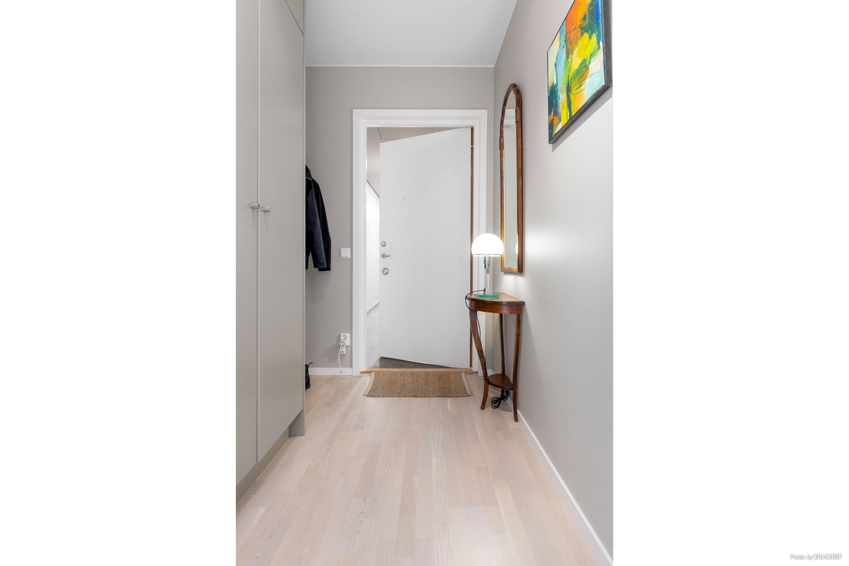 Utsikt mot inloppet från vardagsrum/kök samt från kortsidan av balkongen