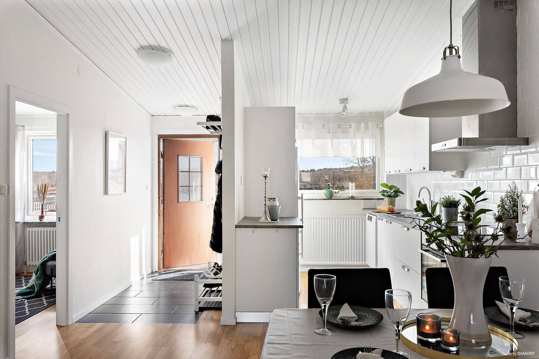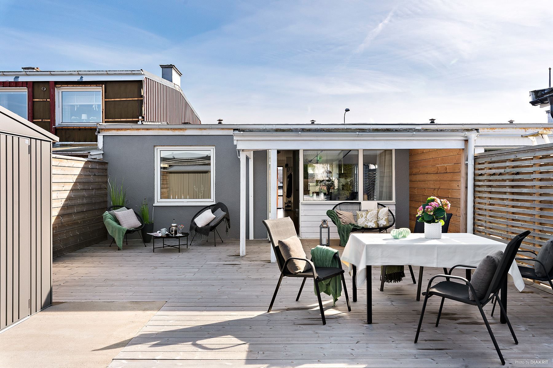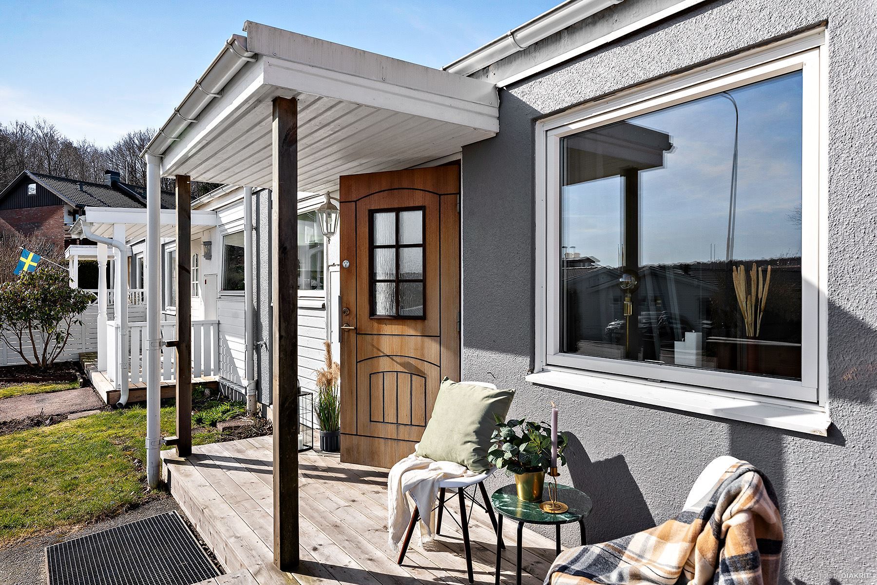 Nu kan vi erbjuda en enplans radhus i fint skick. Liten lättskött trädgård och uteplatser. På baksidan finns ett stort trädäck där en del är under tak. Här finns även ett fristående förråd.
