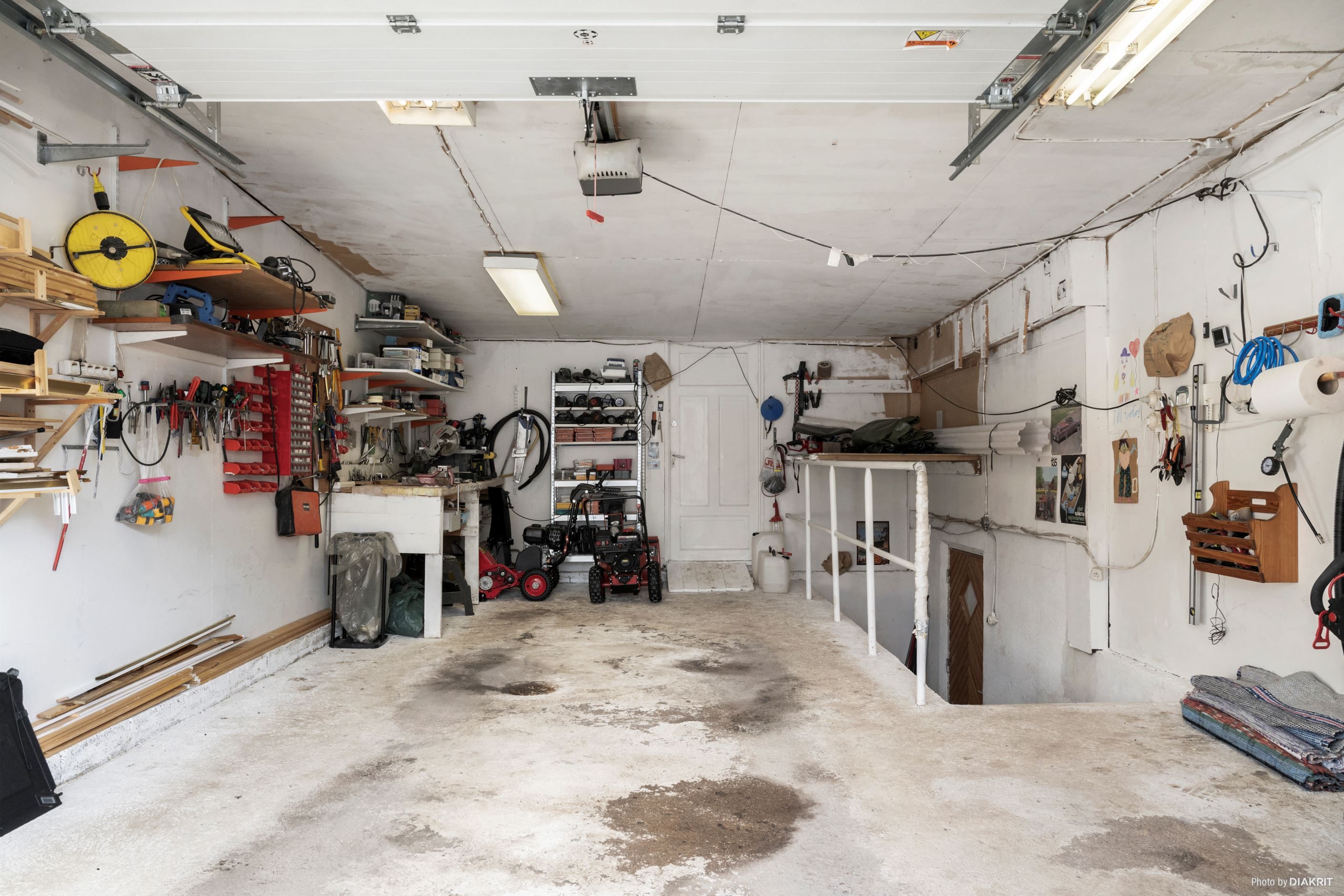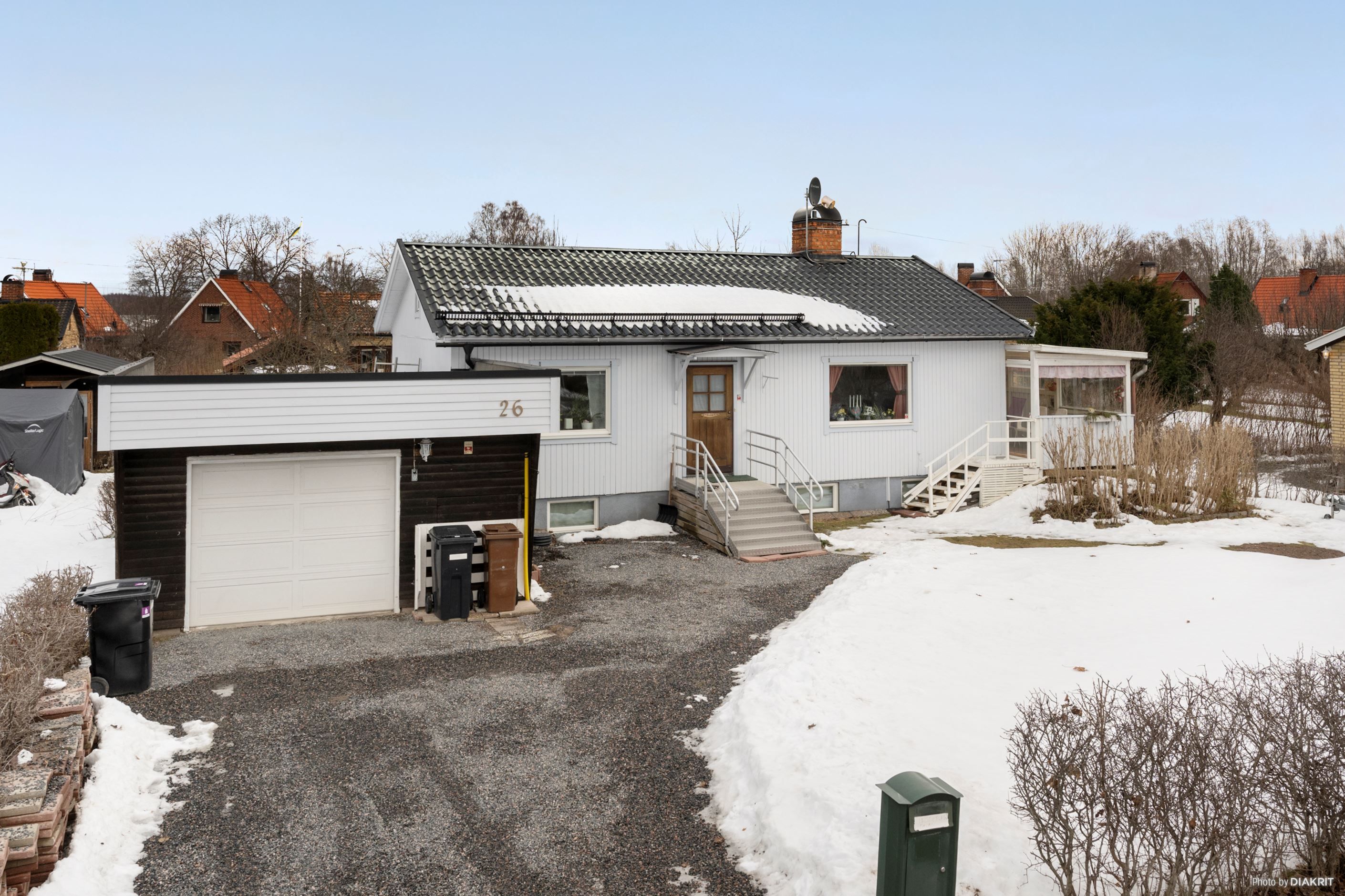 Den vidbyggda garagedelen ger bekvämlighet i vardagen och extra förvaringsmöjligheter – en uppskattad detalj under årets alla årstider.