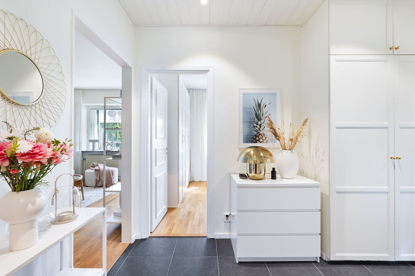 Ett sovrum i bra storlek med generösa garderober, vidare ut i hallen möts du av det mörkgråa klinkergolv och även här finns stora garderober där du får plats med det mesta. Härifrån tar du dig ut till vardagsrummet som är luftigt och stort, det finns möjlighet att inreda med större matbord om så önskas. Som pricken över i:et erbjuds en rymlig inglasad balkong - perfekt ställe för socialt umgänge.