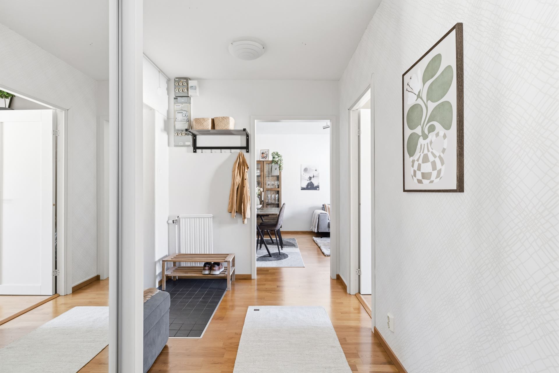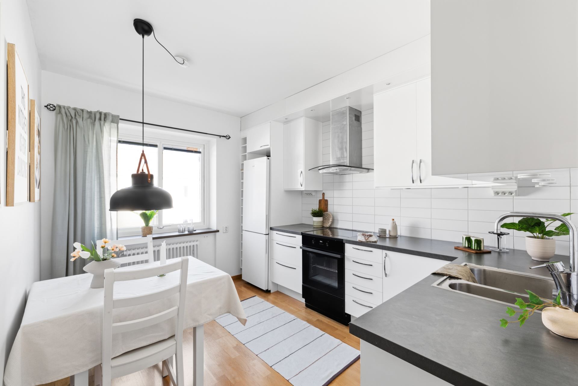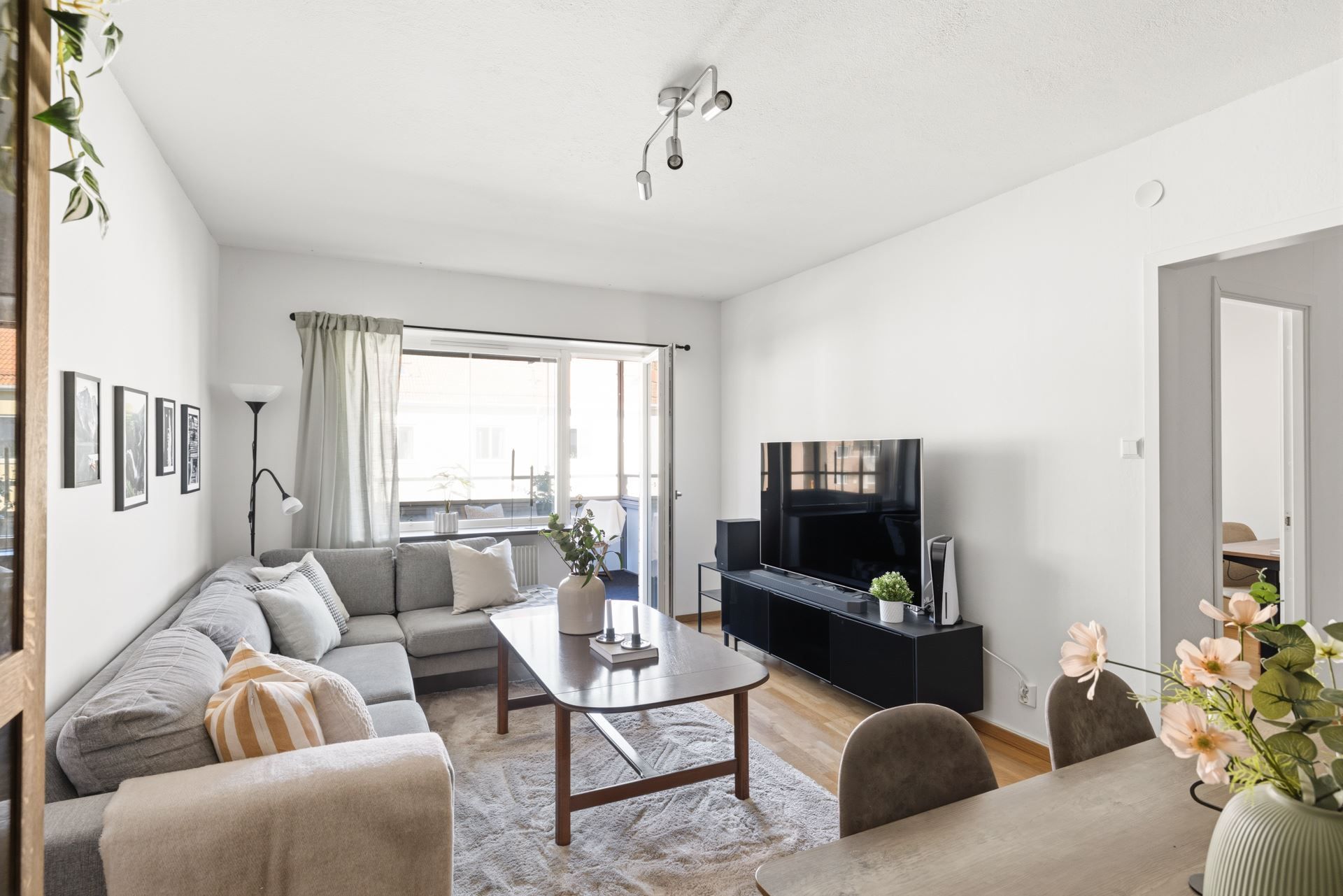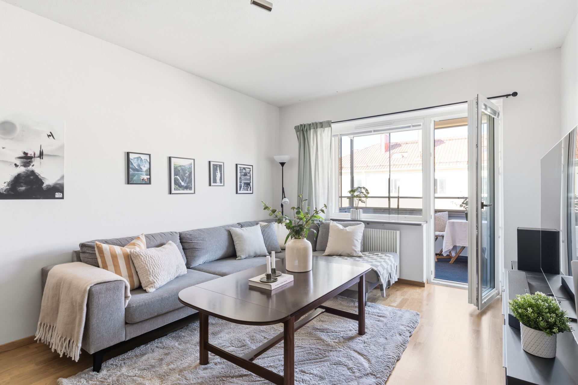 Interiört bjuds ett ljuts vitt kök och ett badrum i samma stil. Vitt och grått som utgör den neutrala färgpaletten som är genomgående. Väldisponerade och effektiva ytor i vardagsrum som ansluter till den inglasade balkongen i västerläge med kvällssol till sent och sovrummet är ombonat i mitten av lägenheten som ger den där ombonade sovrumskänslan. För dig som inte kan få nog av den rikliga förvaringen i lägenheten följer dessutom ett vinds- och ett källarförråd.