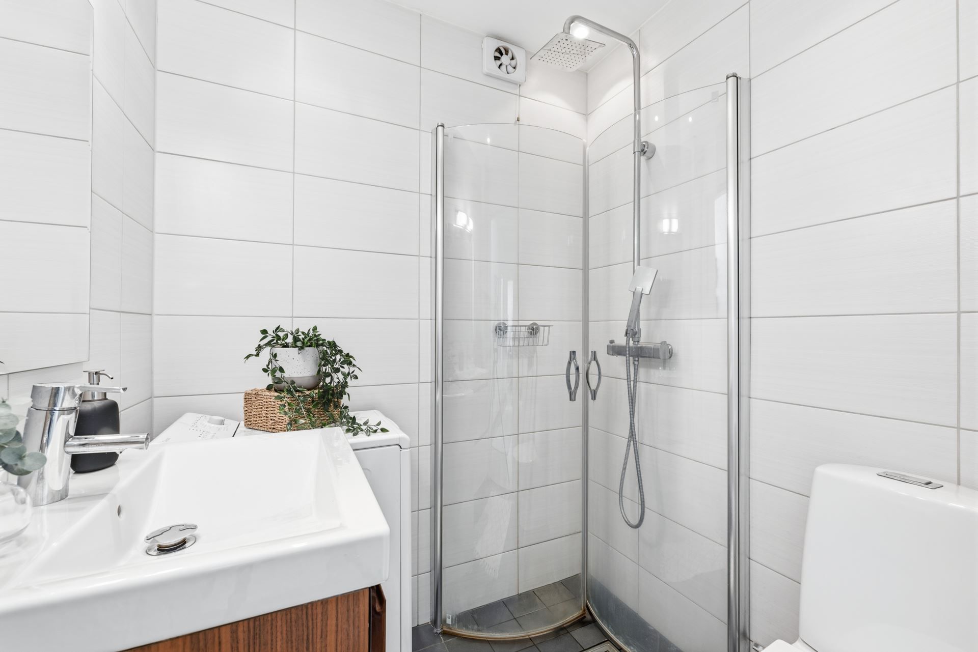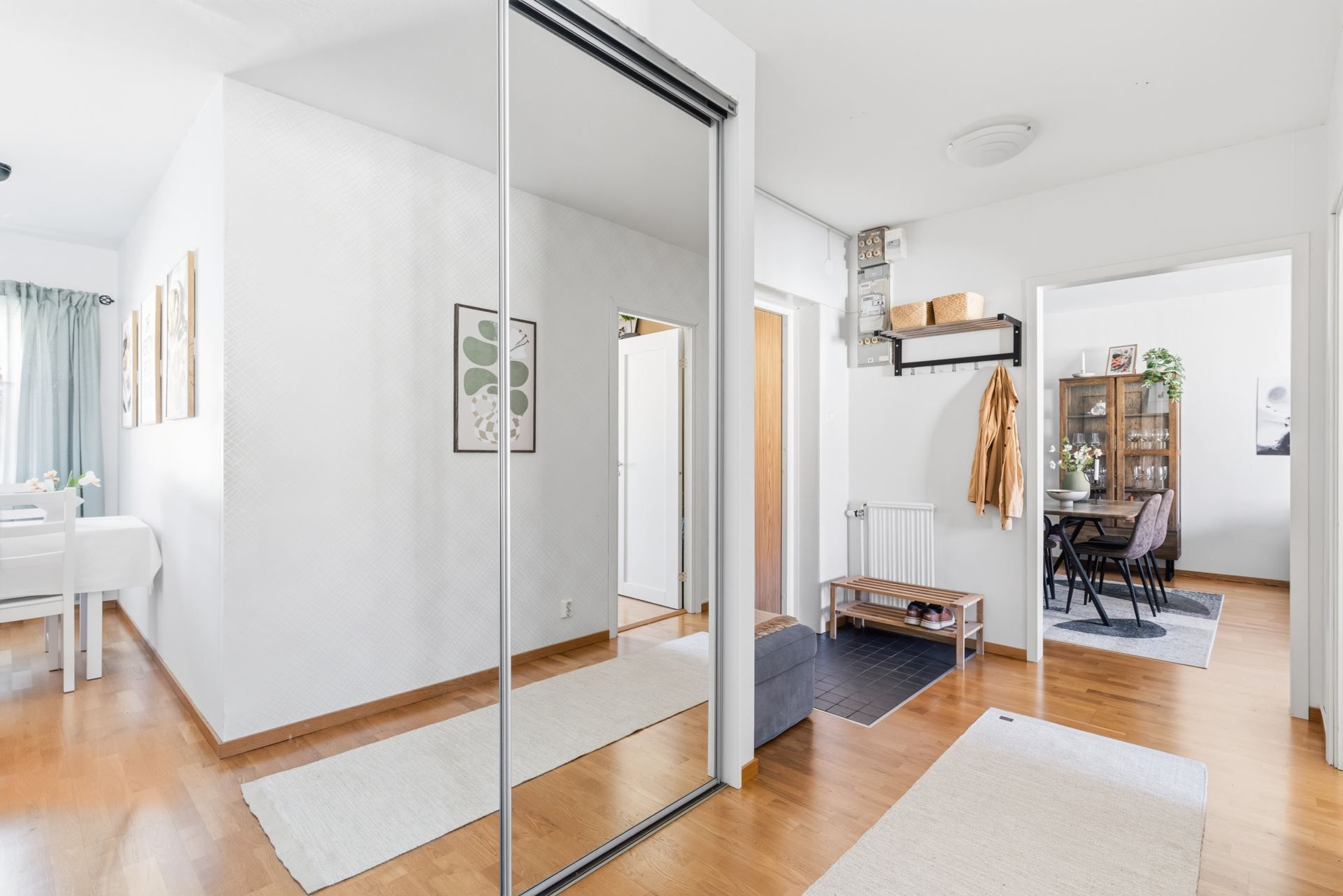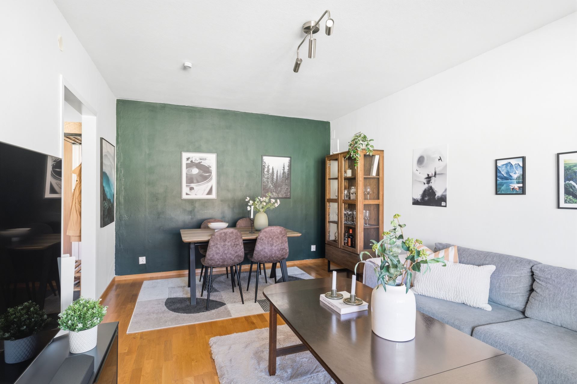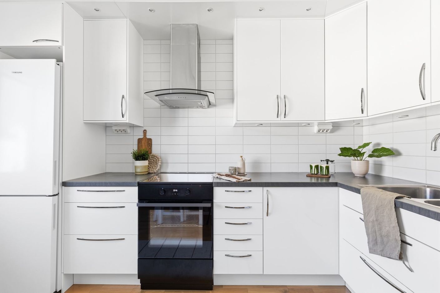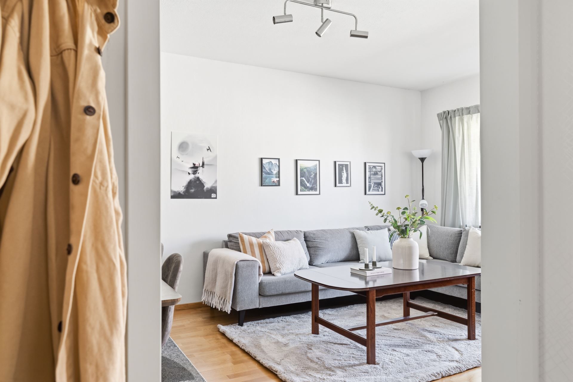 Interiört bjuds ett ljuts vitt kök och ett badrum i samma stil. Vitt och grått som utgör den neutrala färgpaletten som är genomgående. Väldisponerade och effektiva ytor i vardagsrum som ansluter till den inglasade balkongen i västerläge med kvällssol till sent och sovrummet är ombonat i mitten av lägenheten som ger den där ombonade sovrumskänslan. För dig som inte kan få nog av den rikliga förvaringen i lägenheten följer dessutom ett vinds- och ett källarförråd.