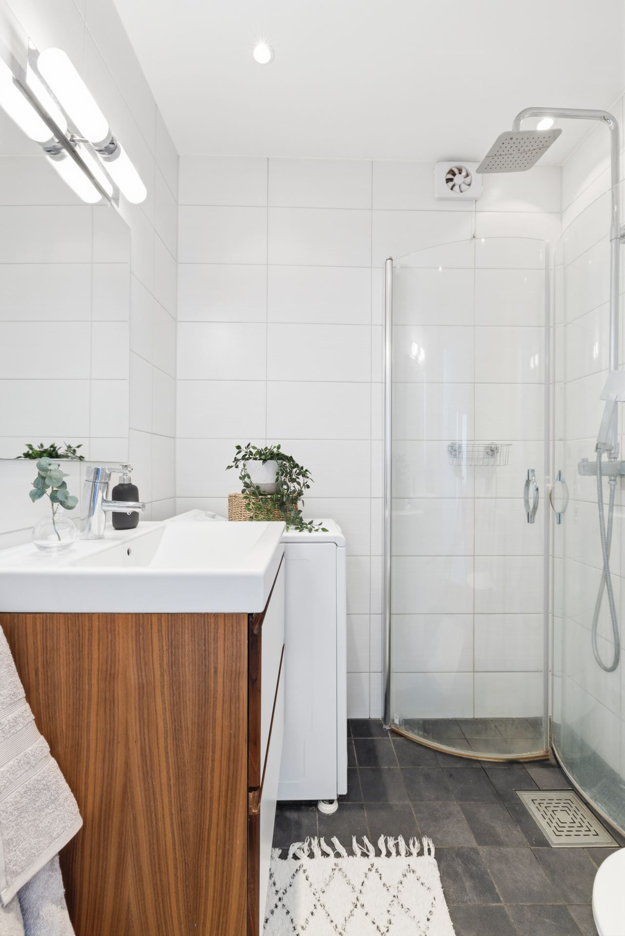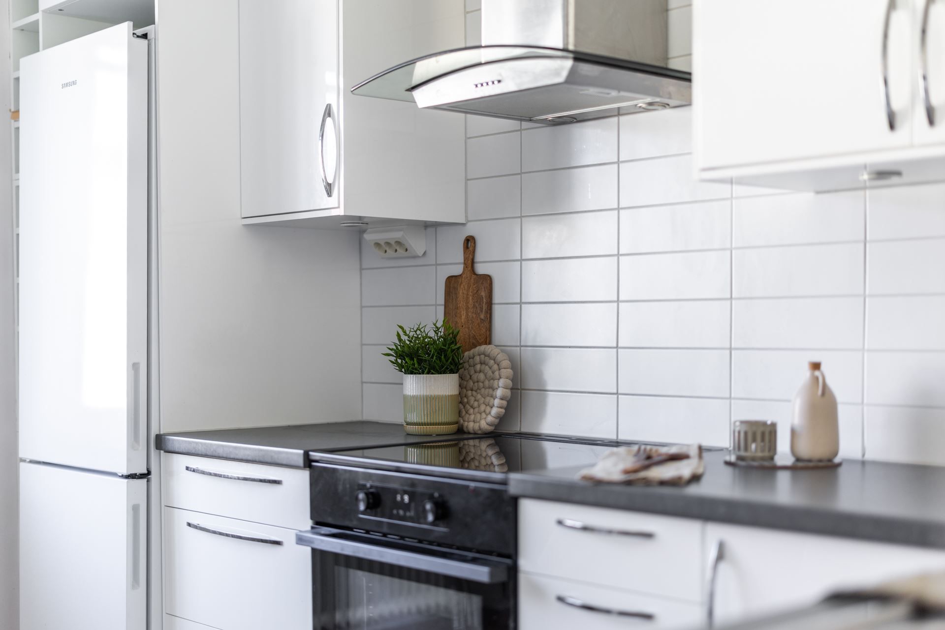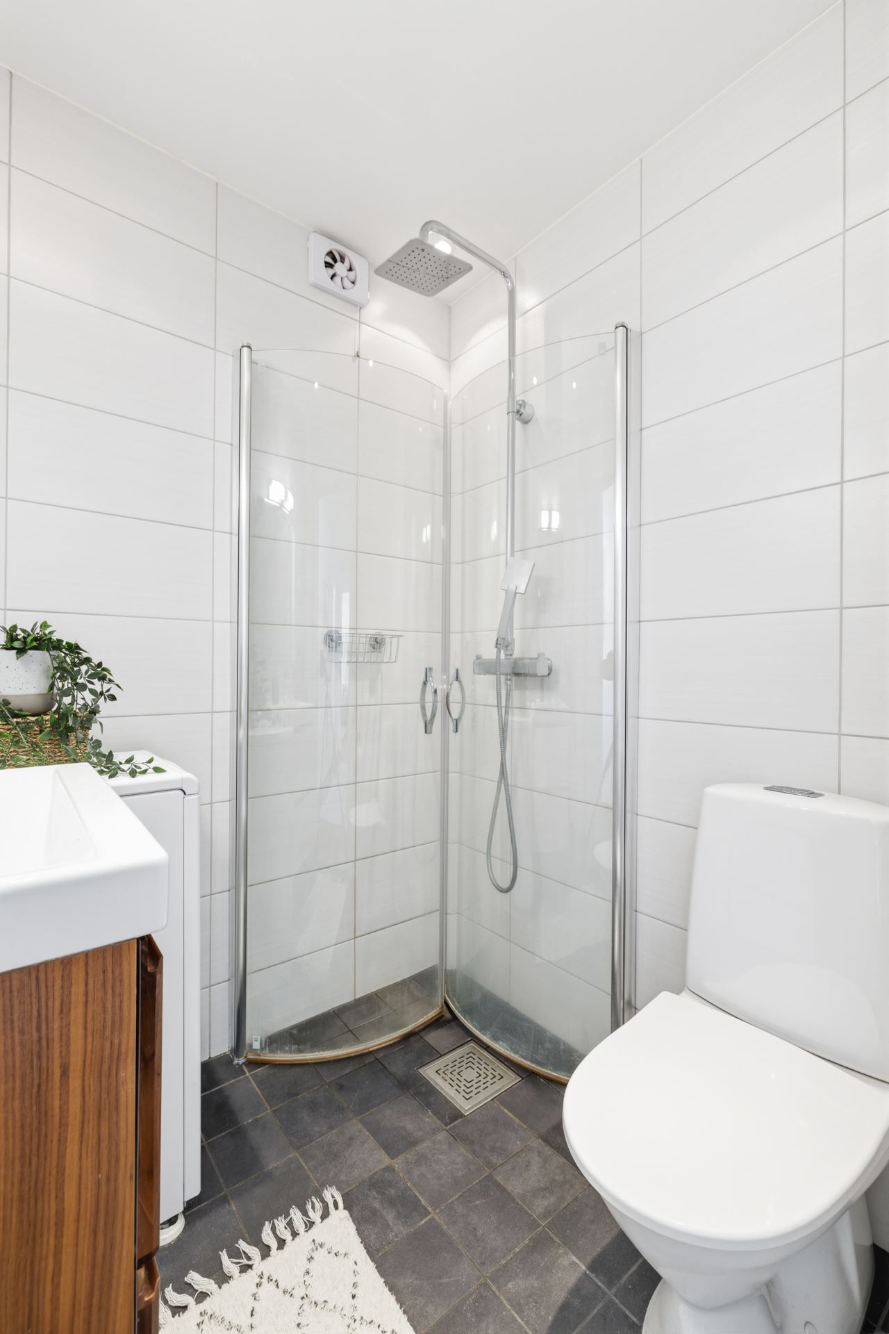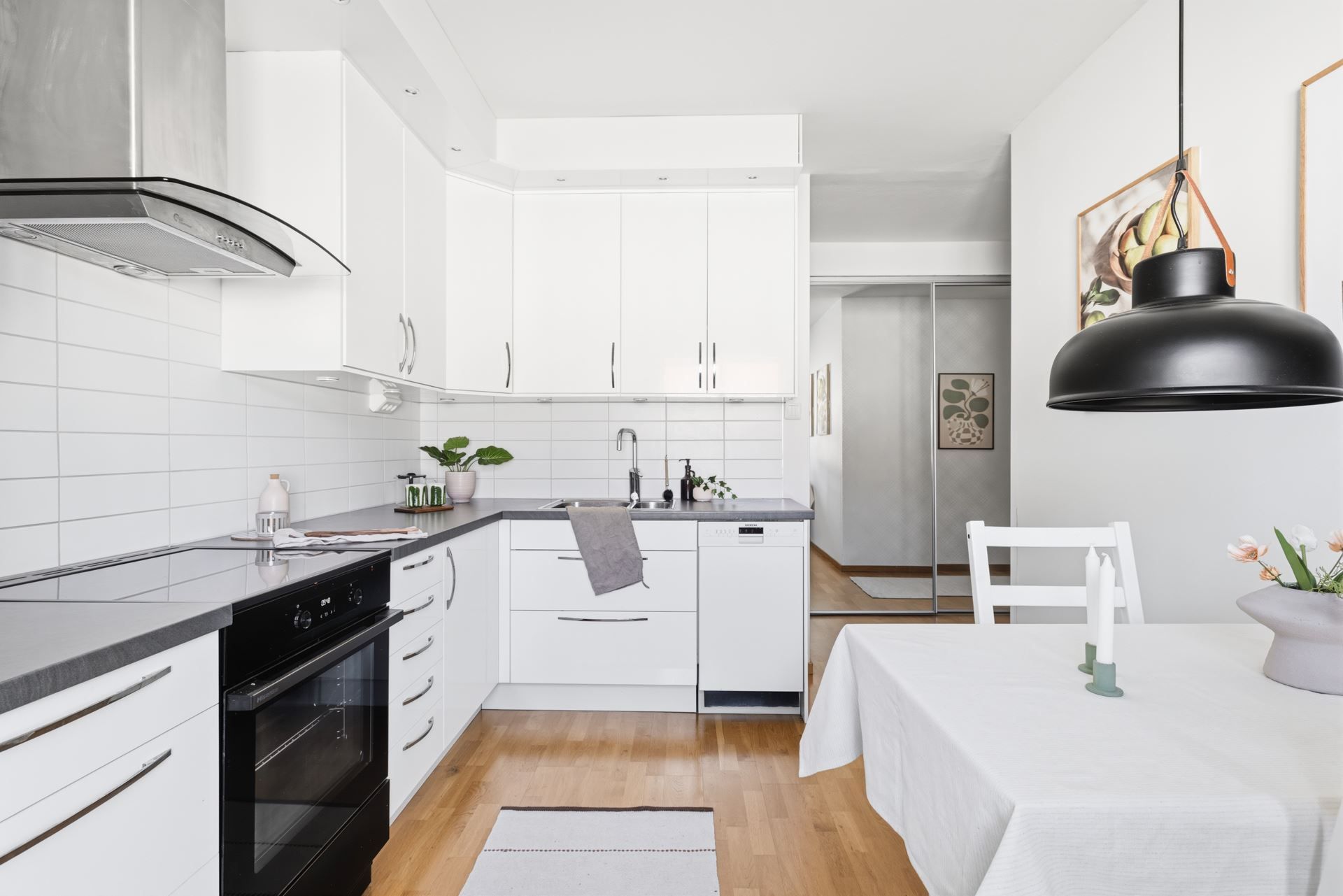 Interiört bjuds ett ljuts vitt kök och ett badrum i samma stil. Vitt och grått som utgör den neutrala färgpaletten som är genomgående. Väldisponerade och effektiva ytor i vardagsrum som ansluter till den inglasade balkongen i västerläge med kvällssol till sent och sovrummet är ombonat i mitten av lägenheten som ger den där ombonade sovrumskänslan. För dig som inte kan få nog av den rikliga förvaringen i lägenheten följer dessutom ett vinds- och ett källarförråd.