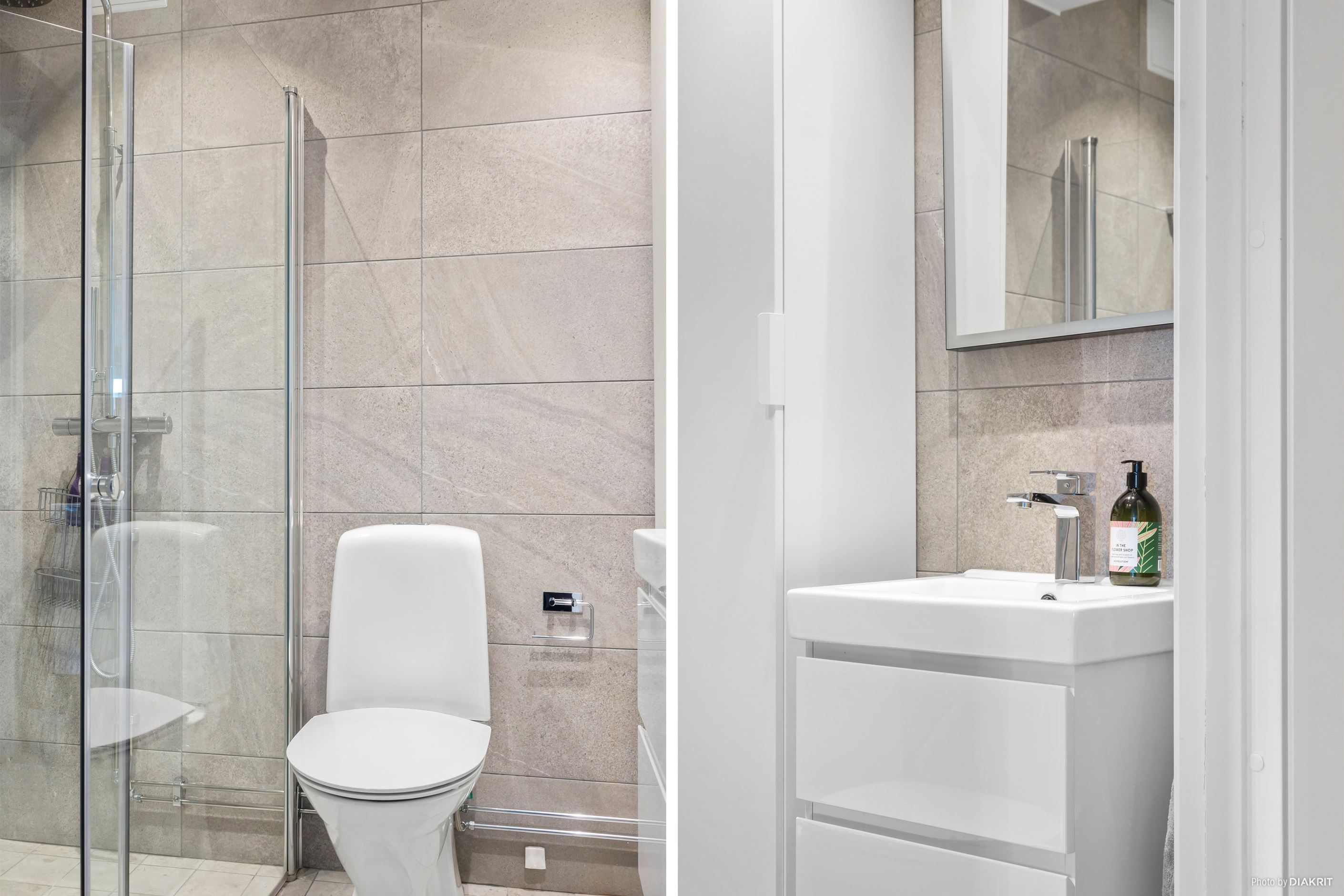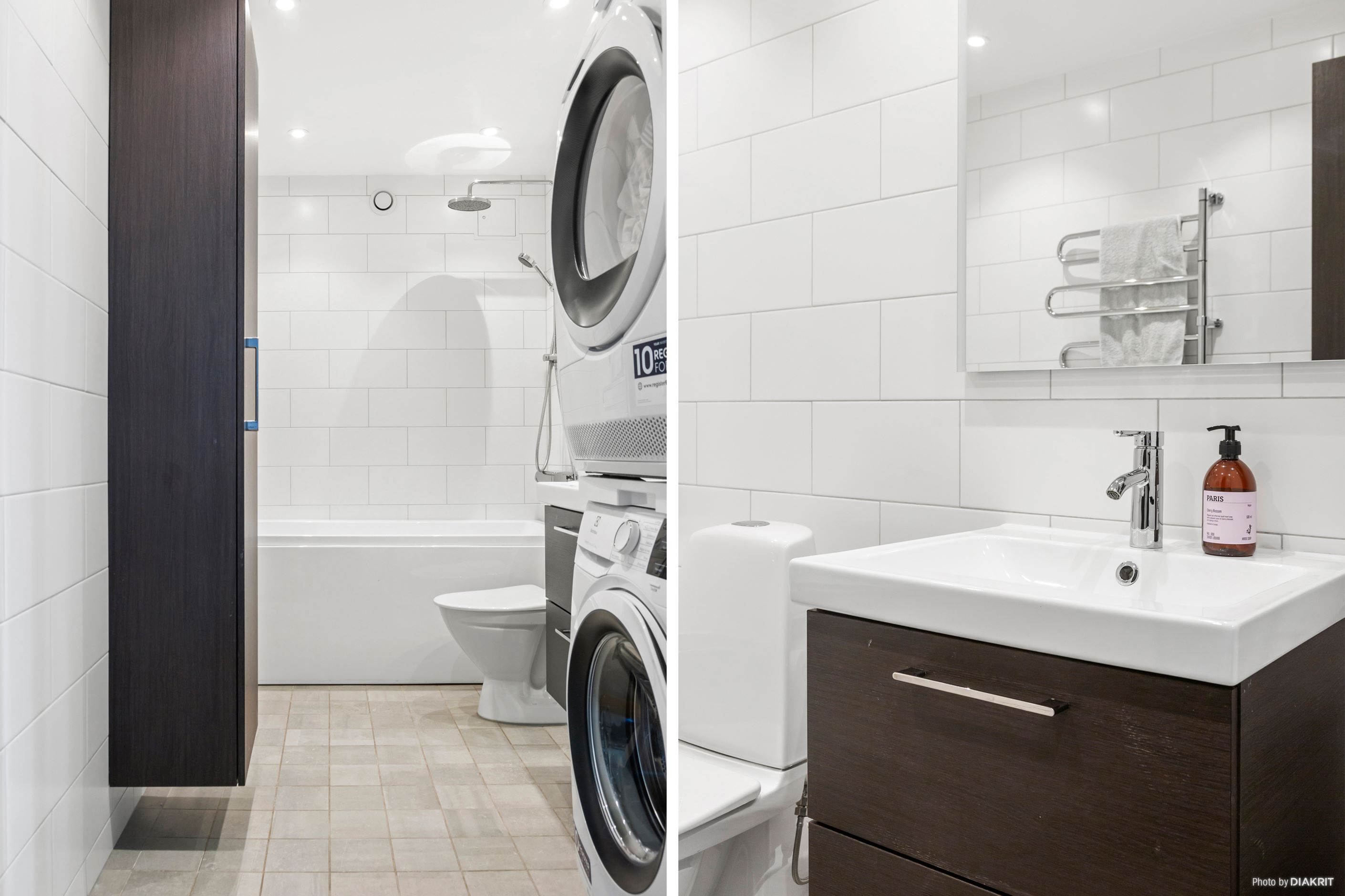 Det stora badrummet, renoverat 2020, är smakfullt inrett med kakel och klinker, golvvärme samt tvättmaskin och torktumlare. Bostaden kompletteras även av ett extra duschrum – en uppskattad detalj för den större familjen.