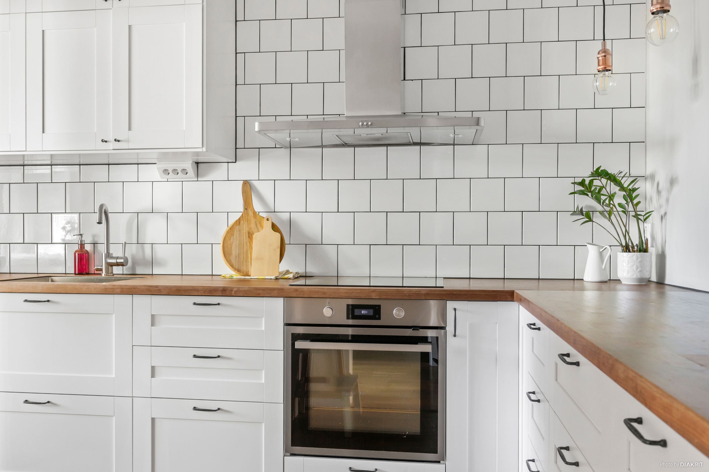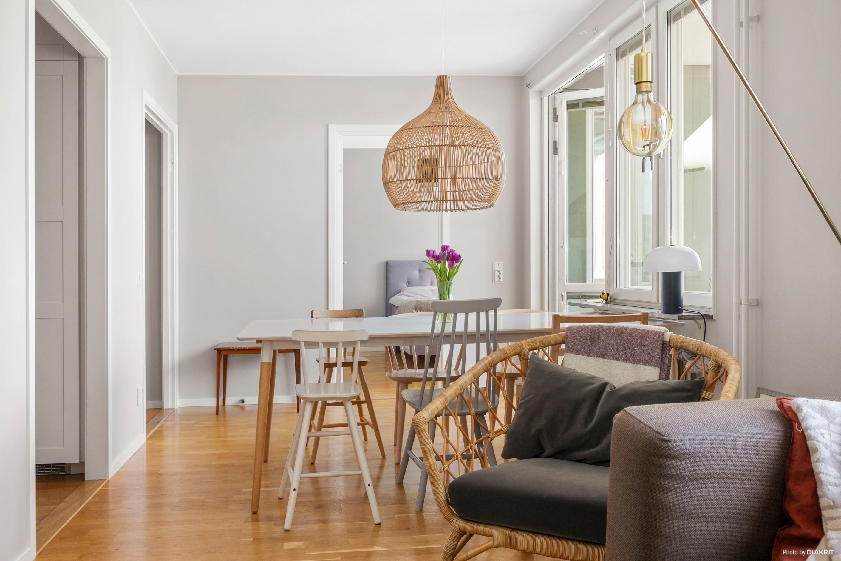 Den öppna och sociala planlösningen mellan kök och vardagsrum skapar en naturlig samlingsplats för familj och vänner. Köket är stilrent utformat med en gedigen träbänkskiva, gott om arbetsytor och full maskinell utrustning, inklusive induktionshäll och vitvaror från 2020. Vardagsrummet rymmer både soffgrupp och matplats och har direkt access till bostadens balkong.