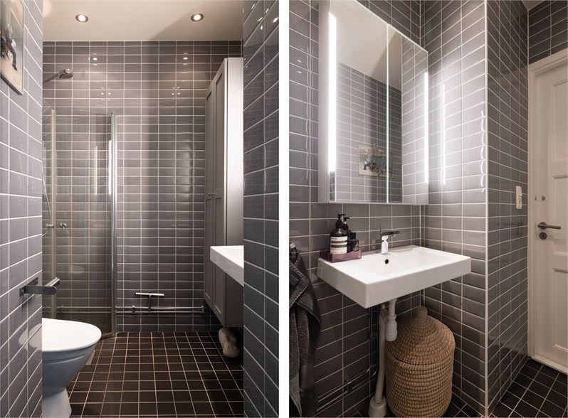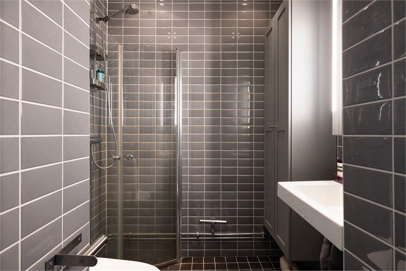Badrummet är rymligt och helkaklat, utrustat med wc, dusch och handfatskommod samt goda förvaringsmöjligheter i ett skåp. Det finns även plats för tvättmaskin. Bostaden var väldigt goda förvaringsmöjligheter i flertalet garderober i hallen.