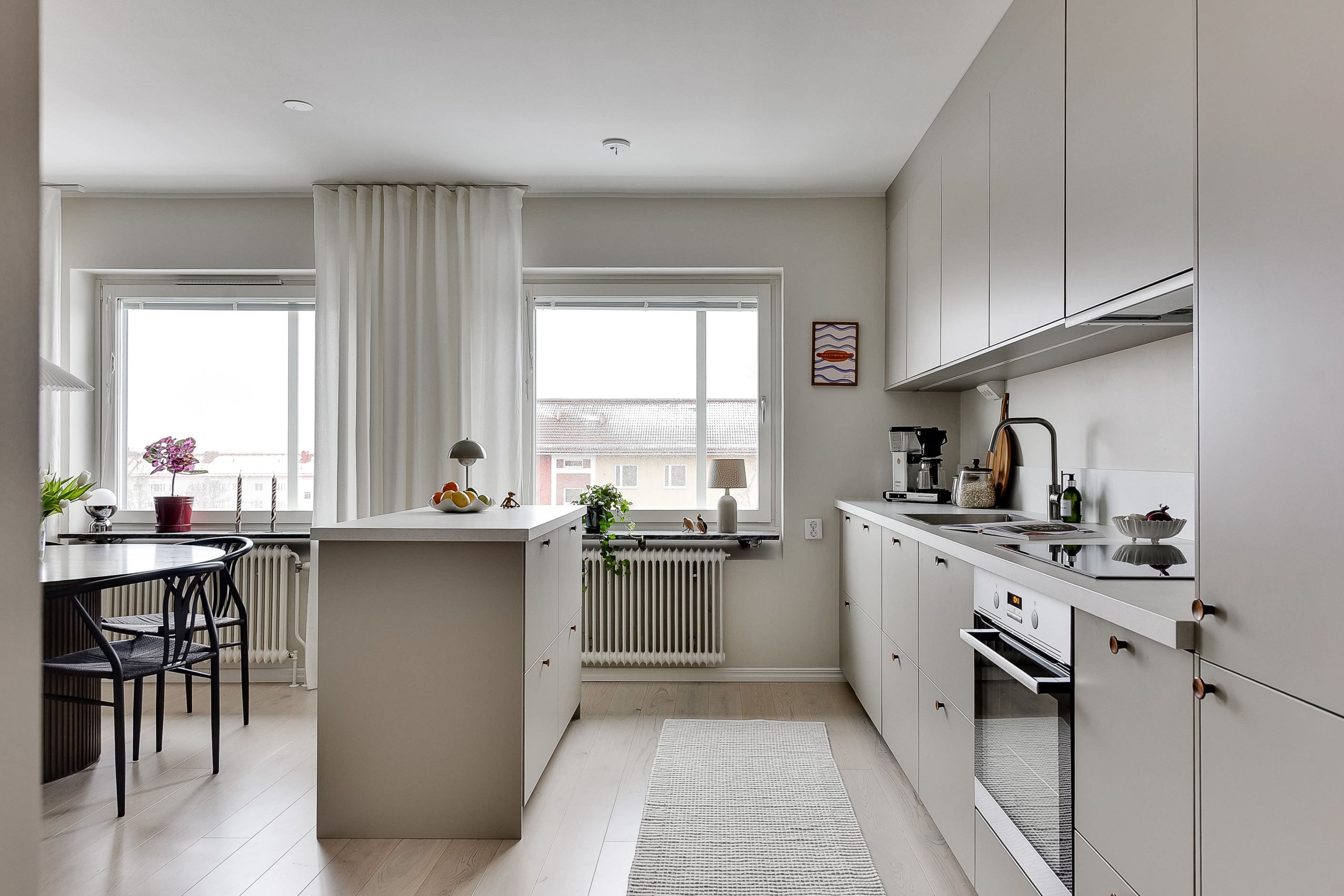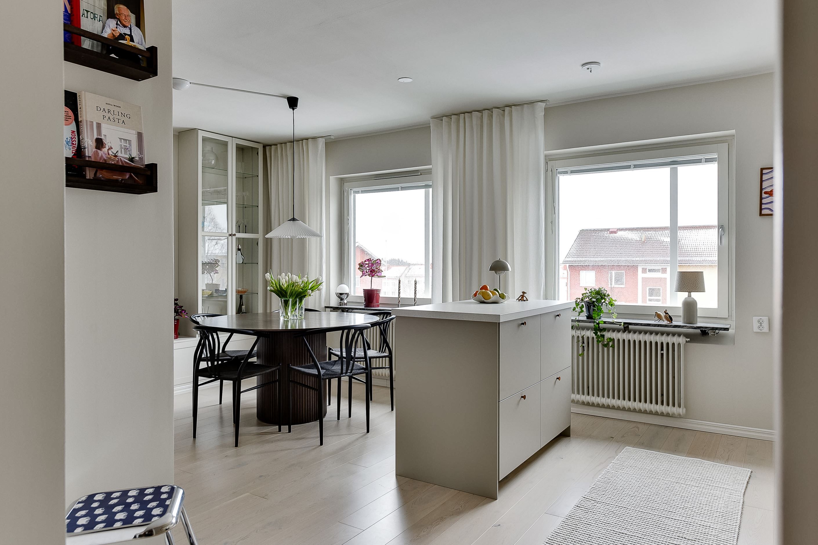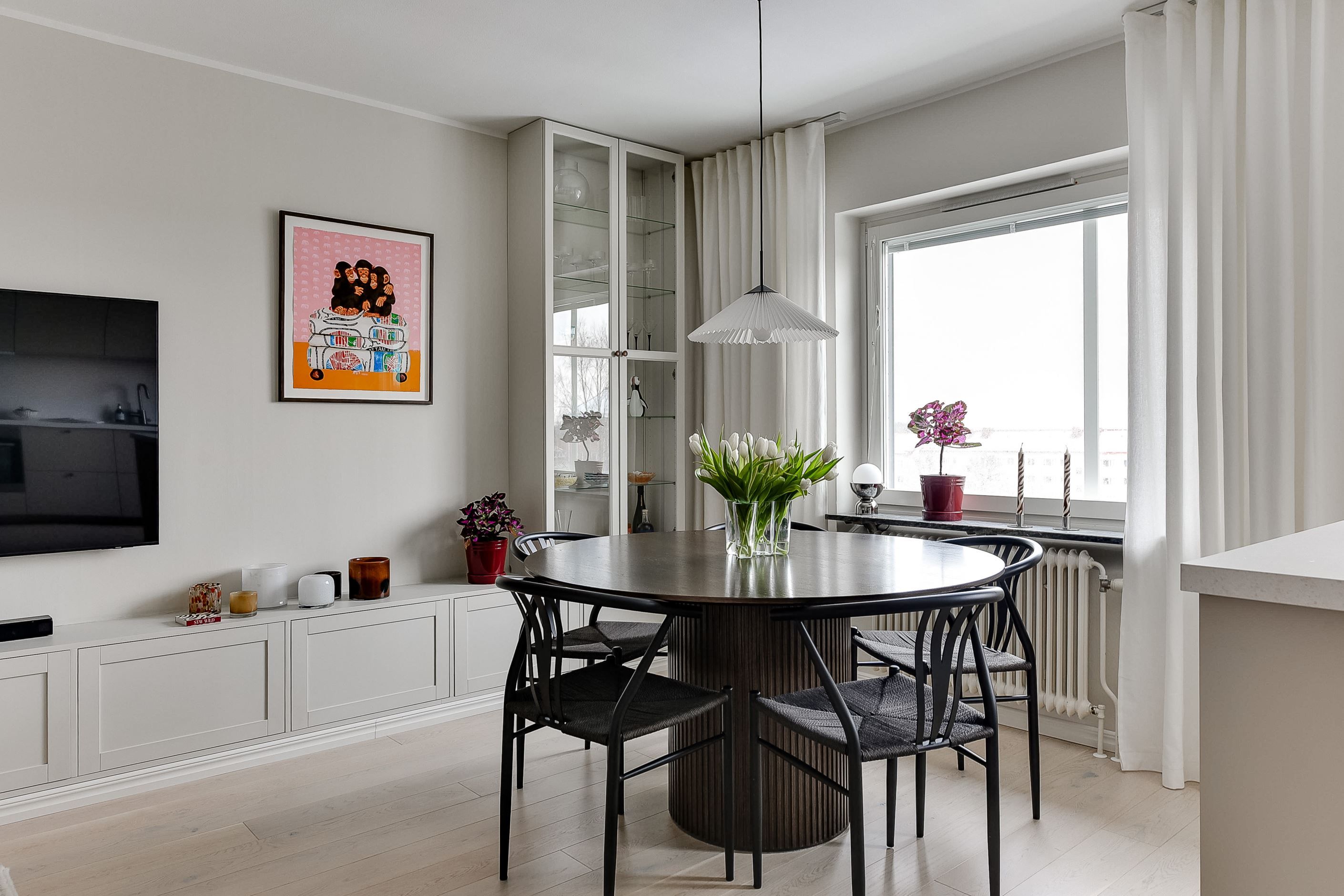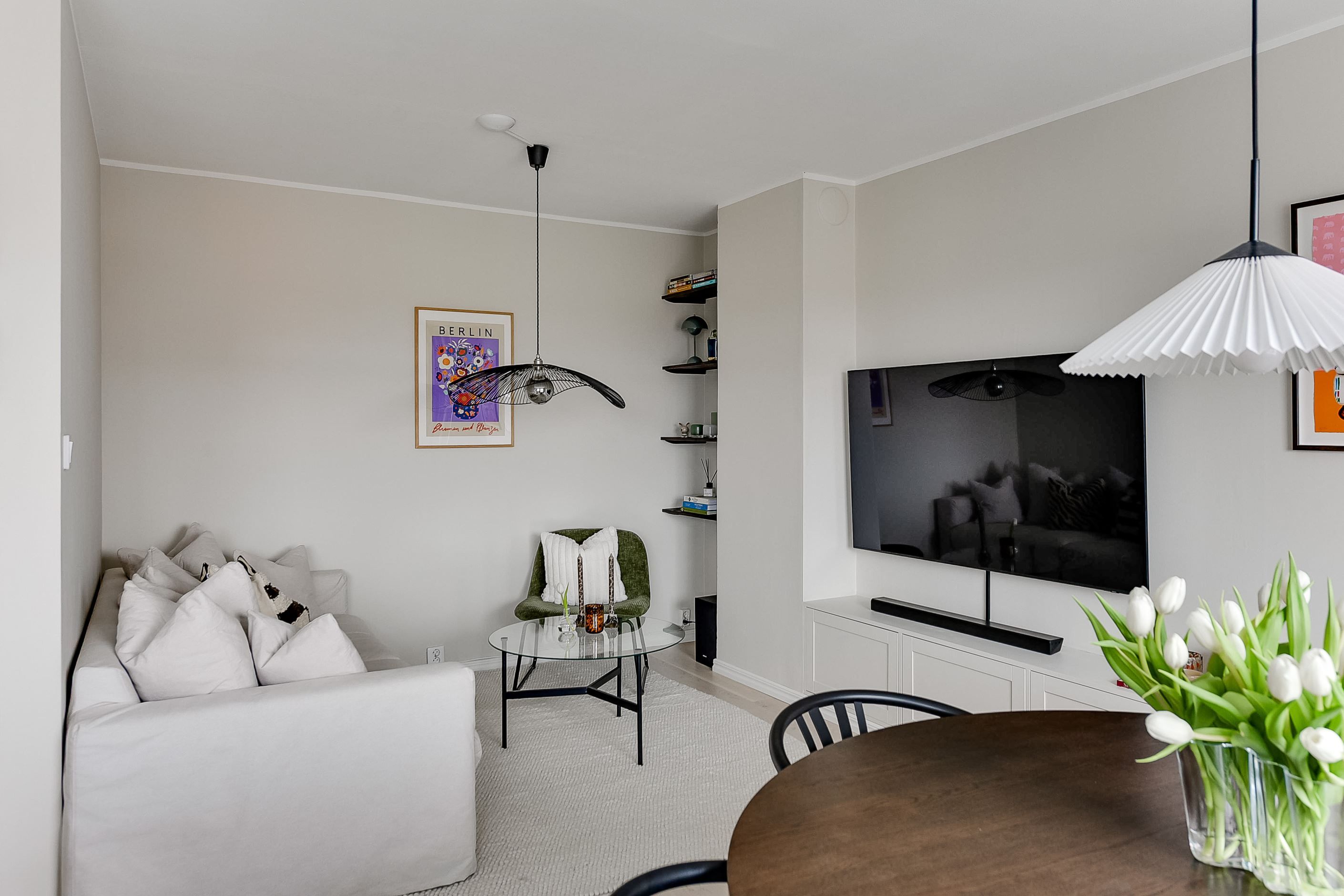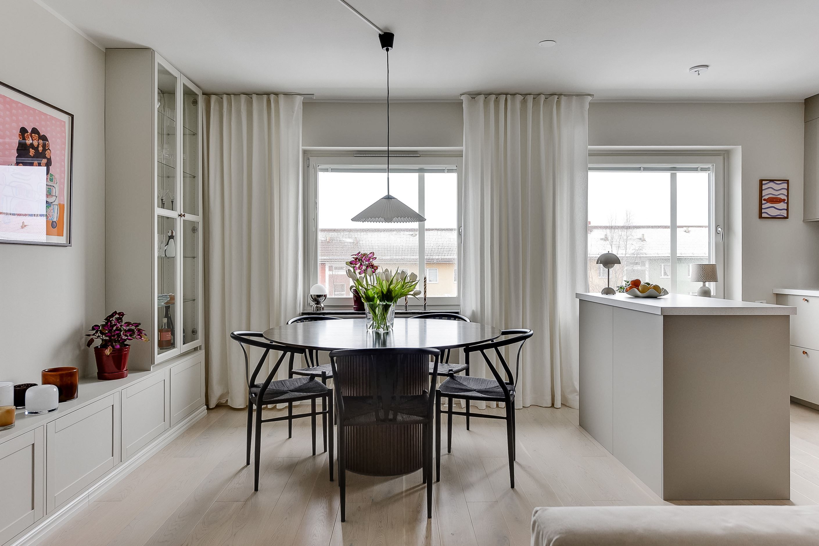 Här erbjuds en tvårummare som verkligen sticker ut – en bostad där klassiska 50-talsattribut möter modern elegans och där varje kvadratmeter har planerats om för att skapa en öppen, social och lyxig helhet. Med sina 54 kvm, sin omsorgsfullt omarbetade planlösning och sina stilrena materialval tillhör denna lägenhet ett av de mest påkostade alternativen Berghem har att erbjuda.