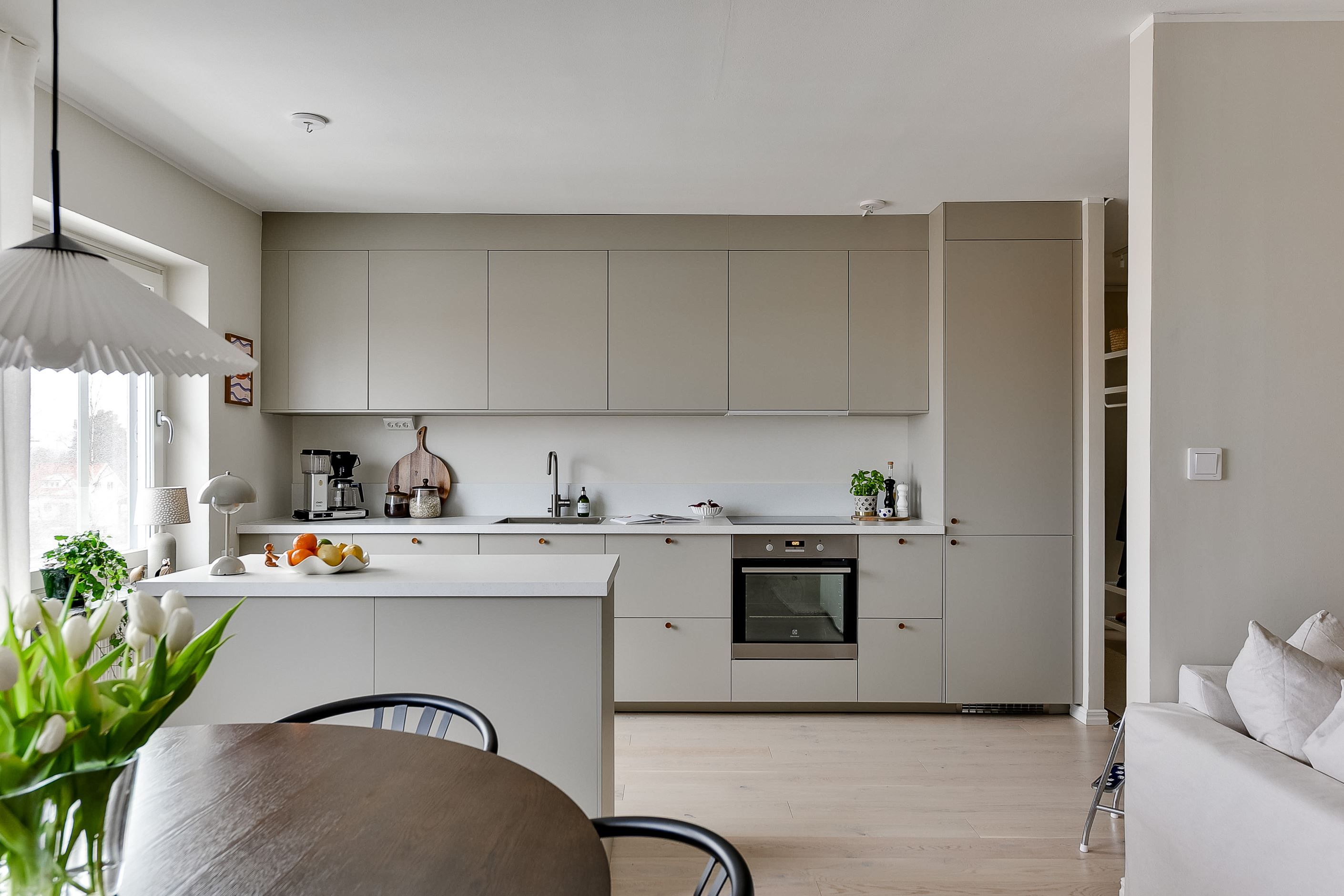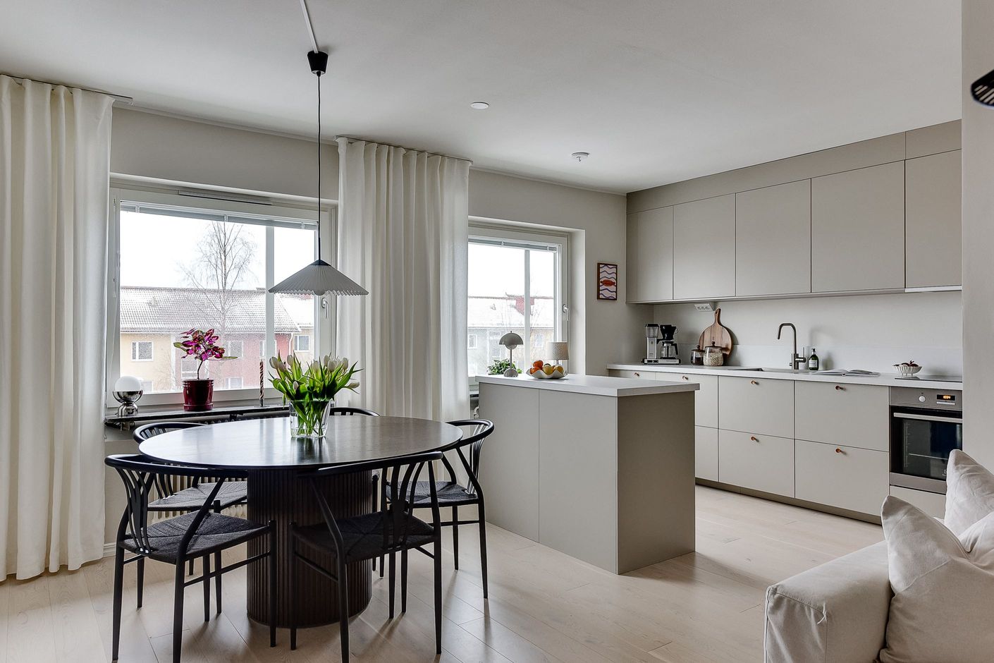 Det sociala allrummet är bostadens givna hjärta – en luftig yta där flera stora fönster i sydväst skapar ett fantastiskt ljusflöde. Här samsas kök, matplats och vardagsrum i en harmonisk helhet. Köket är toppmodernt och erbjuder integrerad kyl/frys, induktionshäll, varmluftsugn, diskmaskin samt generösa arbetsytor och förvaring. Den centralt placerade köksön blir både samlingspunkt och funktionell arbetsyta – perfekt vid såväl matlagning som sociala tillställningar.