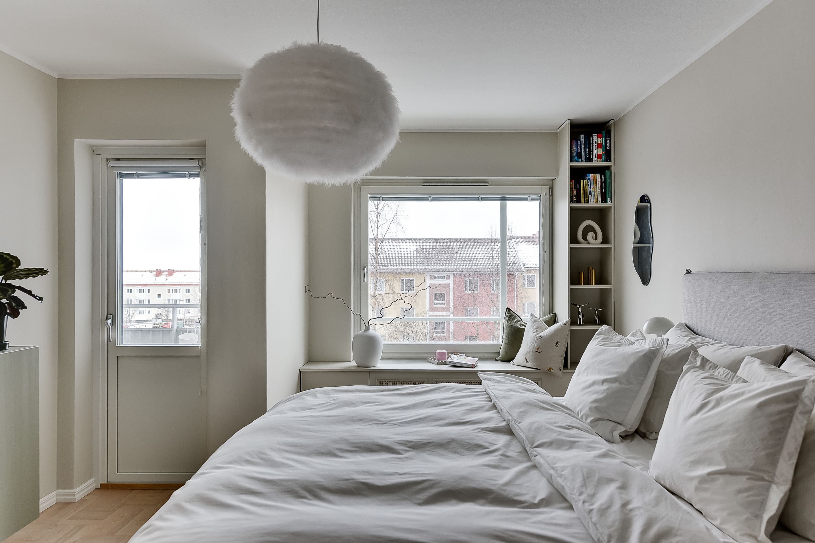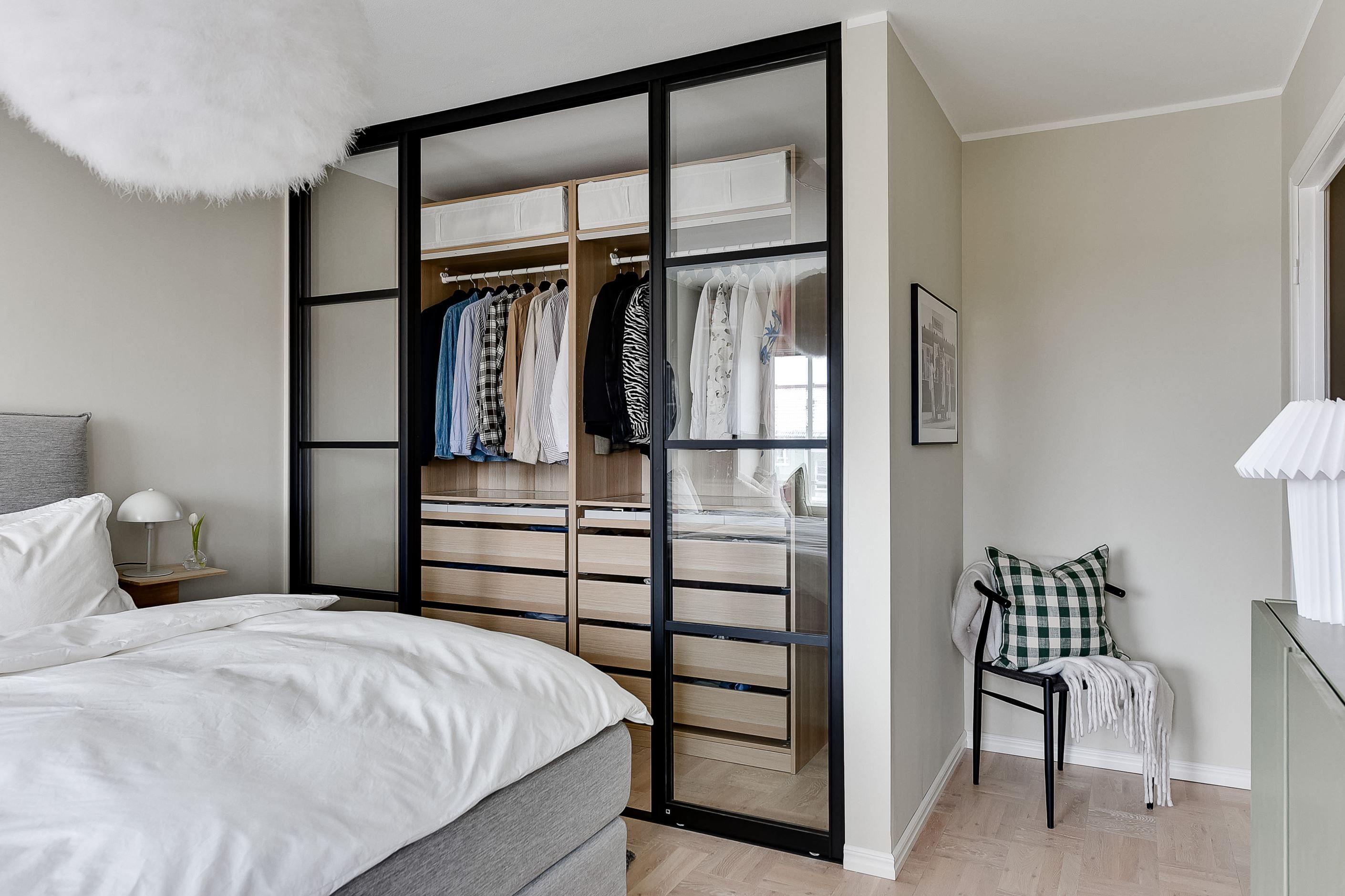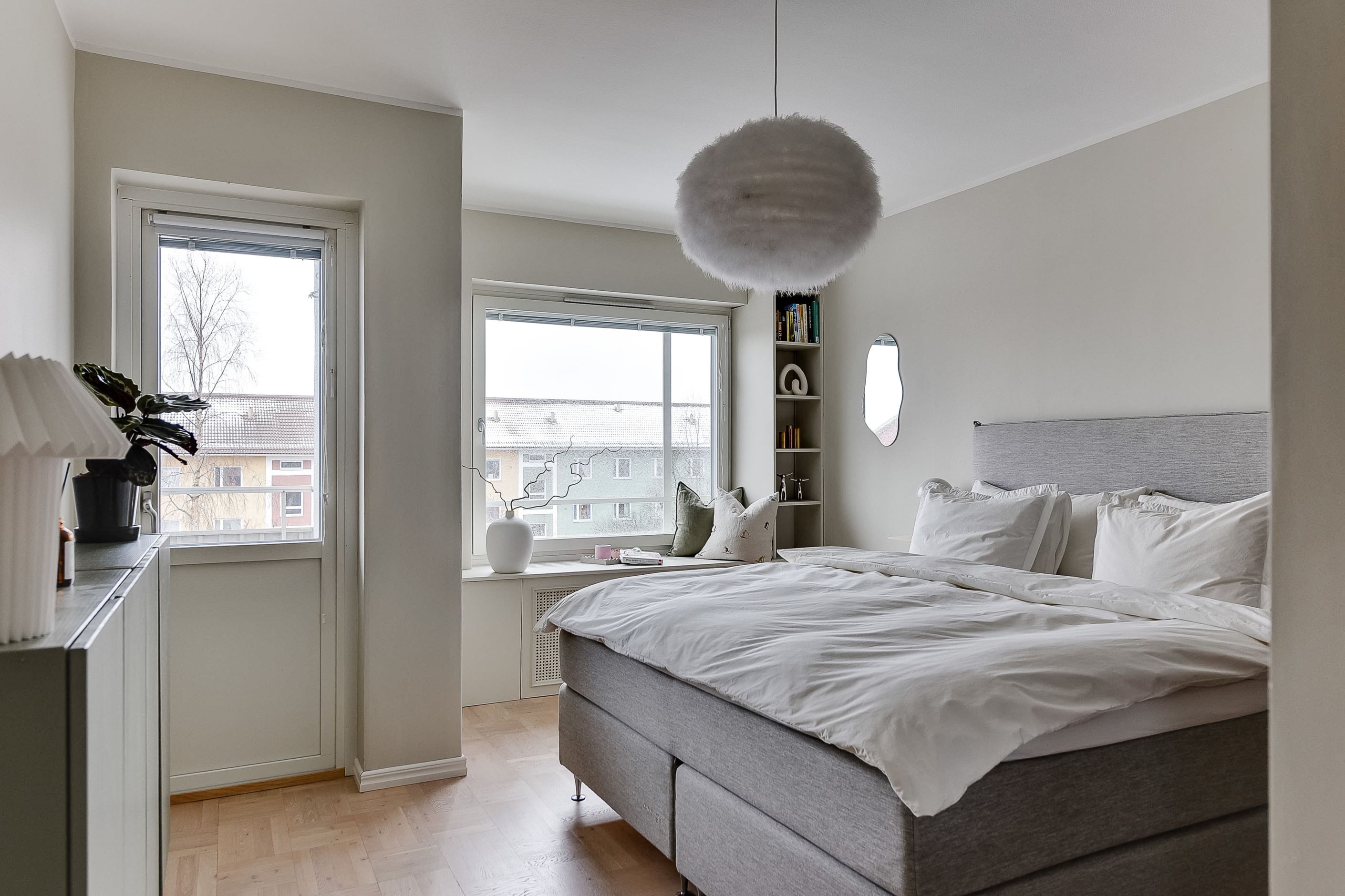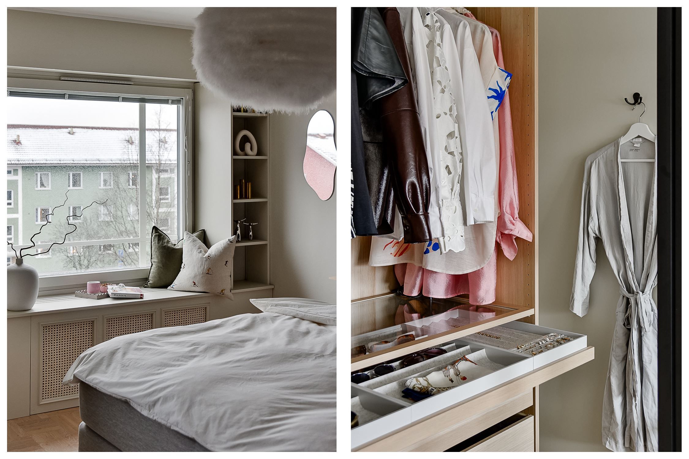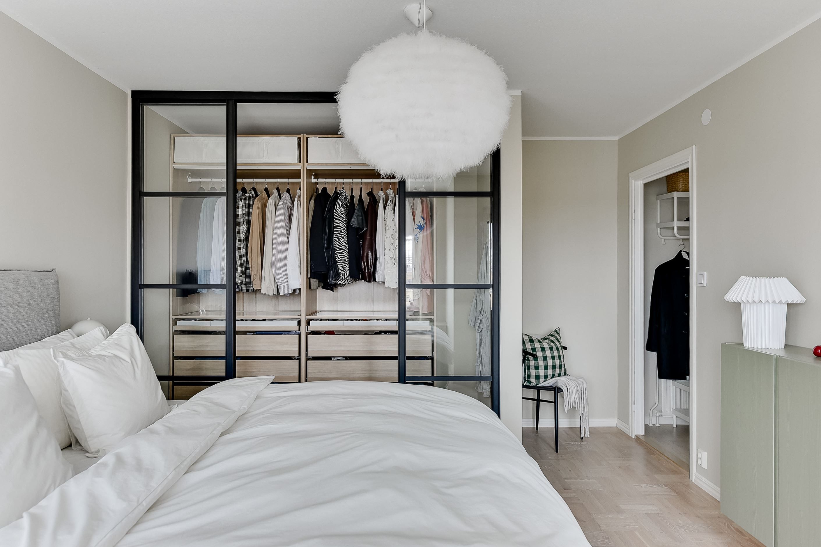 Sovrummet – tidigare bostadens vardagsrum – är en riktig pärla. Här möts du av ett vackert bevarat och vitlaserat originalparkettgolv, gott om plats för dubbelsäng och möbler samt en exklusiv garderobsvägg med industriella skjutdörrar som ger känslan av en egen walk-in-closet. Den platsbyggda sittbänken vid fönstret blir en naturlig avkopplingsplats och förstärker rummets rogivande atmosfär.