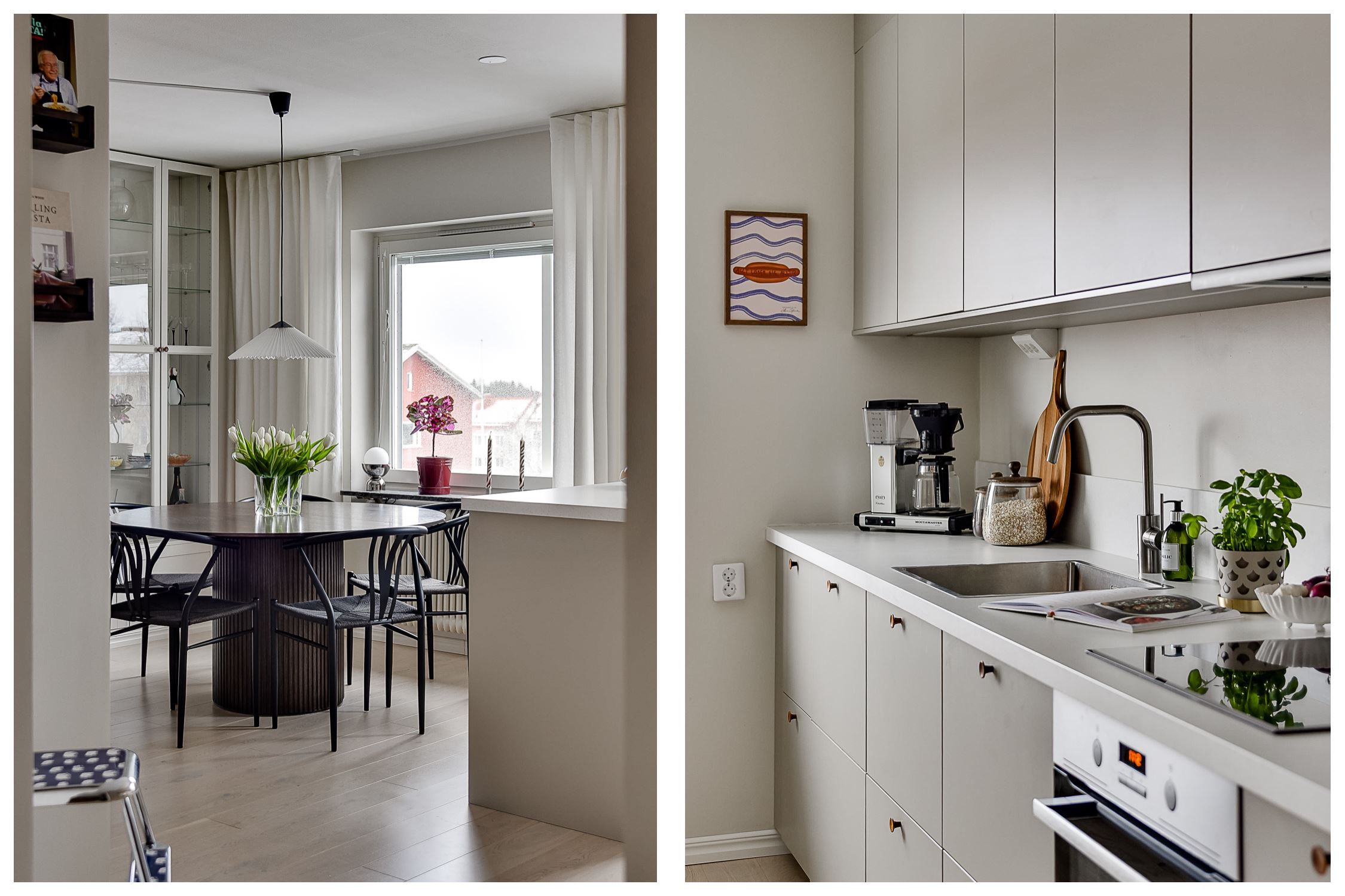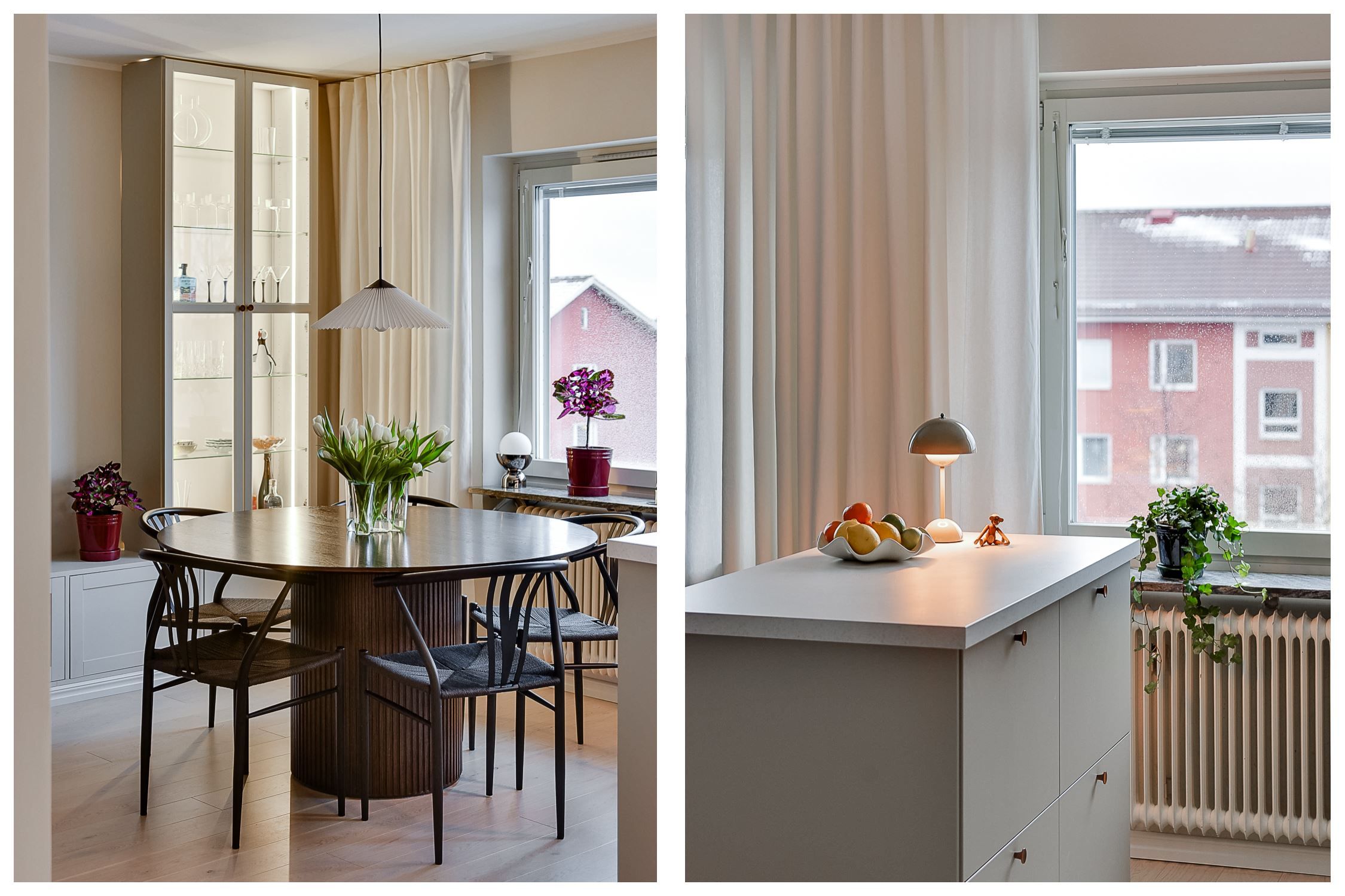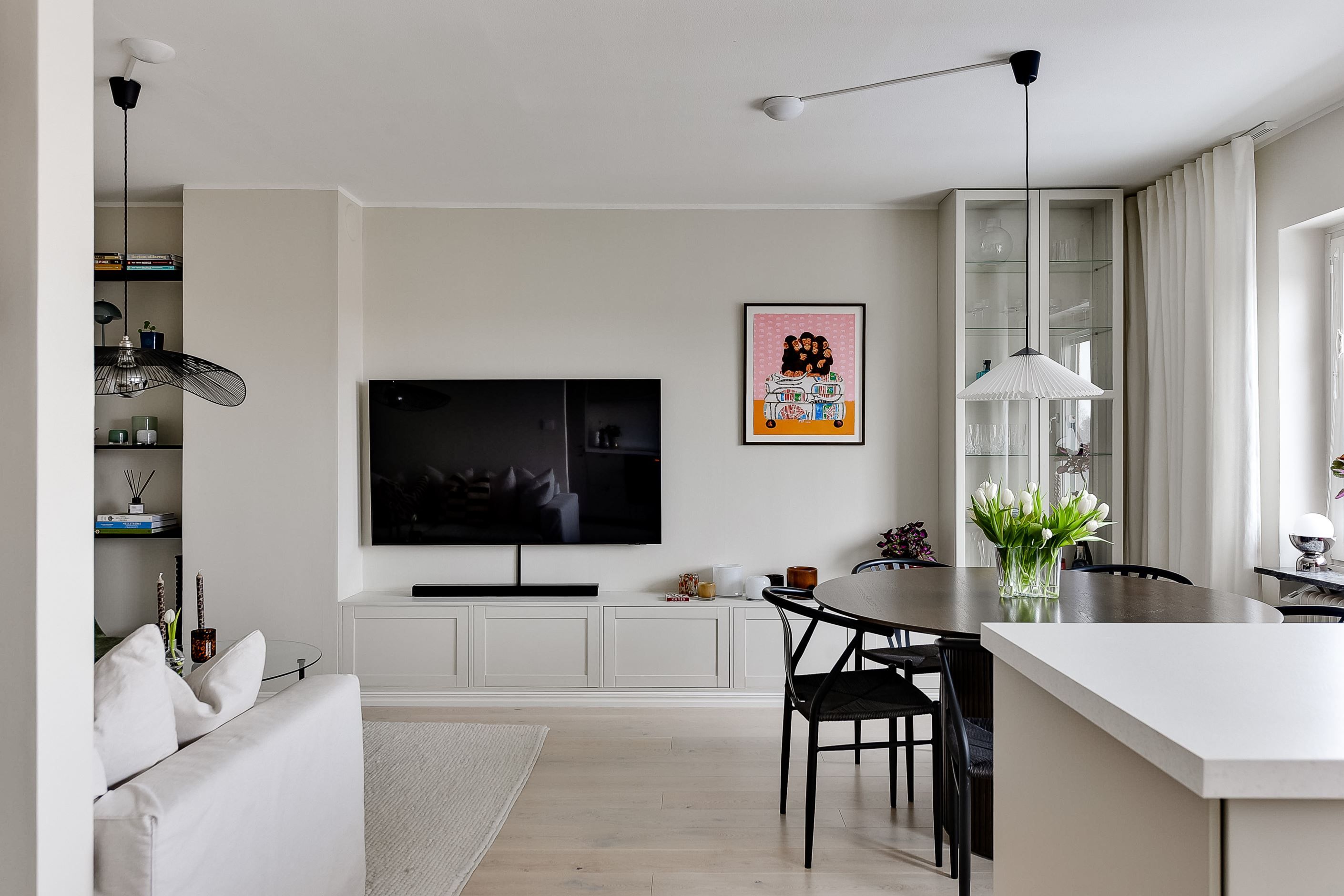 Matplats och vardagsrum flätas stilfullt samman, där platsbyggd TV-bänk och vitrinskåp skapar en unik karaktär och ger rummet en egen identitet. Här ryms såväl soffgrupp som läshörna för den som önskar en extra mysig detalj.